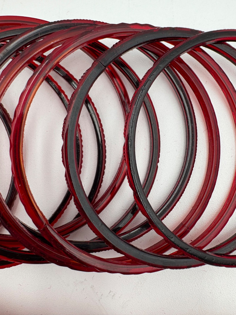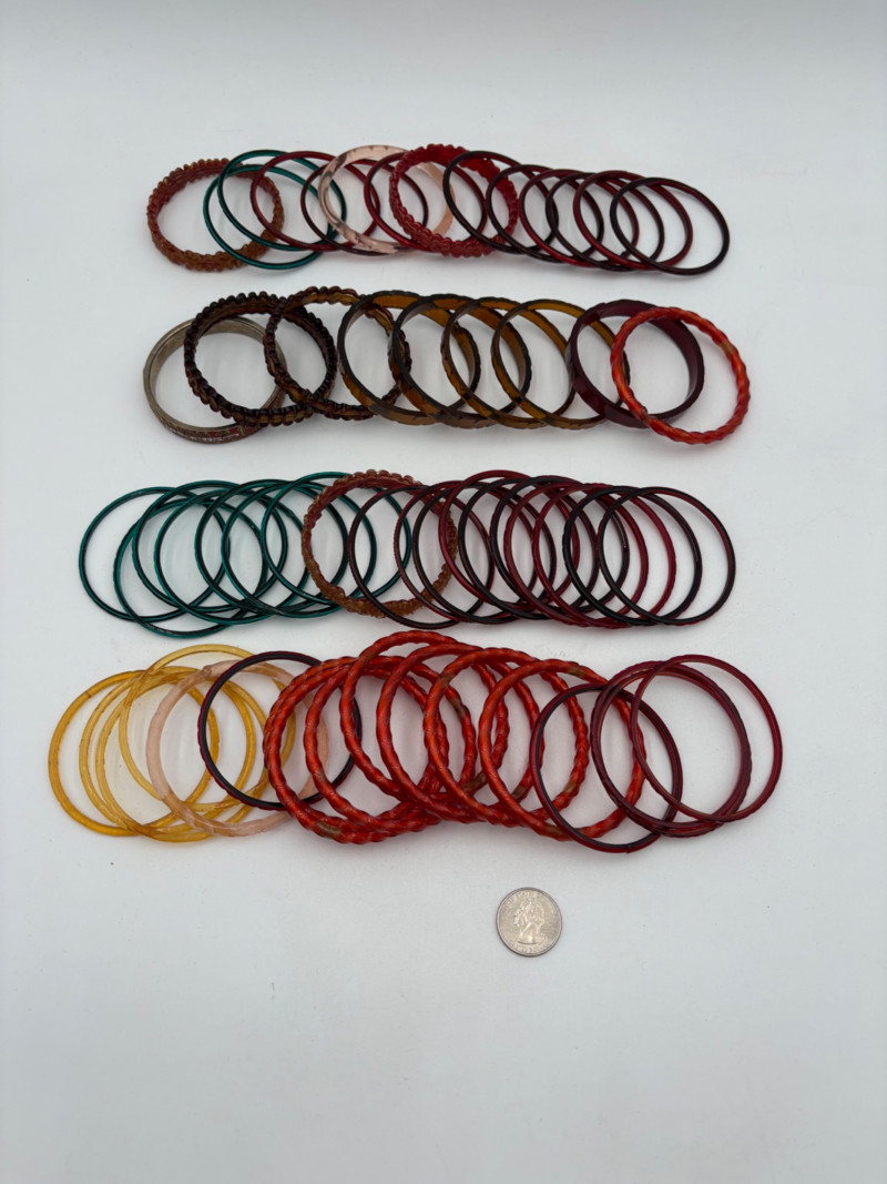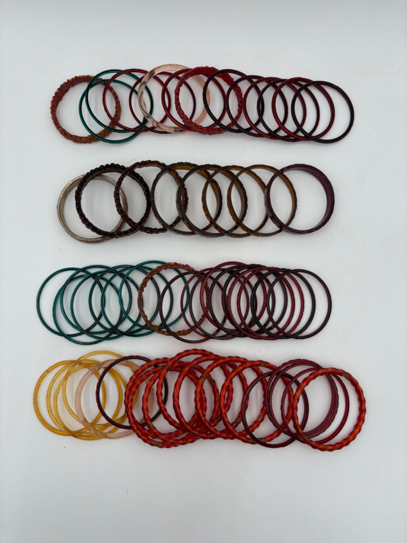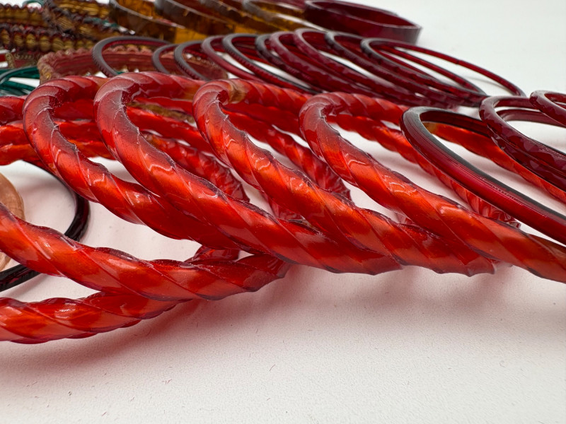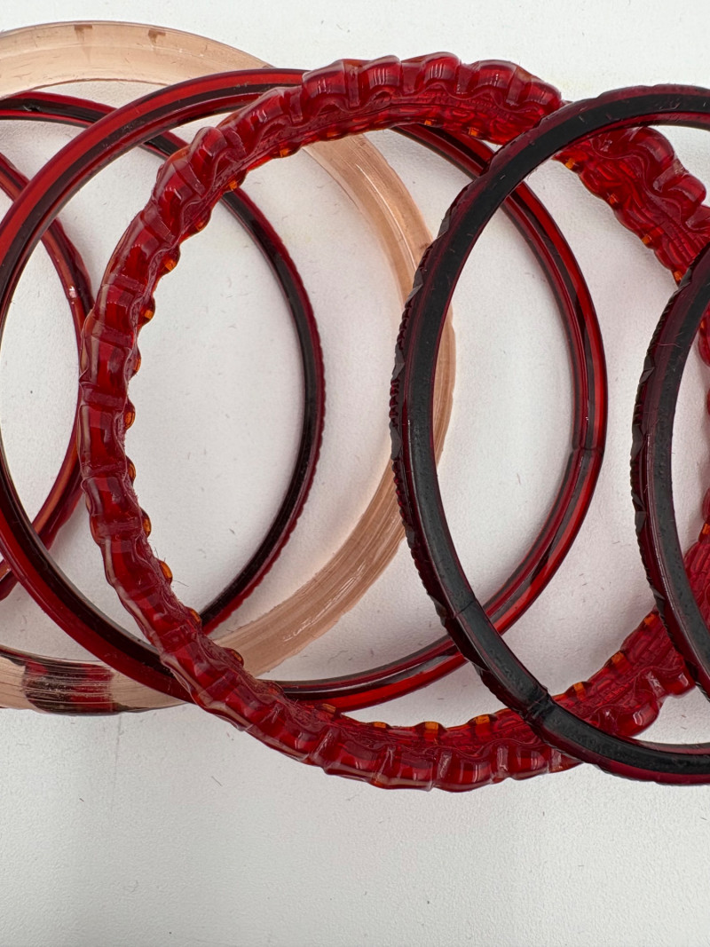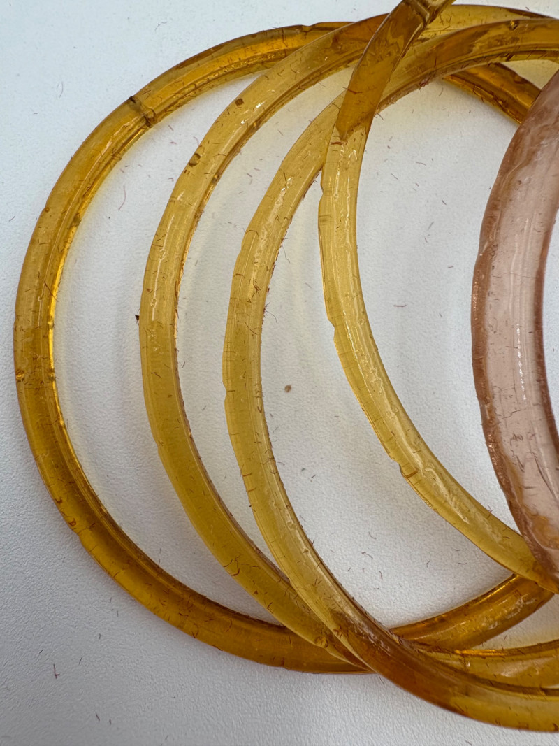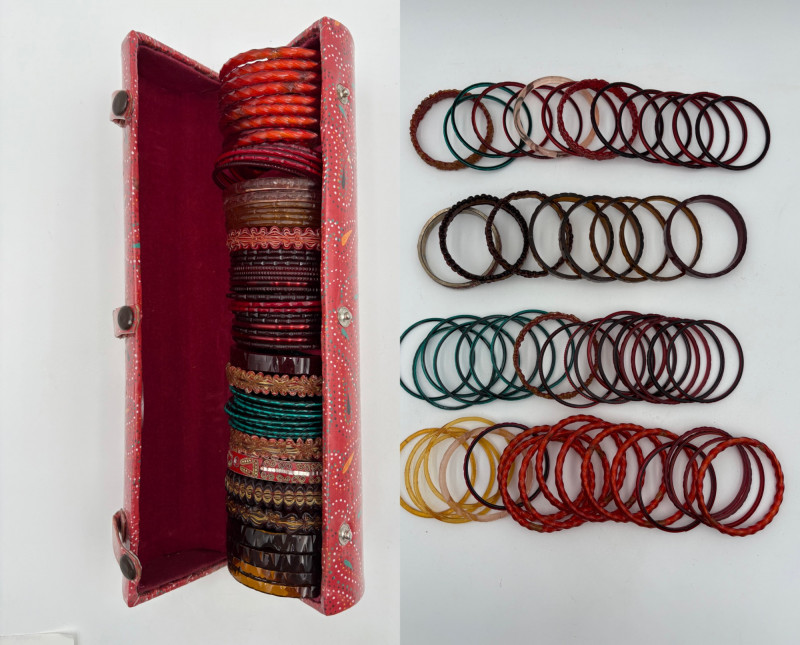 Delicate vintage glass bracelets from India. Client purchased them over 30 years ago while there. Please note that these are quite delicate and on the smaller side - all are the same size and slip over the hand. Comes with a red protective velvet case.