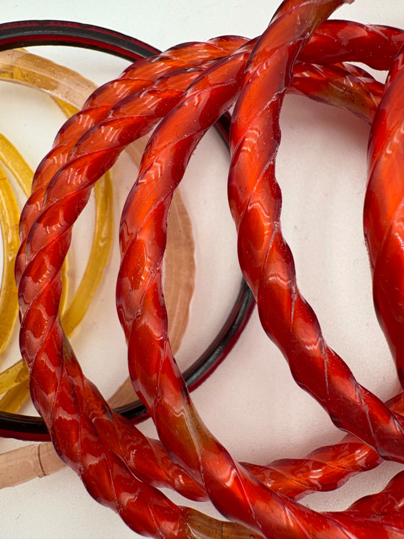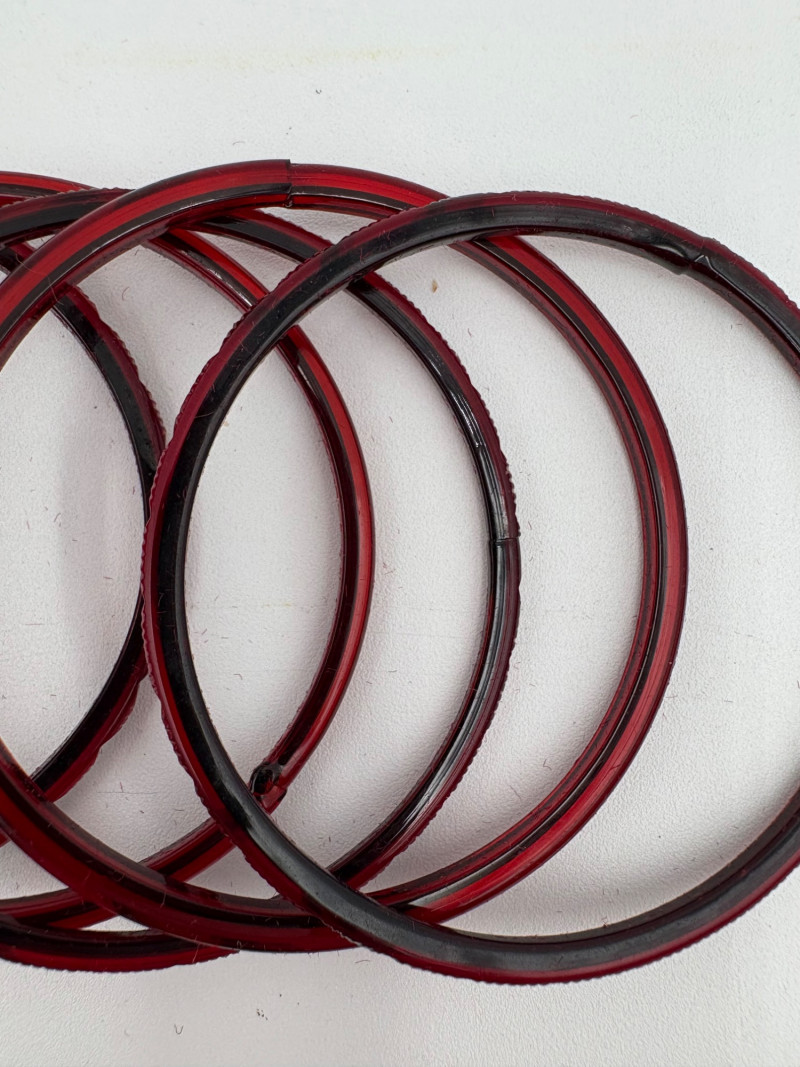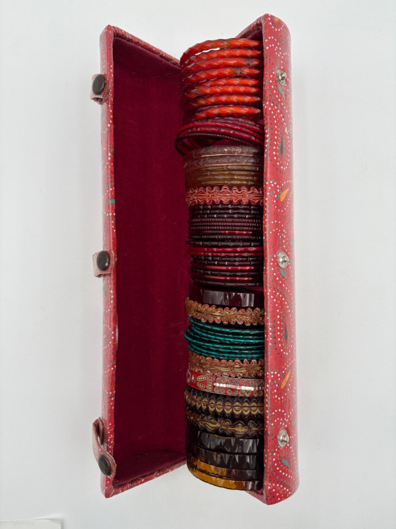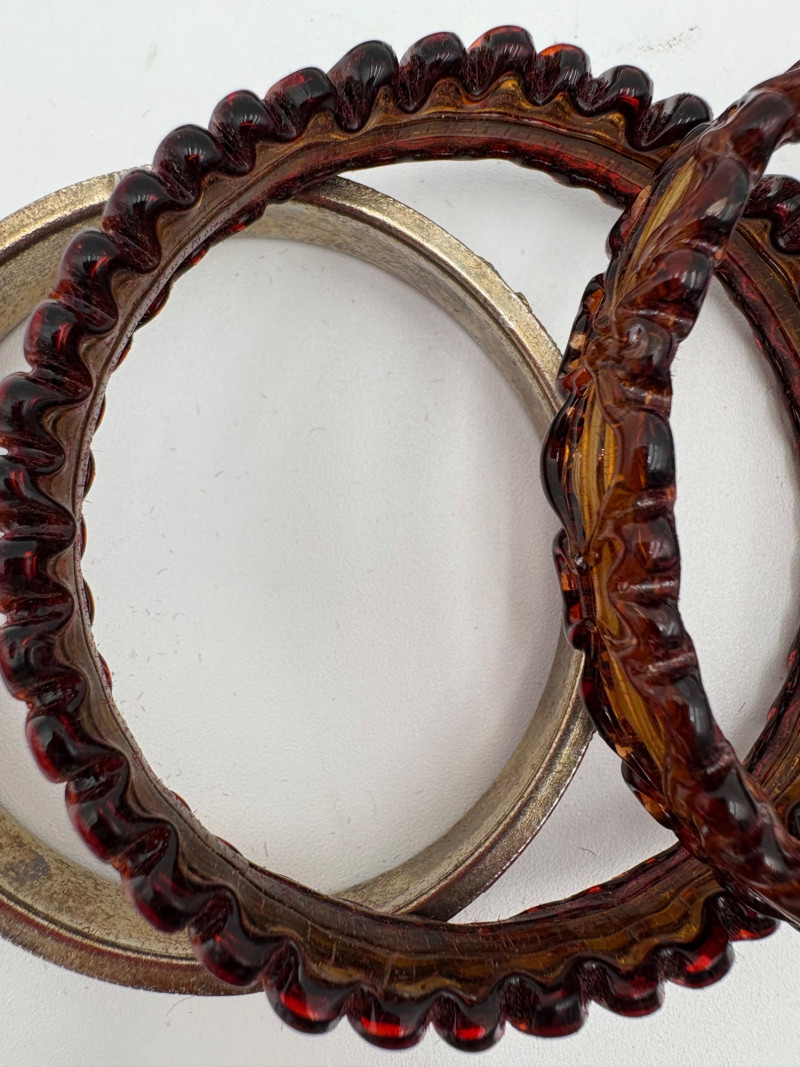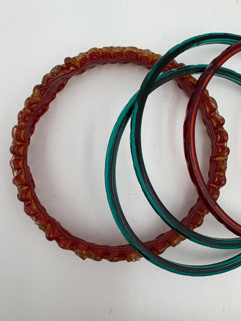 Delicate vintage glass bracelets from India. Client purchased them over 30 years ago while there. Please note that these are quite delicate and on the smaller side - all are the same size and slip over the hand. Comes with a red protective velvet case.