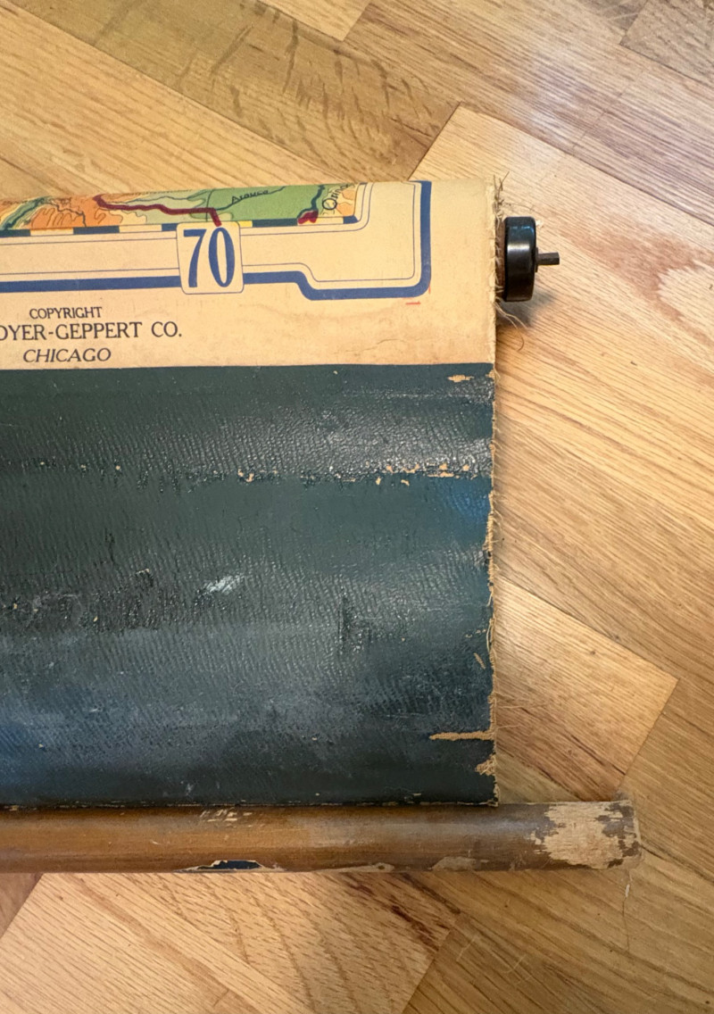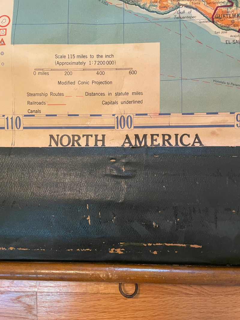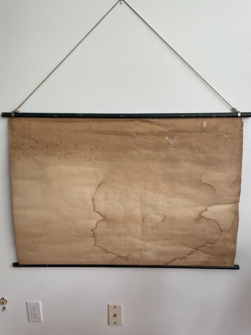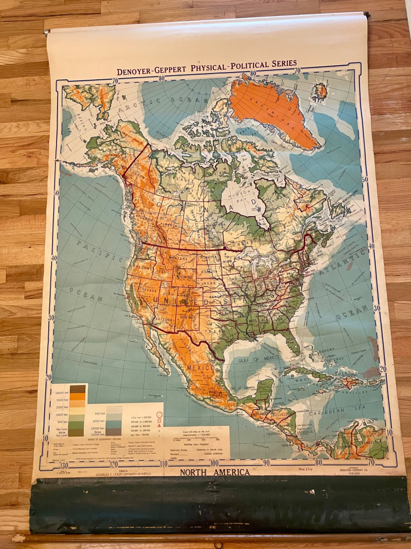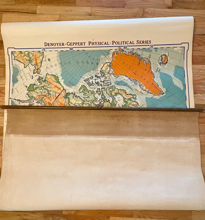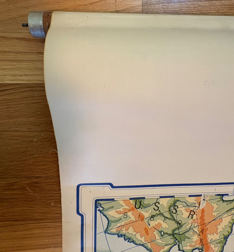 These antique schoolroom maps bring you right back to junior high school. The North American continent map we believe to be circa 1940s. The map itself is in very good vintage condition with only one major flaw above the word "physical". The lower section below the map is the most worn area as it served to protect the map when it was rolled up. Measures 67" H x 43" W. The Washington State map is circa 1930s and is in fair to poor shape with multiple repairs and taped sections However, it views cleanly and is a great conversation starter at almost 100 years old. Measures 28" H x 39.5" W.