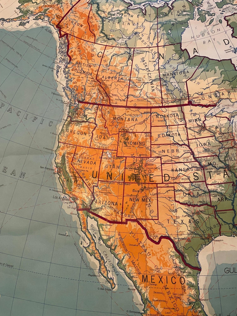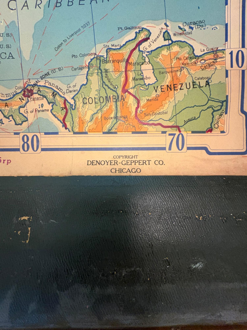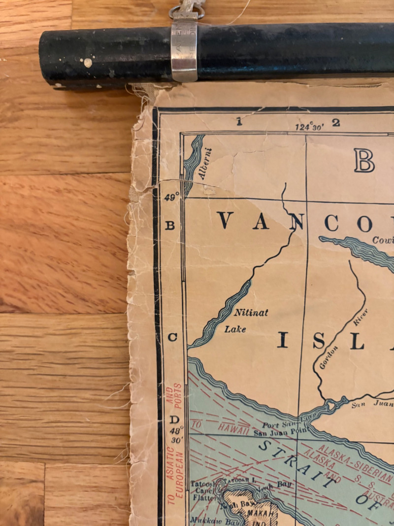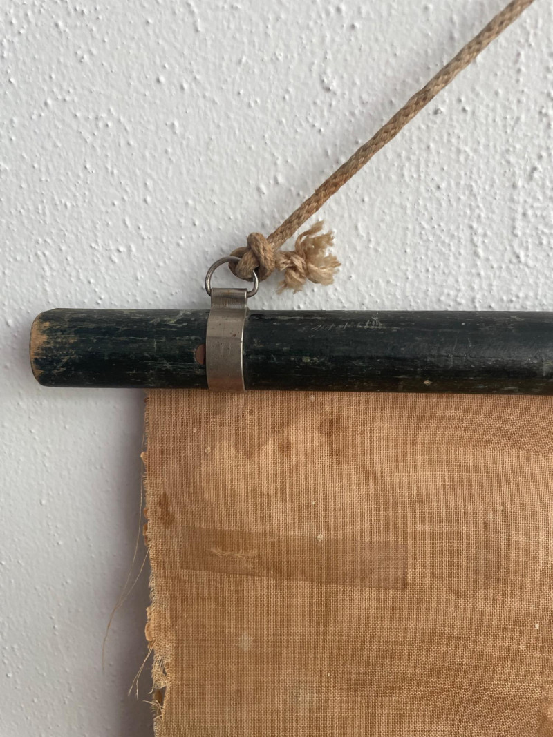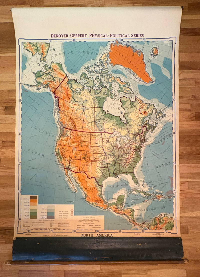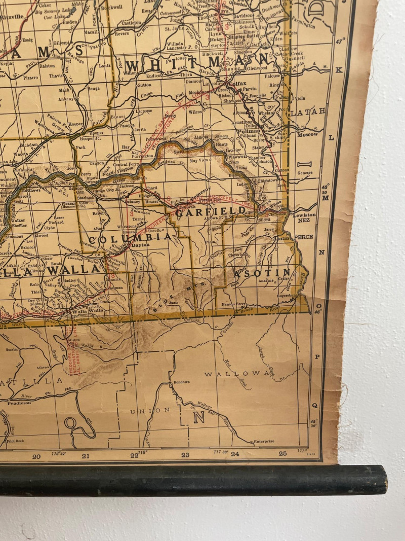 These antique schoolroom maps bring you right back to junior high school. The North American continent map we believe to be circa 1940s. The map itself is in very good vintage condition with only one major flaw above the word "physical". The lower section below the map is the most worn area as it served to protect the map when it was rolled up. Measures 67" H x 43" W. The Washington State map is circa 1930s and is in fair to poor shape with multiple repairs and taped sections However, it views cleanly and is a great conversation starter at almost 100 years old. Measures 28" H x 39.5" W.