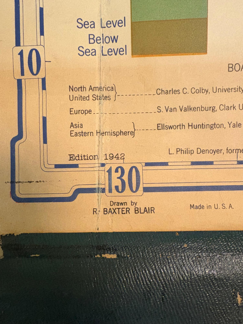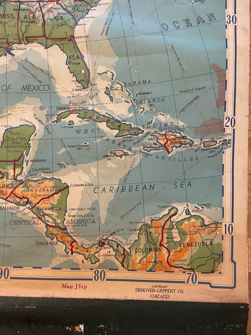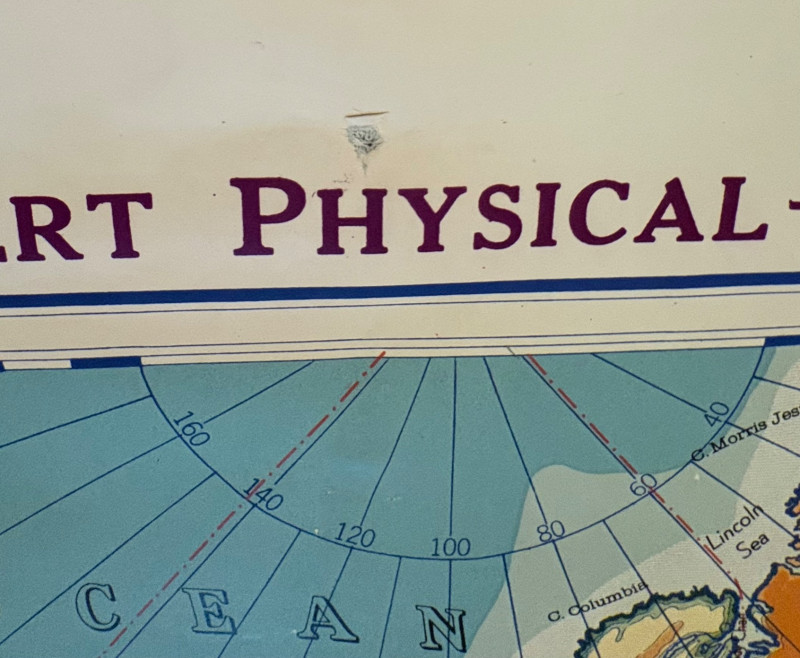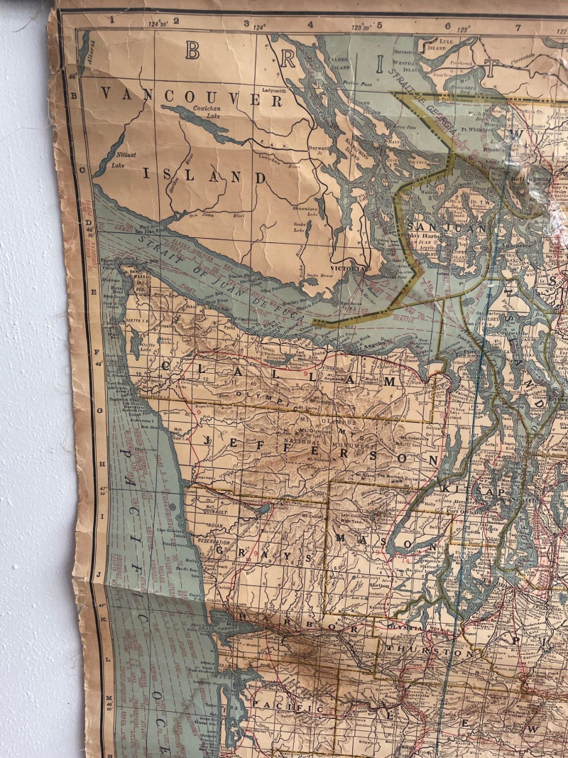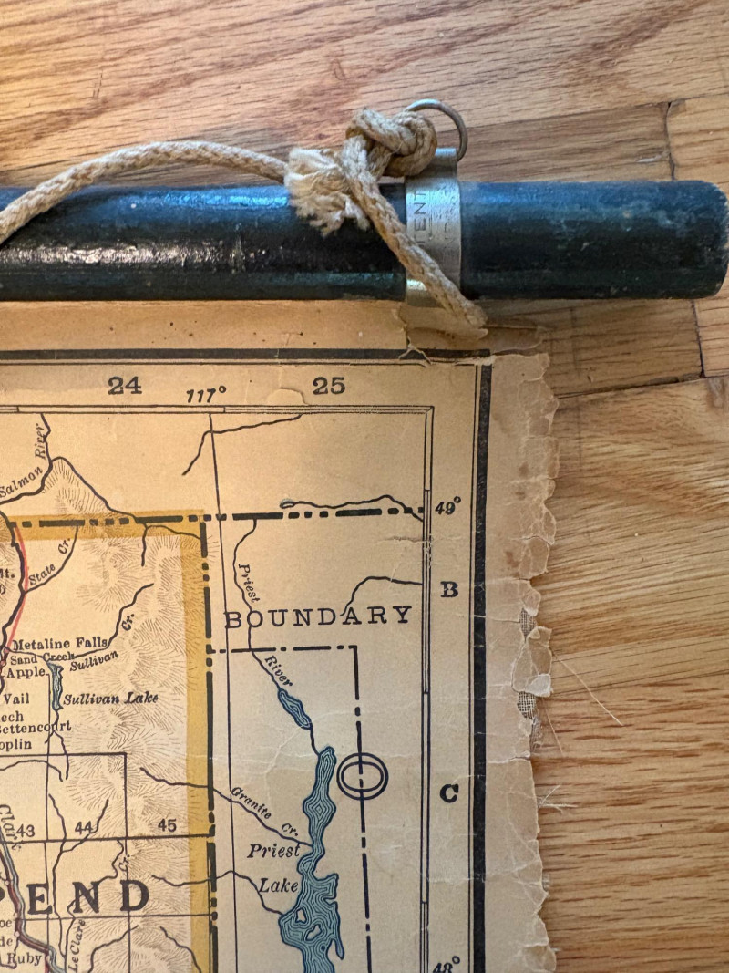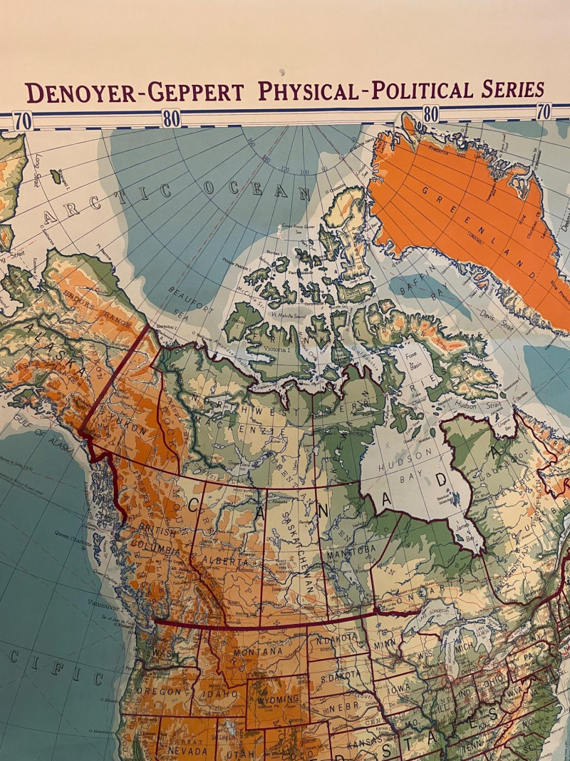These antique schoolroom maps bring you right back to junior high school. The North American continent map we believe to be circa 1940s. The map itself is in very good vintage condition with only one major flaw above the word "physical". The lower section below the map is the most worn area as it served to protect the map when it was rolled up. Measures 67" H x 43" W. The Washington State map is circa 1930s and is in fair to poor shape with multiple repairs and taped sections However, it views cleanly and is a great conversation starter at almost 100 years old. Measures 28" H x 39.5" W.