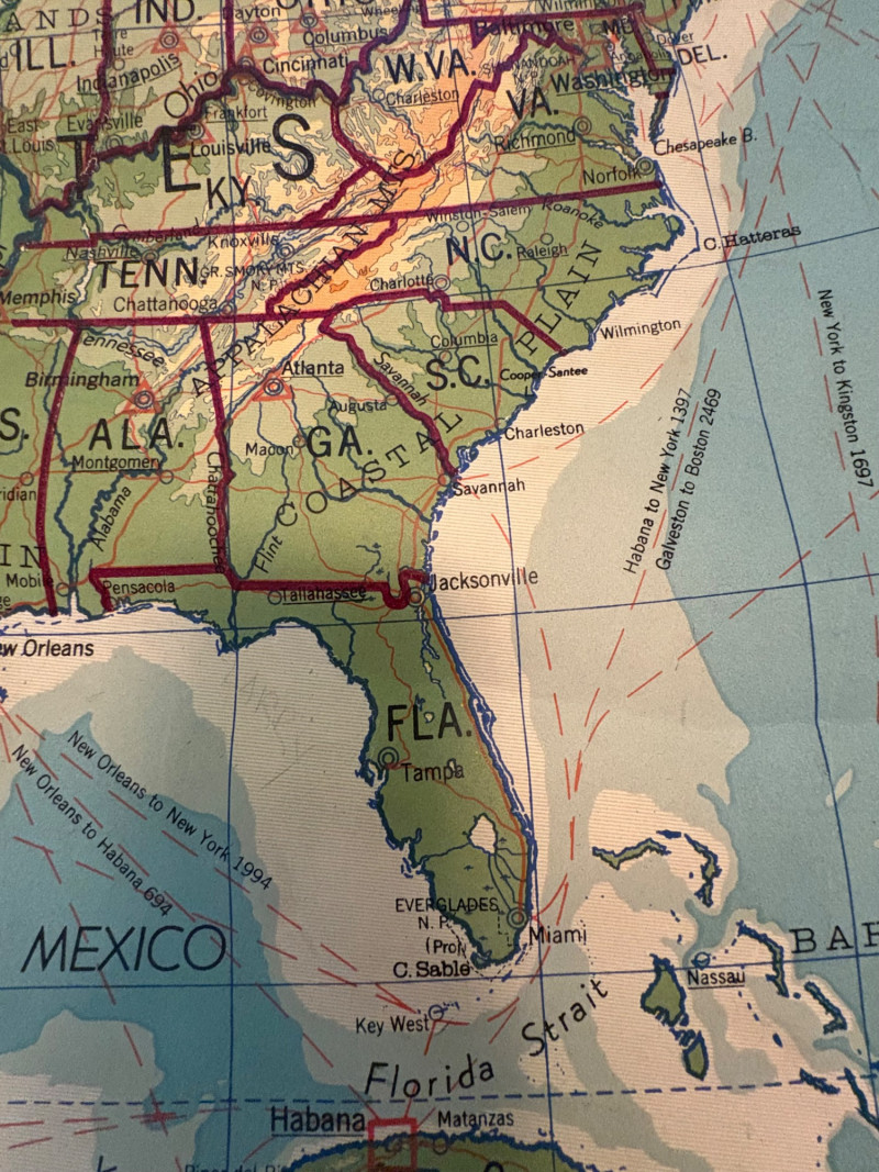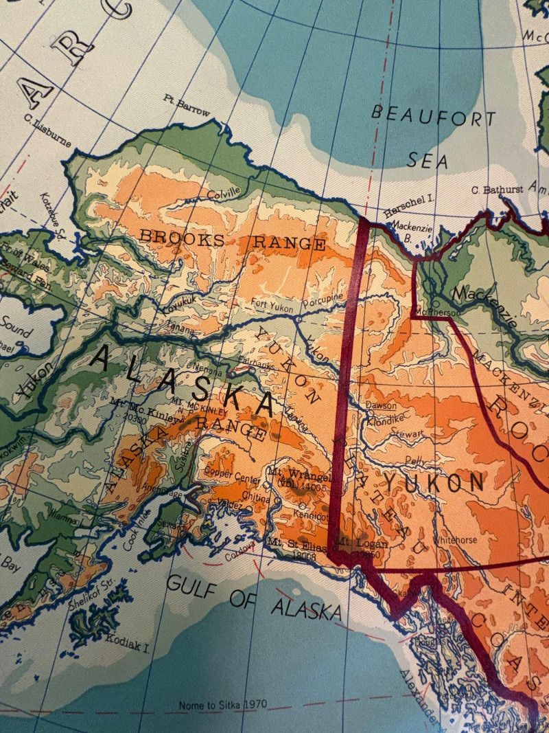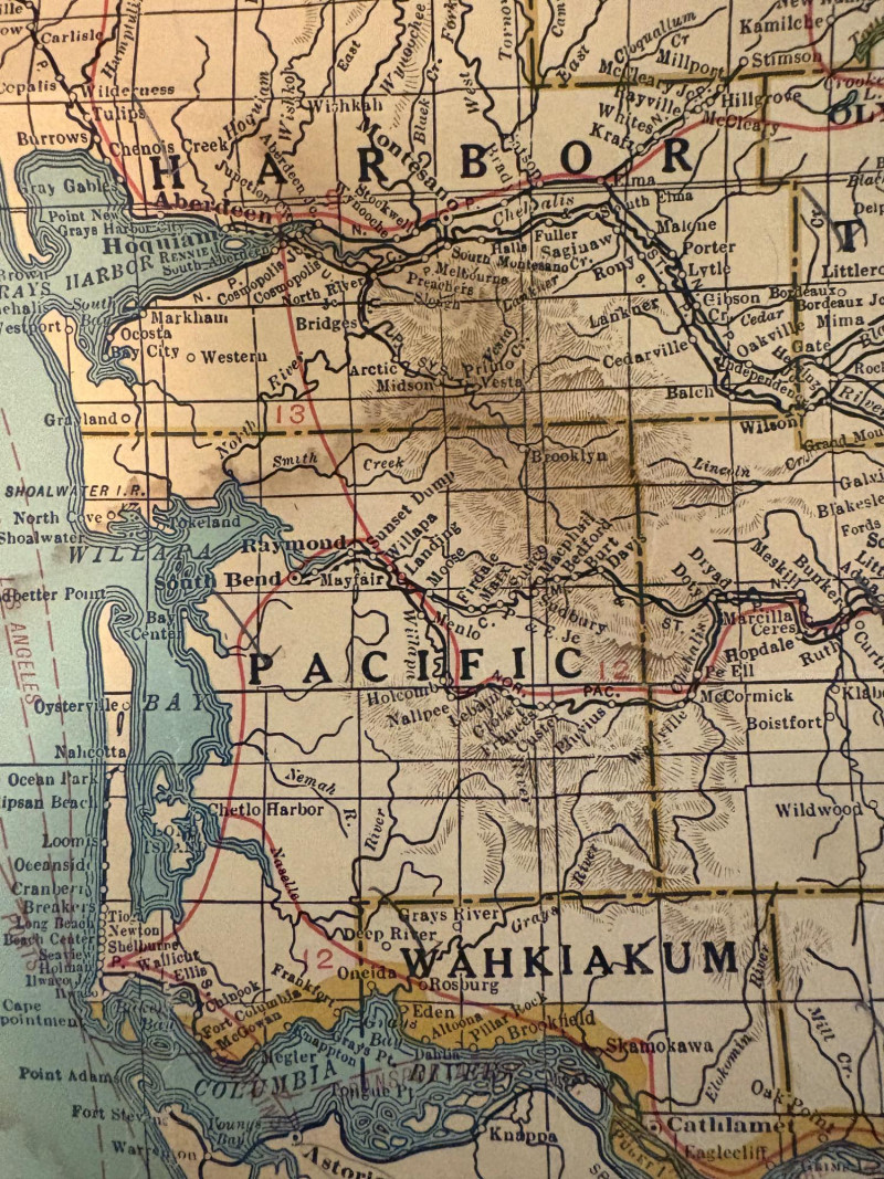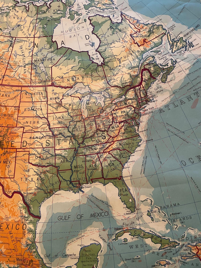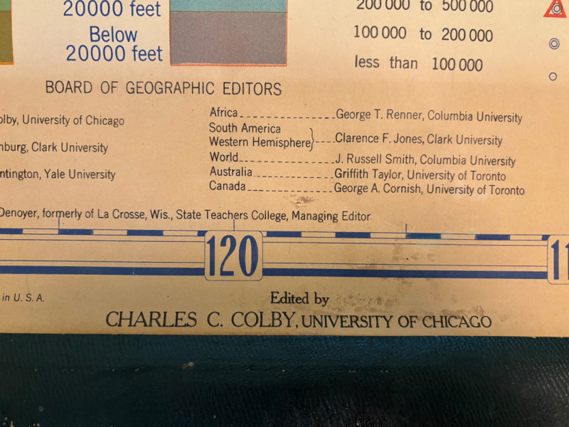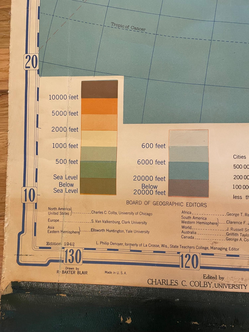 These antique schoolroom maps bring you right back to junior high school. The North American continent map we believe to be circa 1940s. The map itself is in very good vintage condition with only one major flaw above the word "physical". The lower section below the map is the most worn area as it served to protect the map when it was rolled up. Measures 67" H x 43" W. The Washington State map is circa 1930s and is in fair to poor shape with multiple repairs and taped sections However, it views cleanly and is a great conversation starter at almost 100 years old. Measures 28" H x 39.5" W.