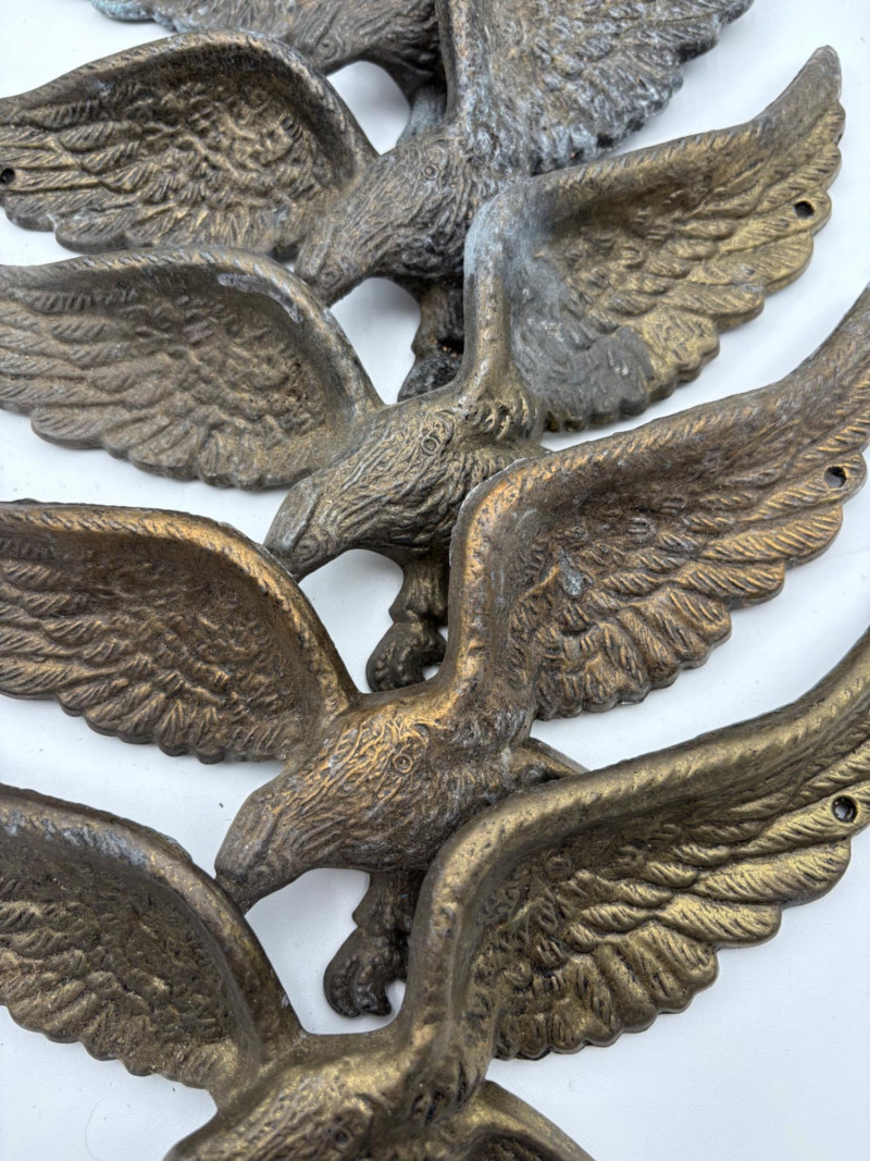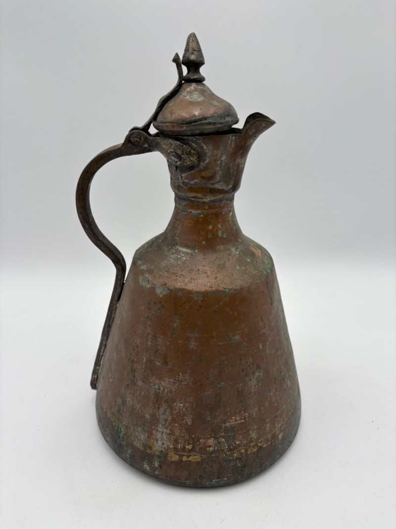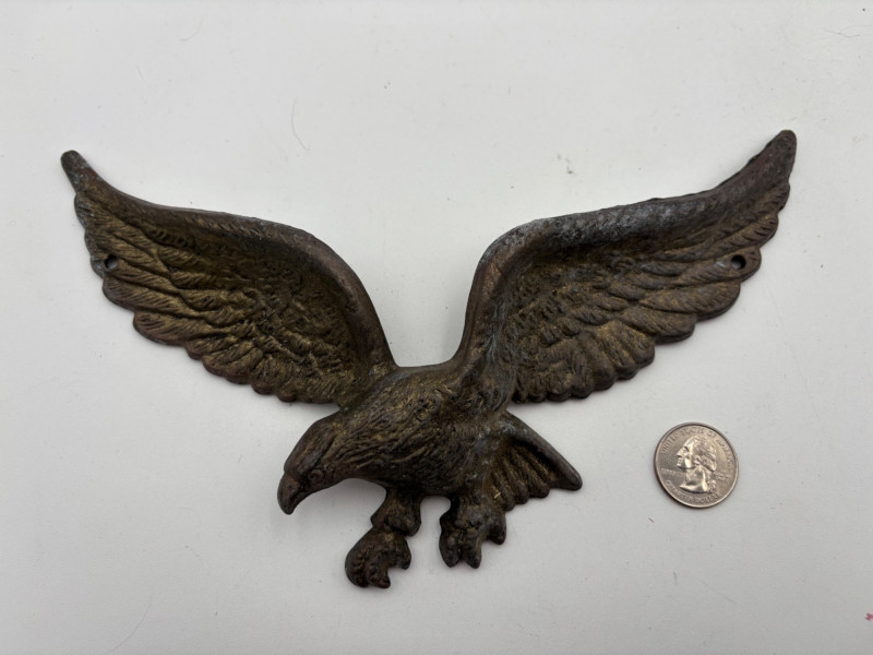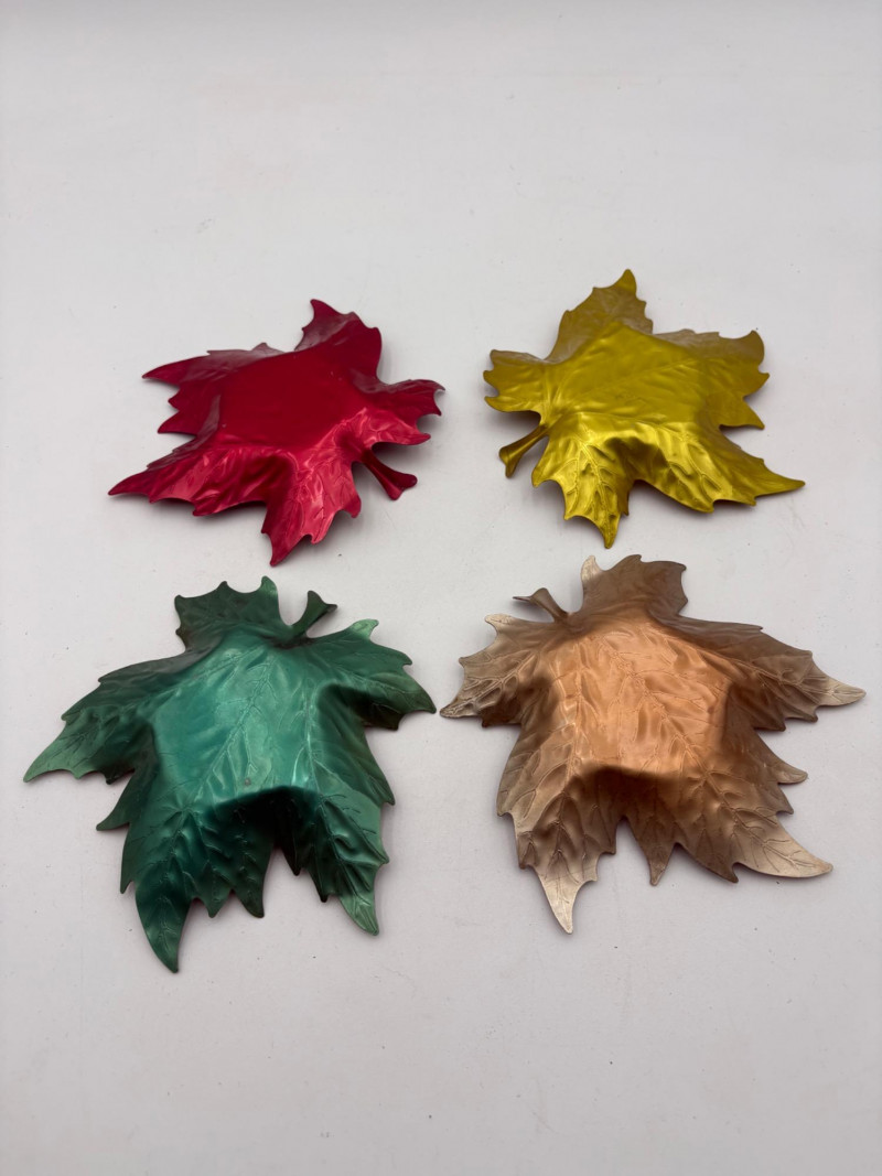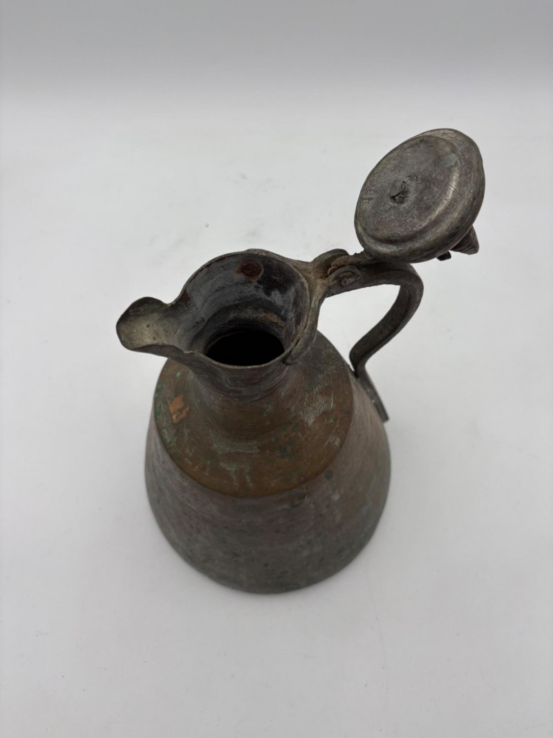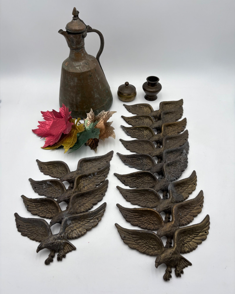 Antique & vintage items in various metals Antique hand-made pitcher in brass/copper with weighted lid, handle, and single sheet shaped body. Client is unsure of age, but her father purchased it in an antique gallery in Istanbul, Turkey, in the early 1970s. Lovely lines and patina of age. Measures 13" H x 9" diameter. Set of 4 maple leaf candy/nut holders in thin metal. Client says her grandmother used these for many bridge parties in the 1960s, but believes they may be a bit older than that. Measure approx. 6" across. Two small brass containers - one with lid - in classic design. See photos for details. Lidless one measures 3" H. lidded measures 2.5" H. Large group (13) of cast brass eagles with mounting holes on wings. Client purchased for an art project, but stashed them away and forgot about them. Measure 6" H x 9" wingtip to wingtip. Have a nice aged patina, but could be polished up if you so desire.