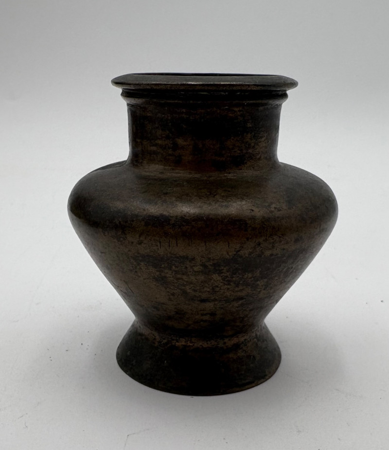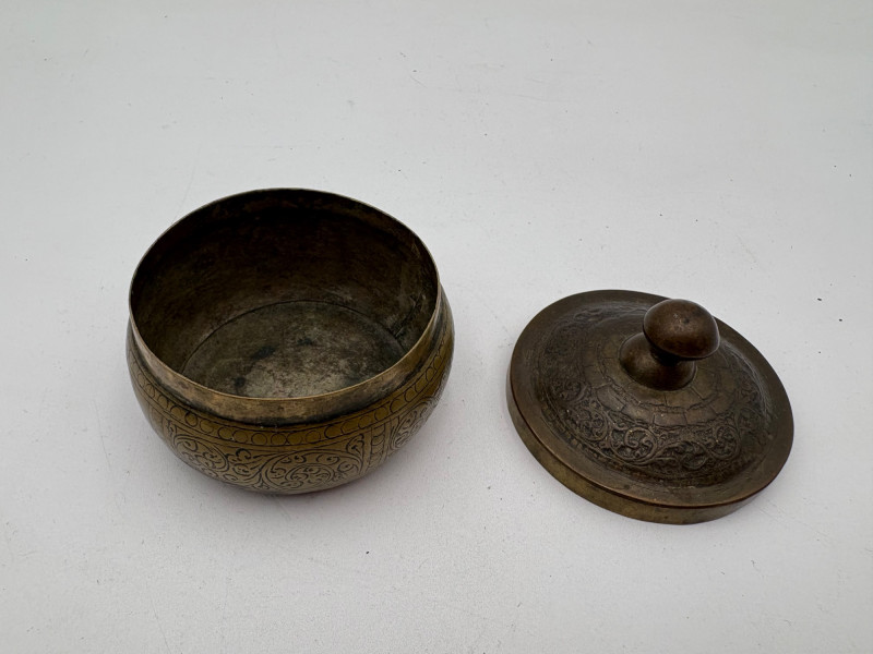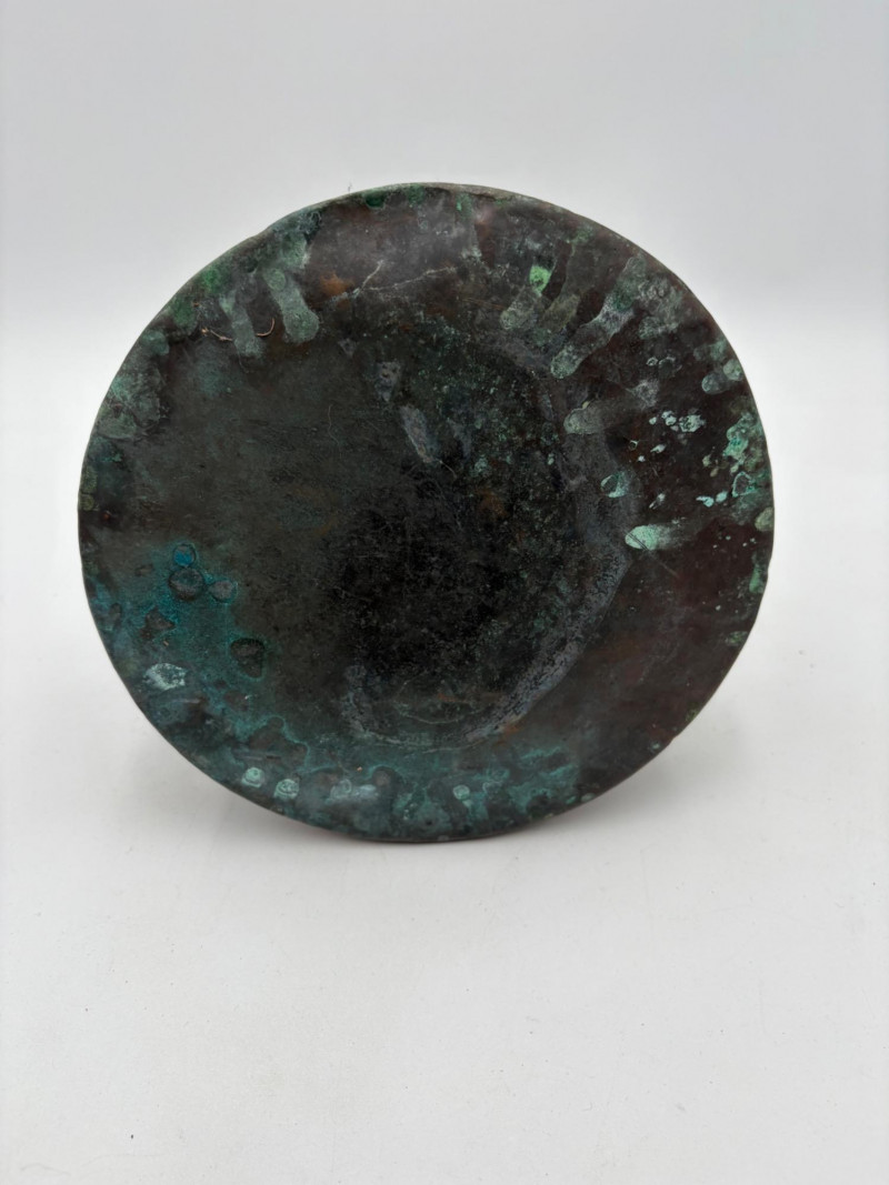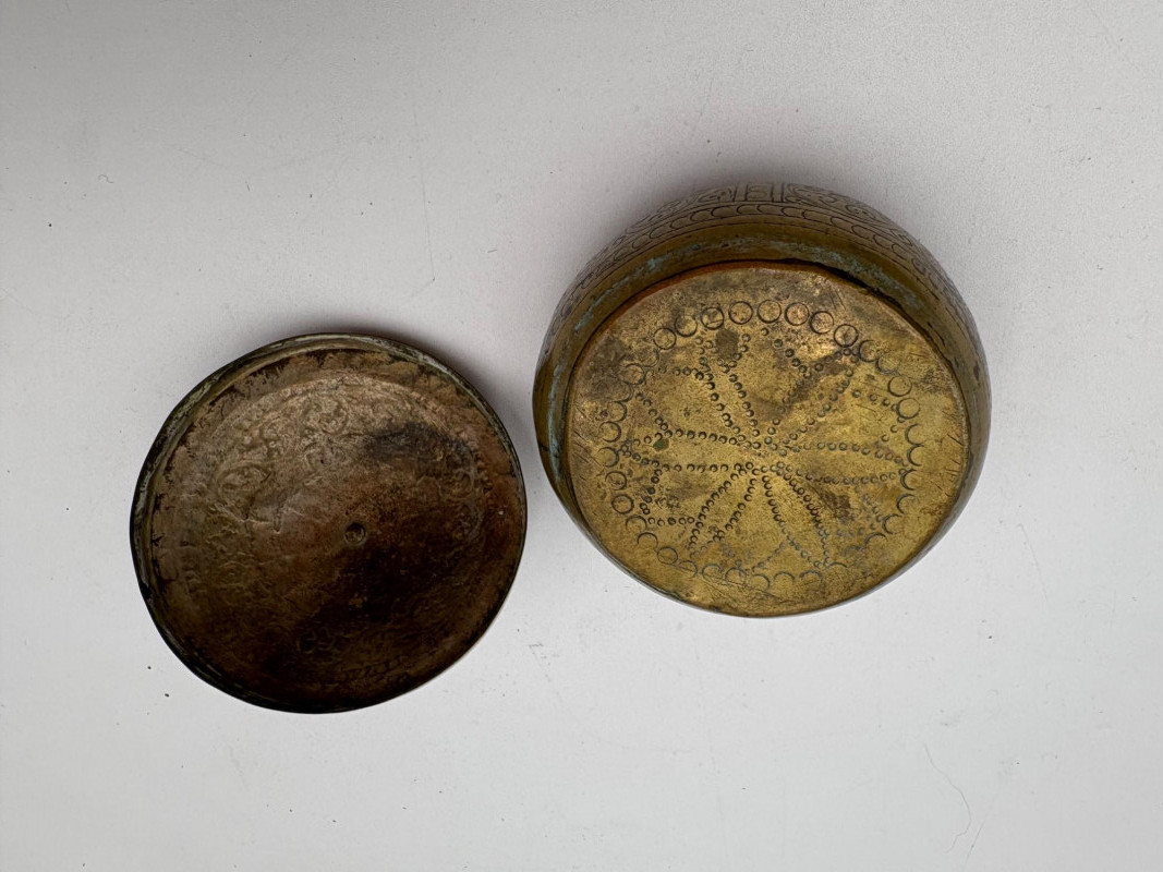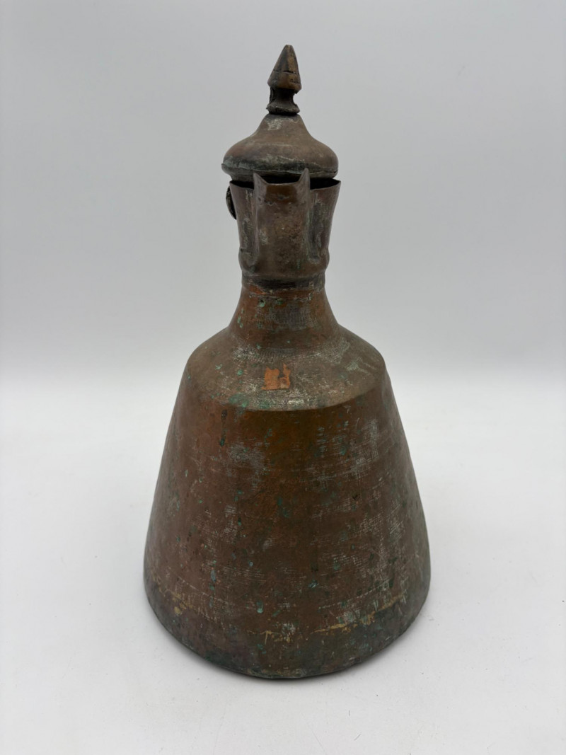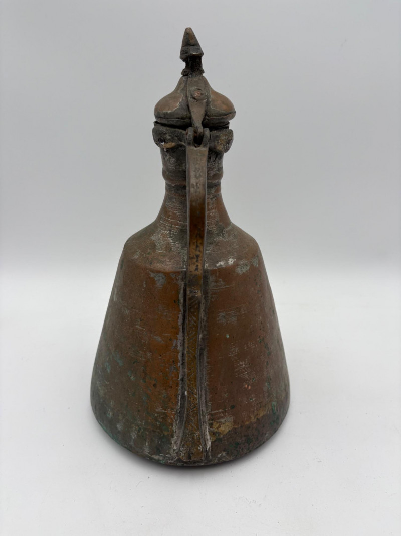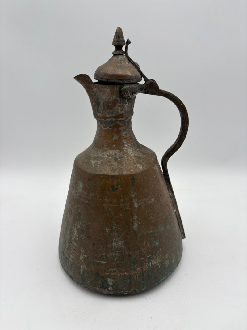 Antique & vintage items in various metals Antique hand-made pitcher in brass/copper with weighted lid, handle, and single sheet shaped body. Client is unsure of age, but her father purchased it in an antique gallery in Istanbul, Turkey, in the early 1970s. Lovely lines and patina of age. Measures 13" H x 9" diameter. Set of 4 maple leaf candy/nut holders in thin metal. Client says her grandmother used these for many bridge parties in the 1960s, but believes they may be a bit older than that. Measure approx. 6" across. Two small brass containers - one with lid - in classic design. See photos for details. Lidless one measures 3" H. lidded measures 2.5" H. Large group (13) of cast brass eagles with mounting holes on wings. Client purchased for an art project, but stashed them away and forgot about them. Measure 6" H x 9" wingtip to wingtip. Have a nice aged patina, but could be polished up if you so desire.
