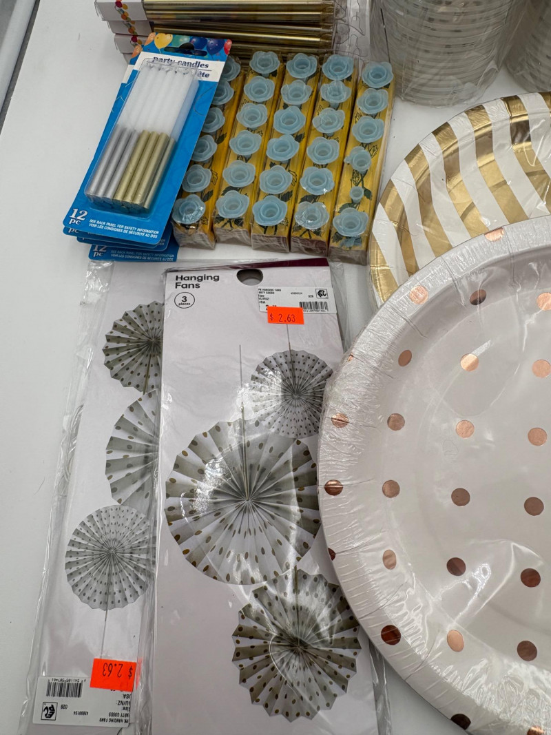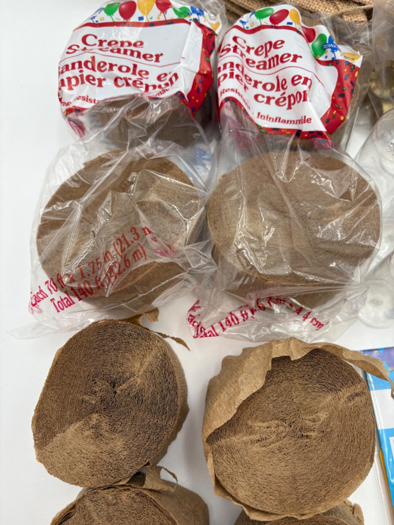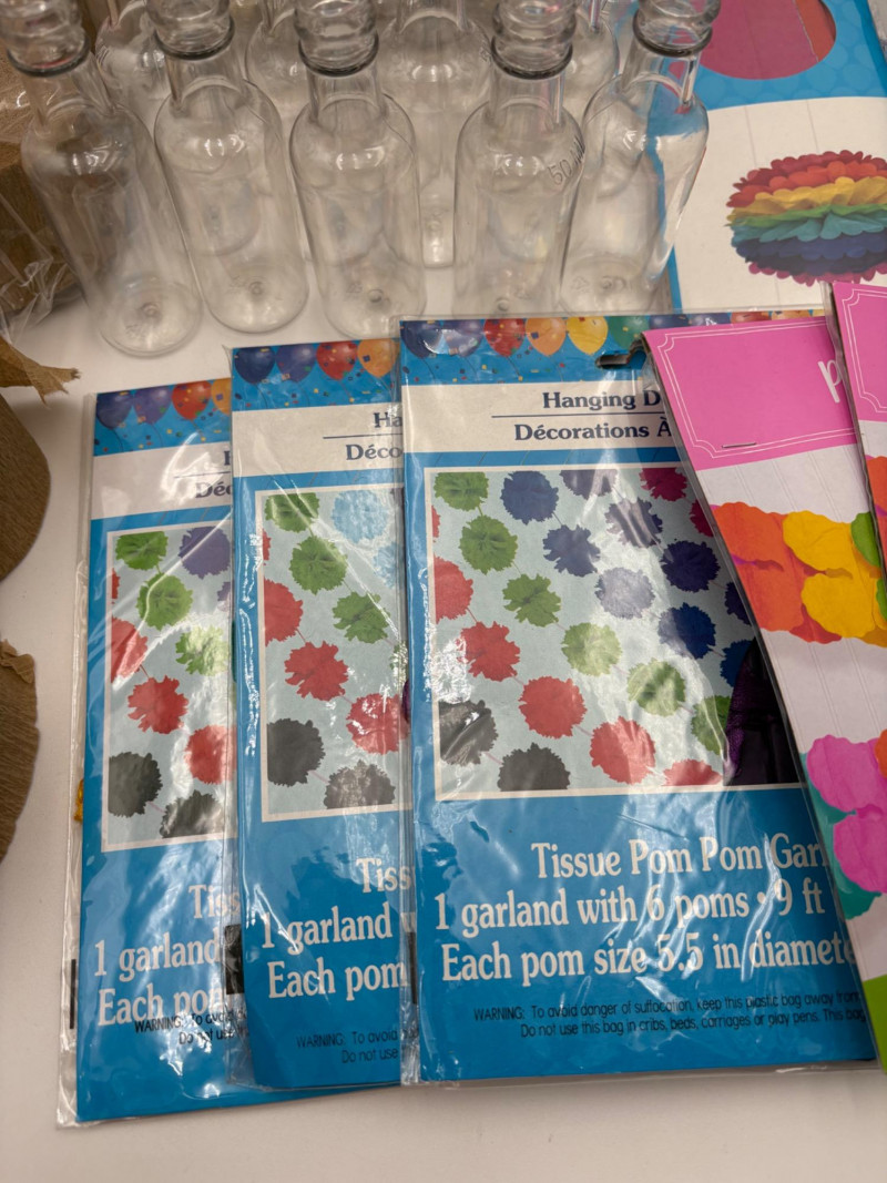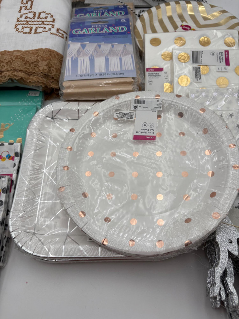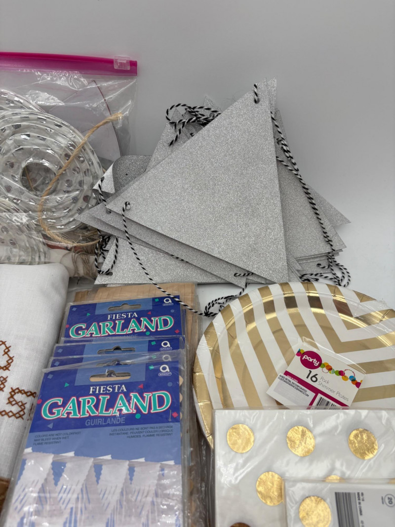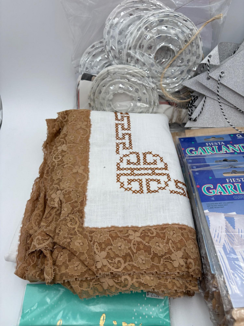 Lots & lots of party supplies! Tablecloths, napkins, paper plates, banners/bunting, bottles, crepe paper, tinsel (6 meter lengths - 10 in gold and 12 in silver), vintage & modern cake candles and candleholders, cups, and garlands. Also included - last 2 photos - is yards and yards of hand-strung rice paper disks to suspend across the ceiling in a large reception room. You will note that there is some soil from storage, but client says when unrolled and hung, it will not be noticeable.