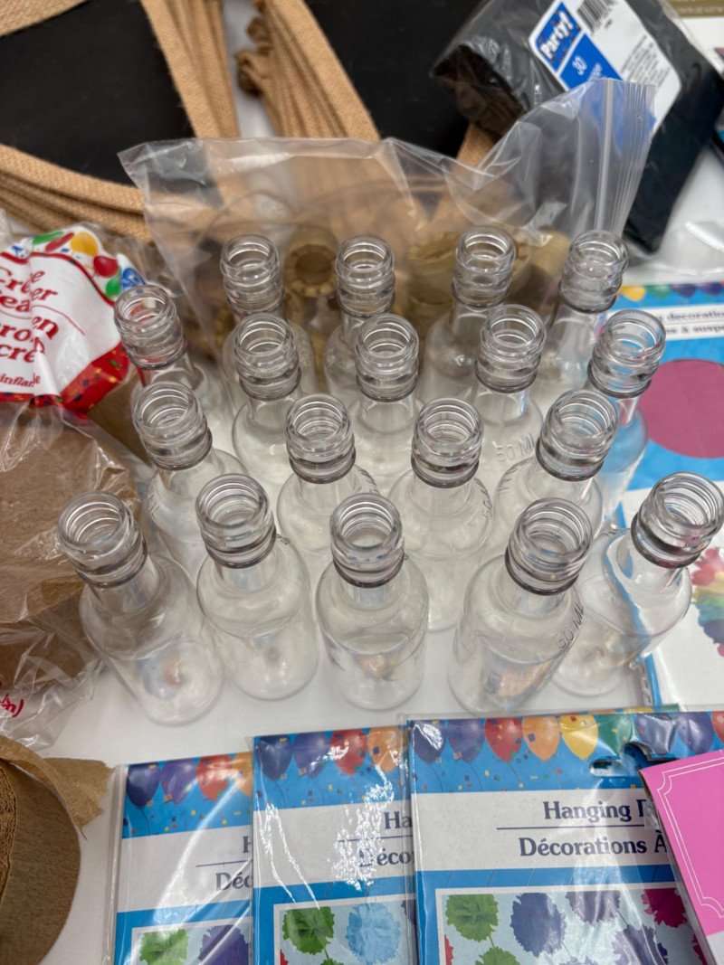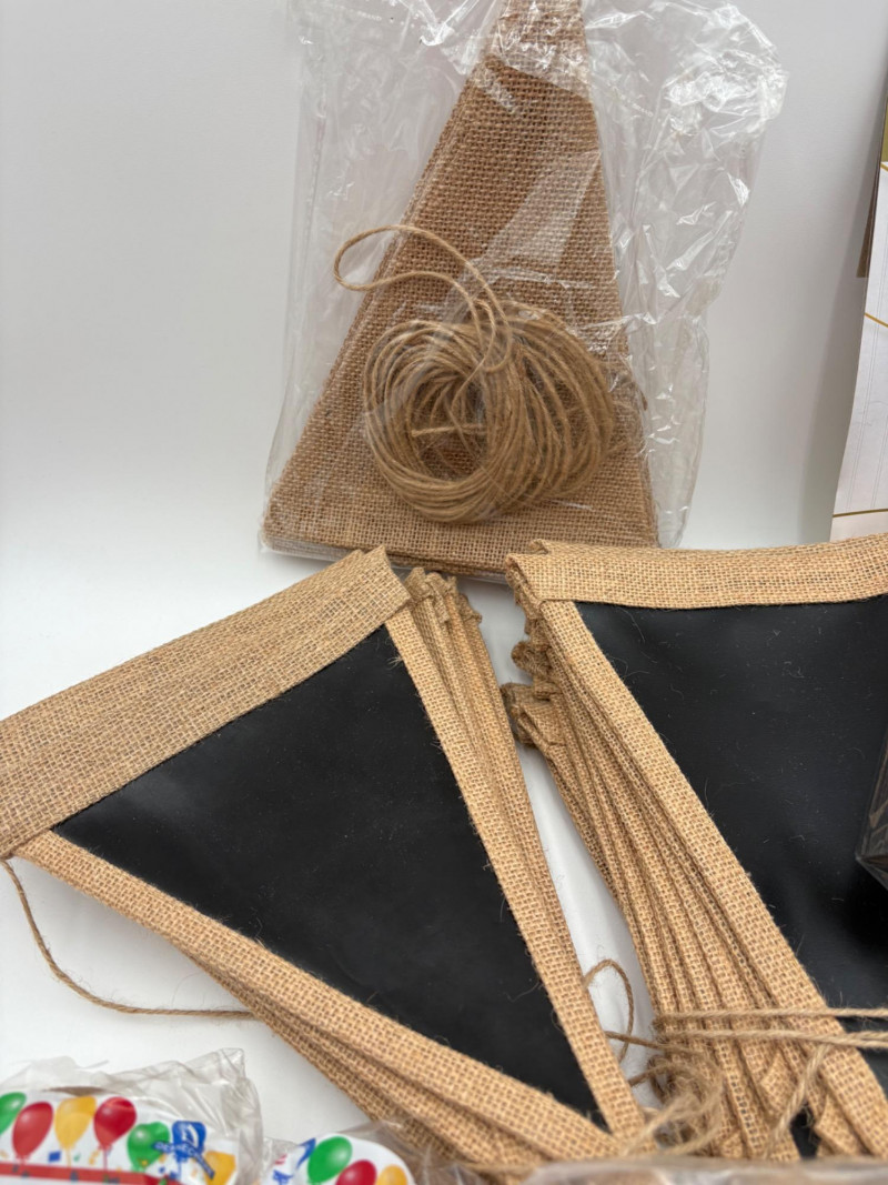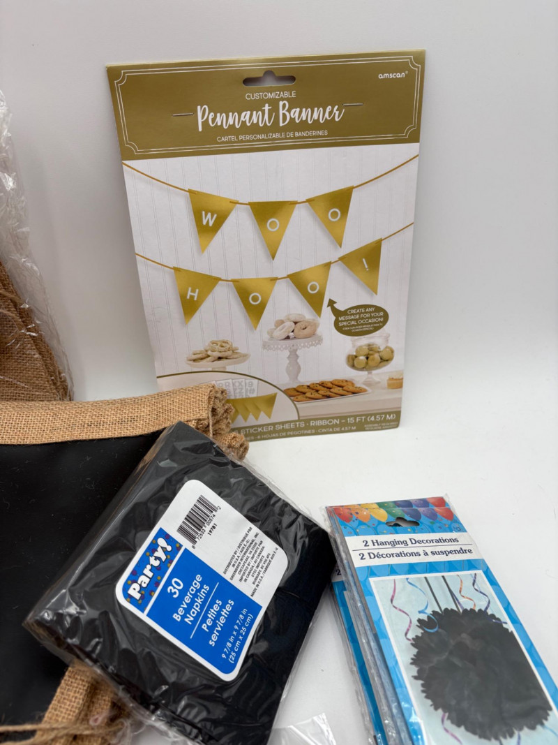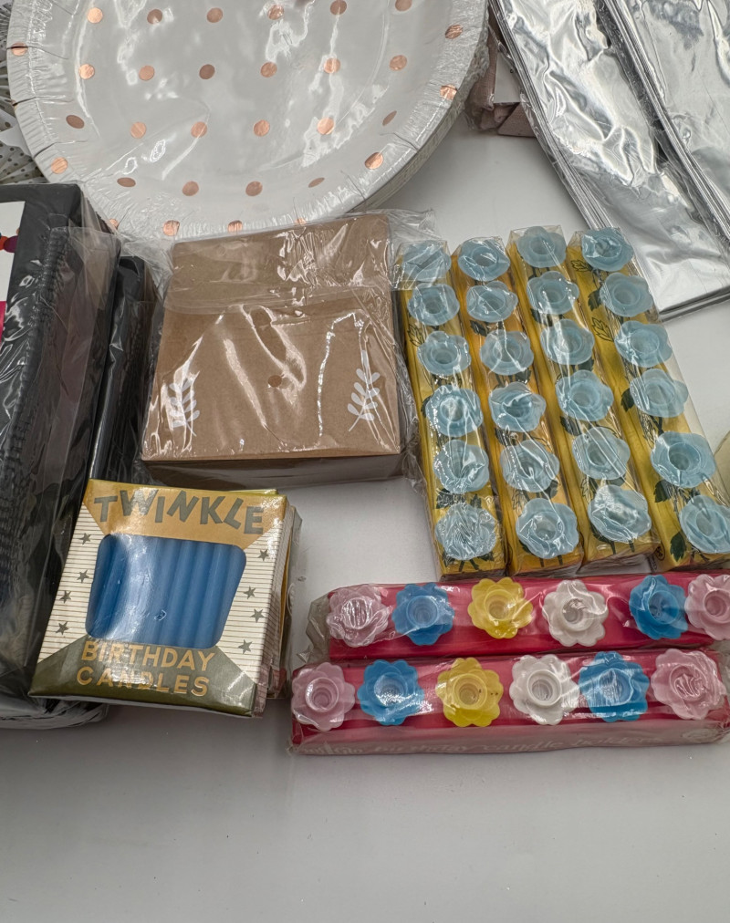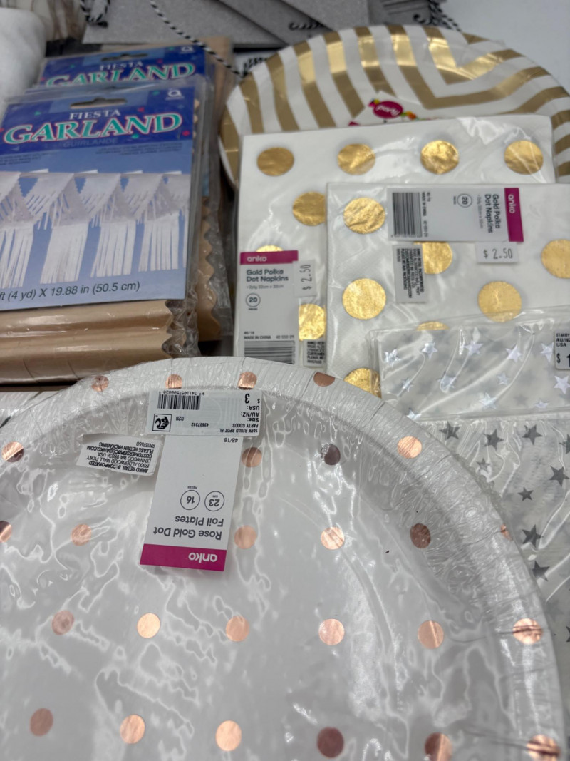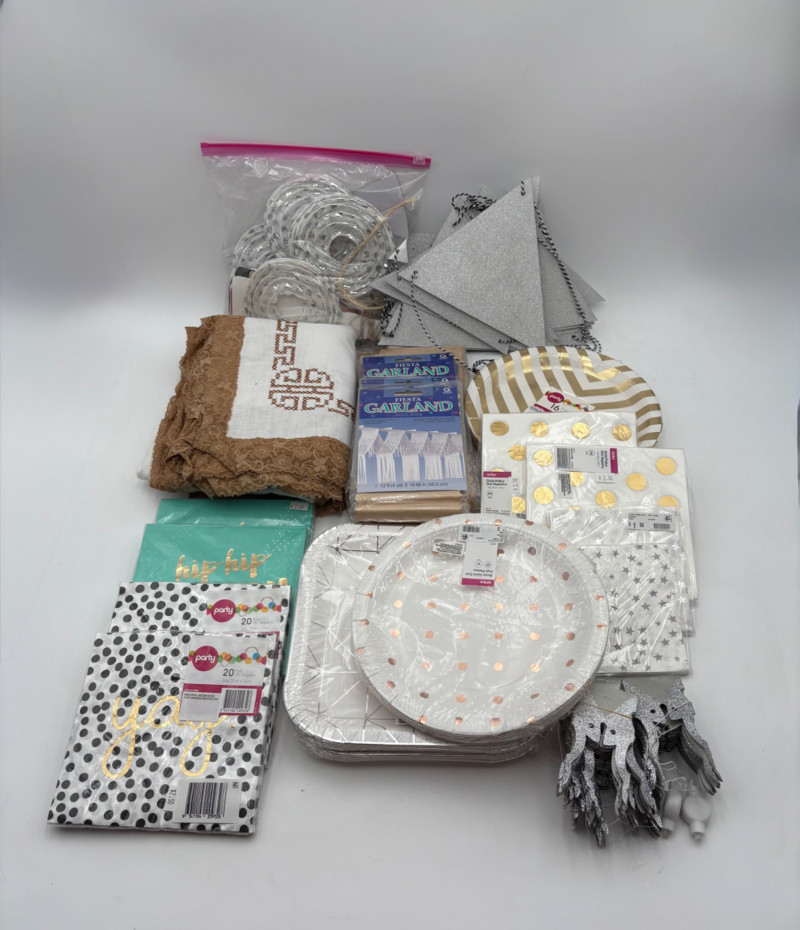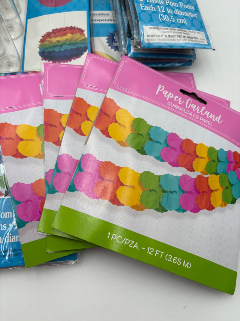 Lots & lots of party supplies! Tablecloths, napkins, paper plates, banners/bunting, bottles, crepe paper, tinsel (6 meter lengths - 10 in gold and 12 in silver), vintage & modern cake candles and candleholders, cups, and garlands. Also included - last 2 photos - is yards and yards of hand-strung rice paper disks to suspend across the ceiling in a large reception room. You will note that there is some soil from storage, but client says when unrolled and hung, it will not be noticeable.