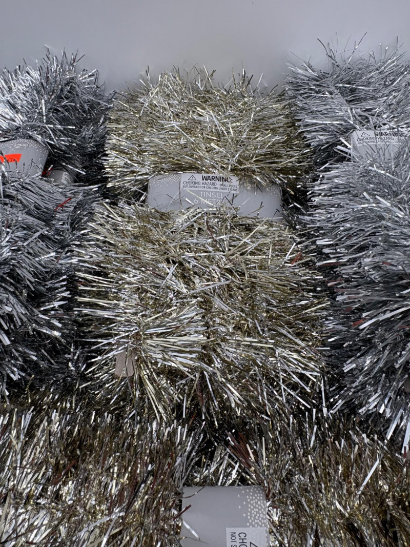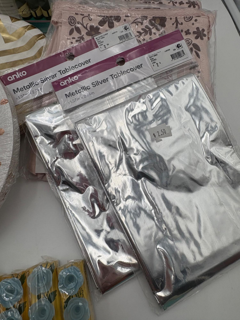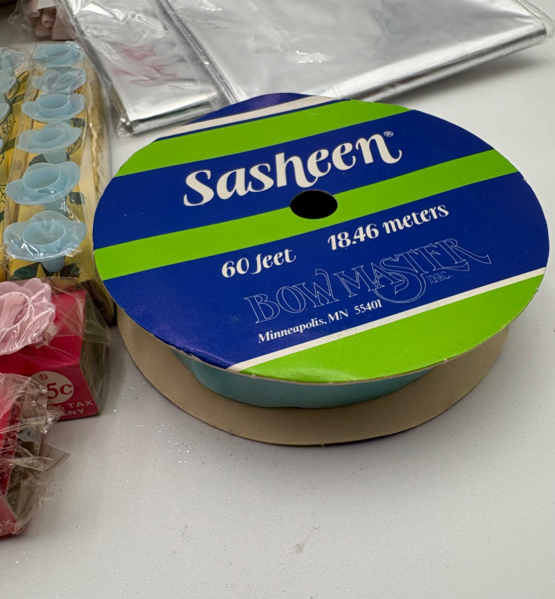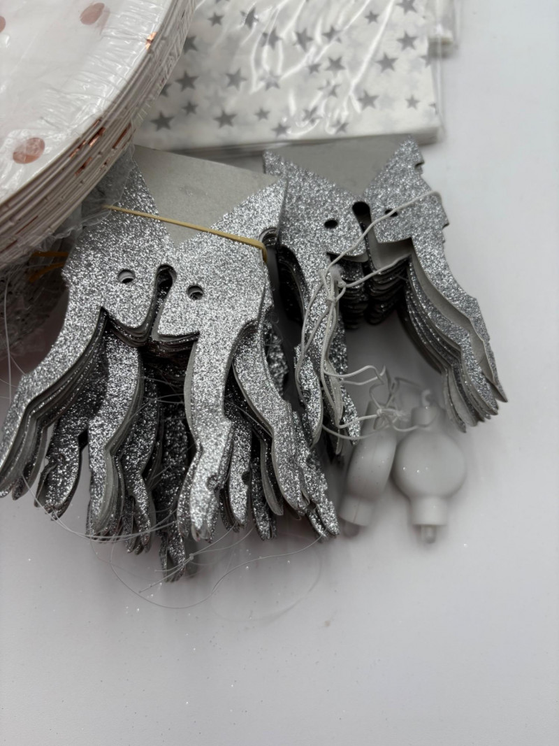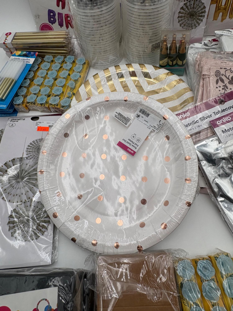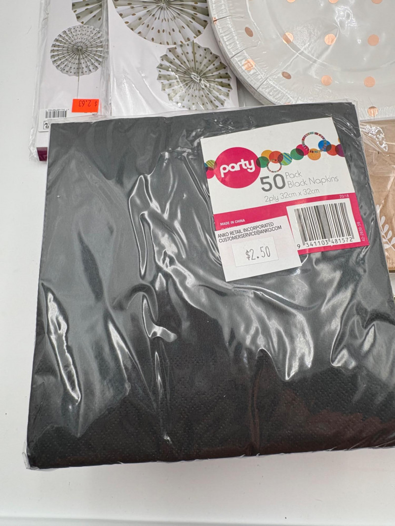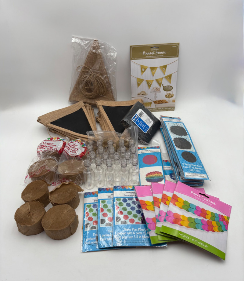 Lots & lots of party supplies! Tablecloths, napkins, paper plates, banners/bunting, bottles, crepe paper, tinsel (6 meter lengths - 10 in gold and 12 in silver), vintage & modern cake candles and candleholders, cups, and garlands. Also included - last 2 photos - is yards and yards of hand-strung rice paper disks to suspend across the ceiling in a large reception room. You will note that there is some soil from storage, but client says when unrolled and hung, it will not be noticeable.