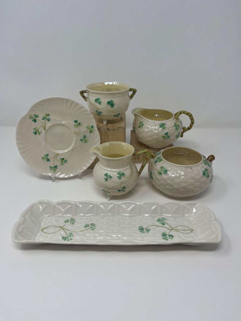 Belleek Irish Bone China Creamer and Sugar Sets with Accessories Collection of Belleek Irish bone china featuring shamrock motifs and embossed patterns. Includes two creamer and sugar bowl sets with lids, one small pitcher, a round underplate, and a 9 1/2-inch relish tray. All pieces are in Belleek's signature ivory porcelain with green shamrock accents. Heights range from 2 to 3 inches.