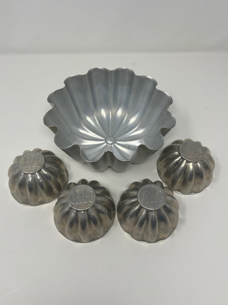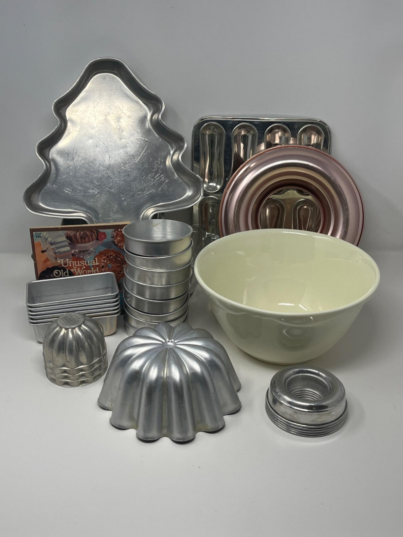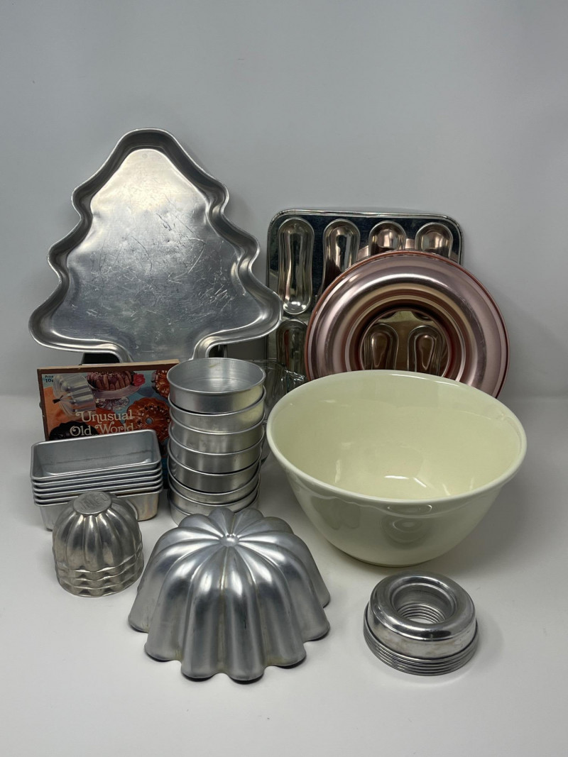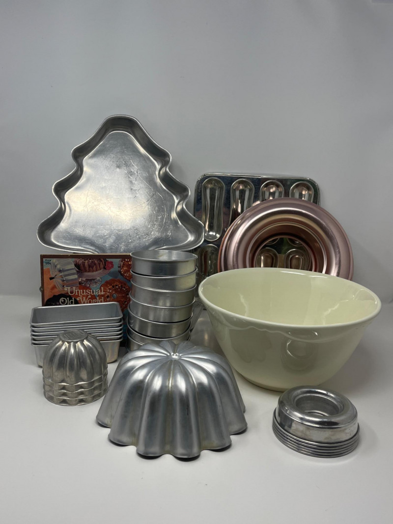 Vintage Bakeware Collection – Molds, Mixing Bowl, and More This vintage bakeware set includes a variety of aluminum molds, a ceramic mixing bowl, a glass loaf dish, and retro recipe booklets. Set includes: