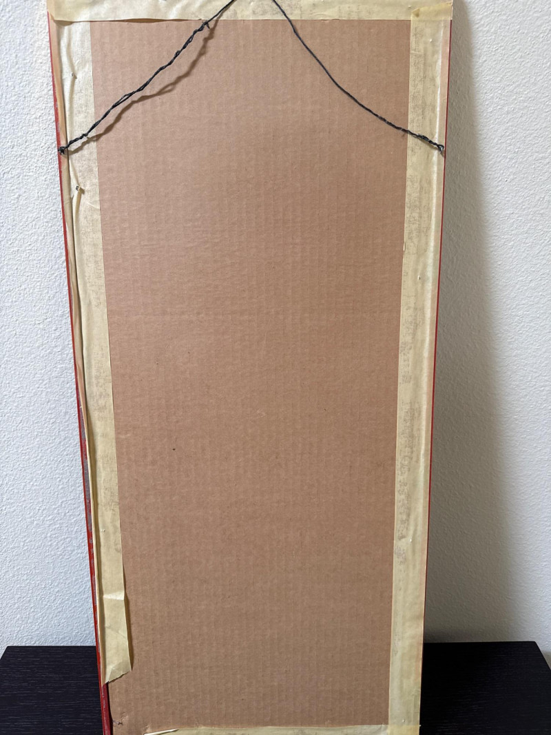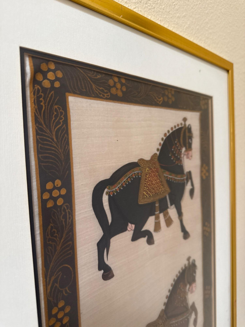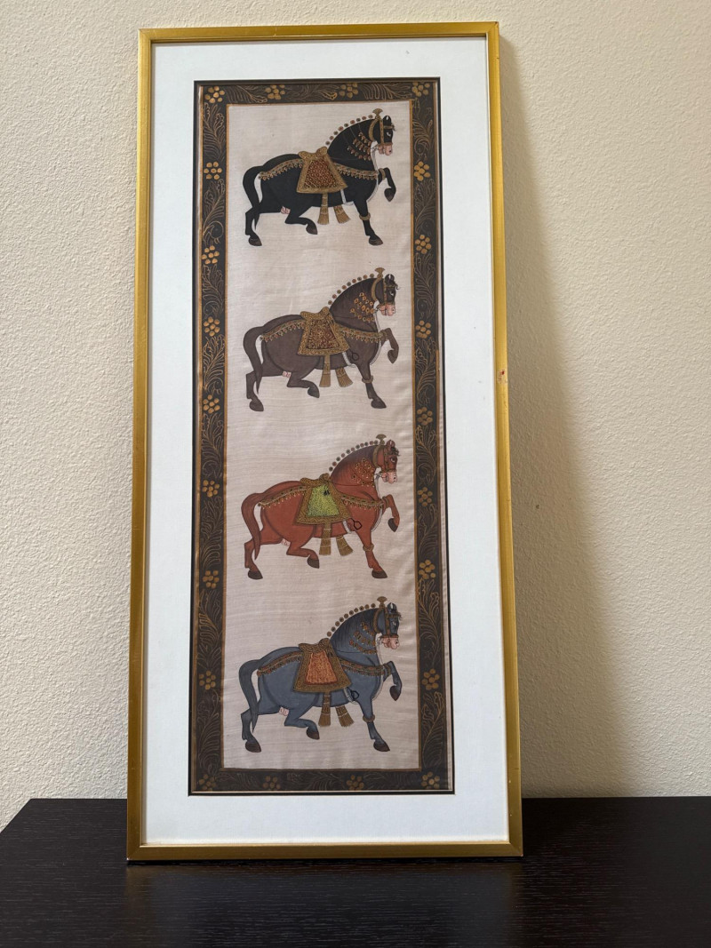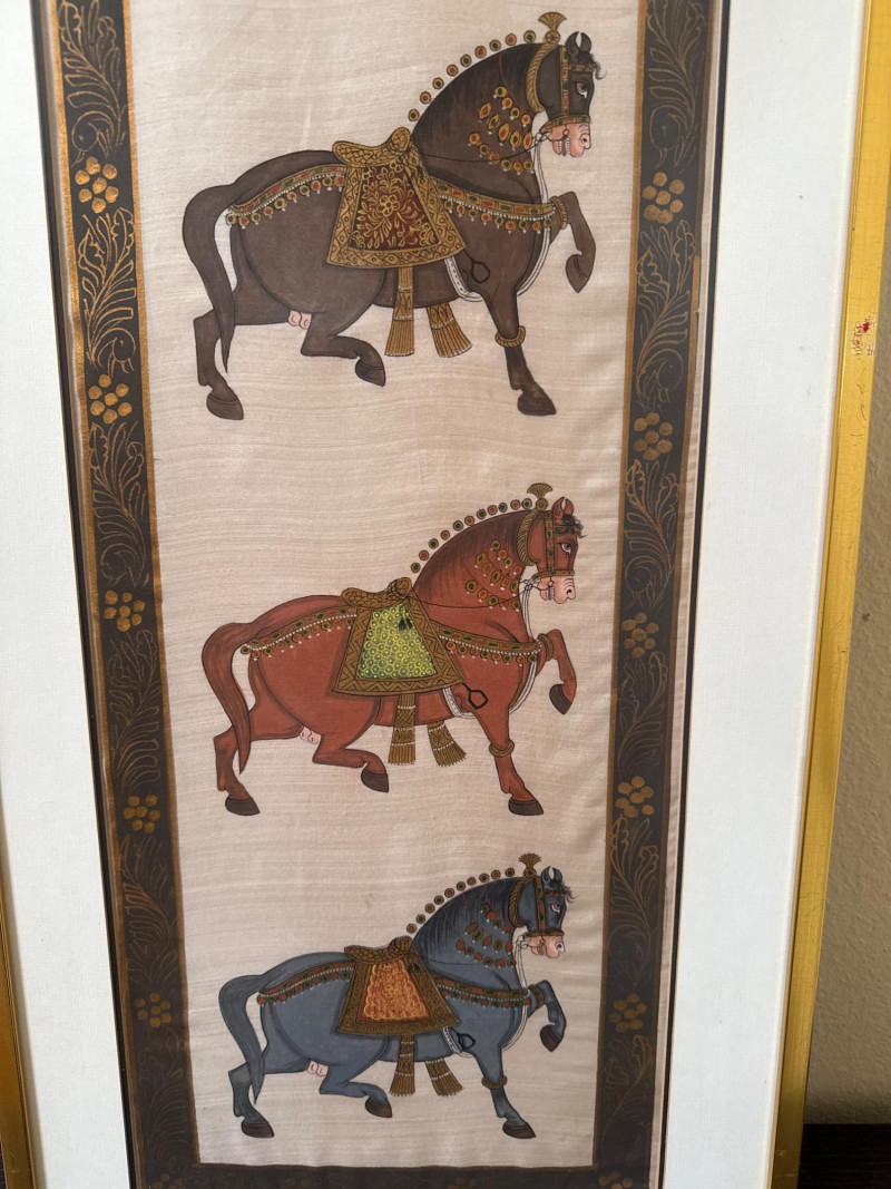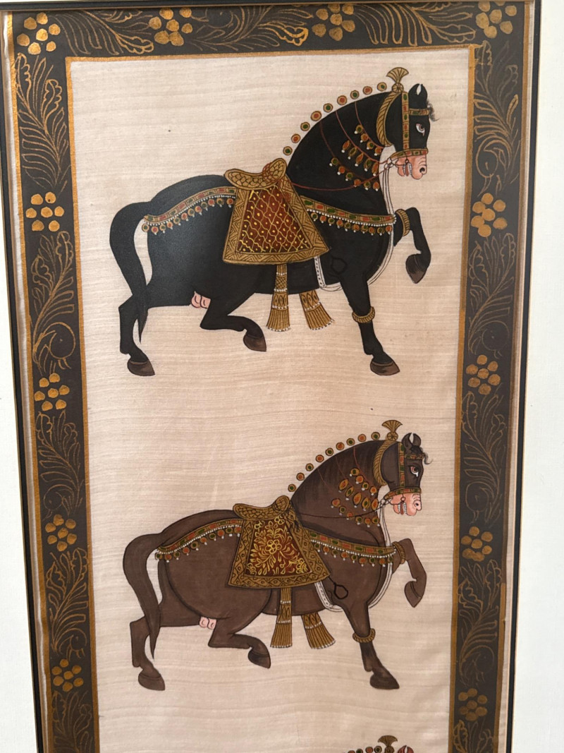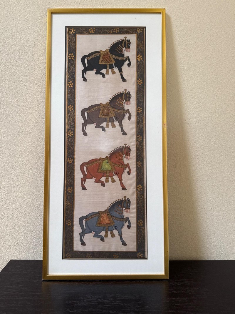 Framed Indian Cloth Painting of Decorated Horses – 33.5” T x 15” W Vertical cloth painting depicting four horses in traditional Indian miniature style. Each horse black, brown, red, and blue is detailed with gold-colored saddles and bridles. The figures are arranged in a vertical line within a floral border on a beige textile background. Framed in a gold-tone frame with white matting. Measures 33.5 inches tall by 15 inches wide. Ready to hang.