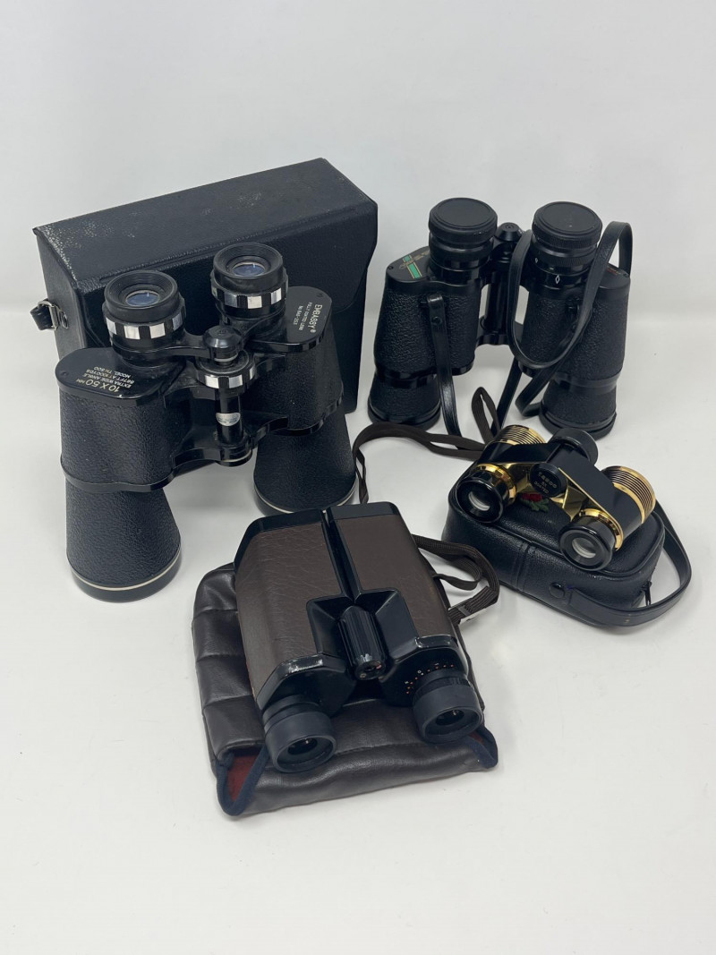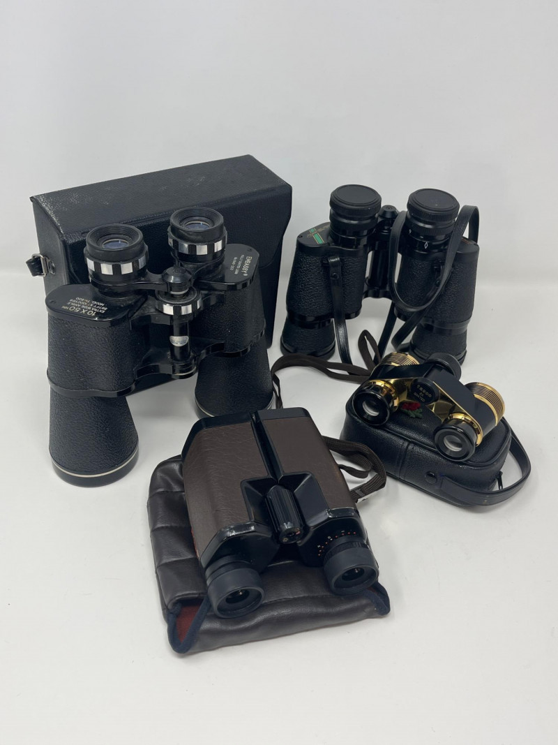 Lot of Vintage Binoculars with Cases – Mixed Brands and Styles A varied lot of four vintage binoculars, ranging from compact opera glasses to full-size field binoculars. Each piece has its own style and function.