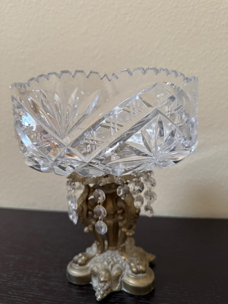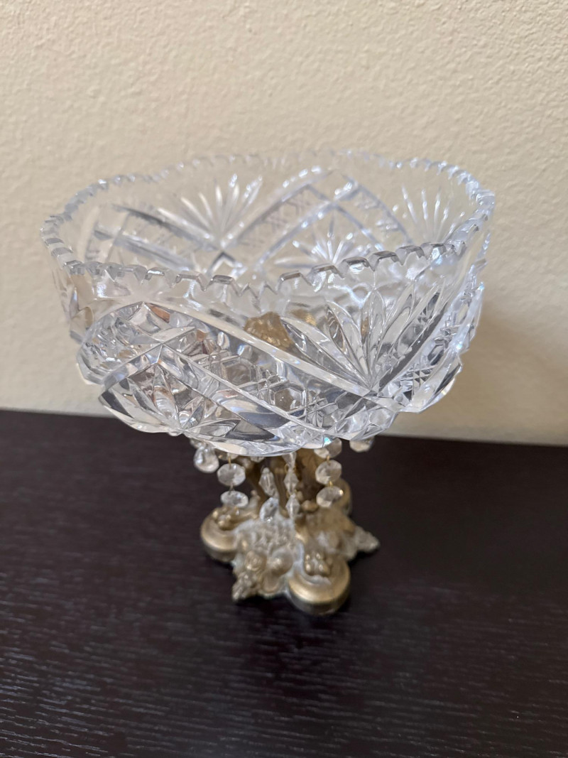 Hollywood Regency Crystal Compote with Ornate Brass Base Crystal compote measuring 9.5" tall by 8" wide. Features a cut glass bowl with scalloped edges and patterned surface of starbursts and crisscross lines. The bowl is mounted on a gilt-toned metal base with scrollwork and a floral medallion bolt attaching the bowl.. Faceted glass prisms hang around the edge. Felt pads on the base underside.