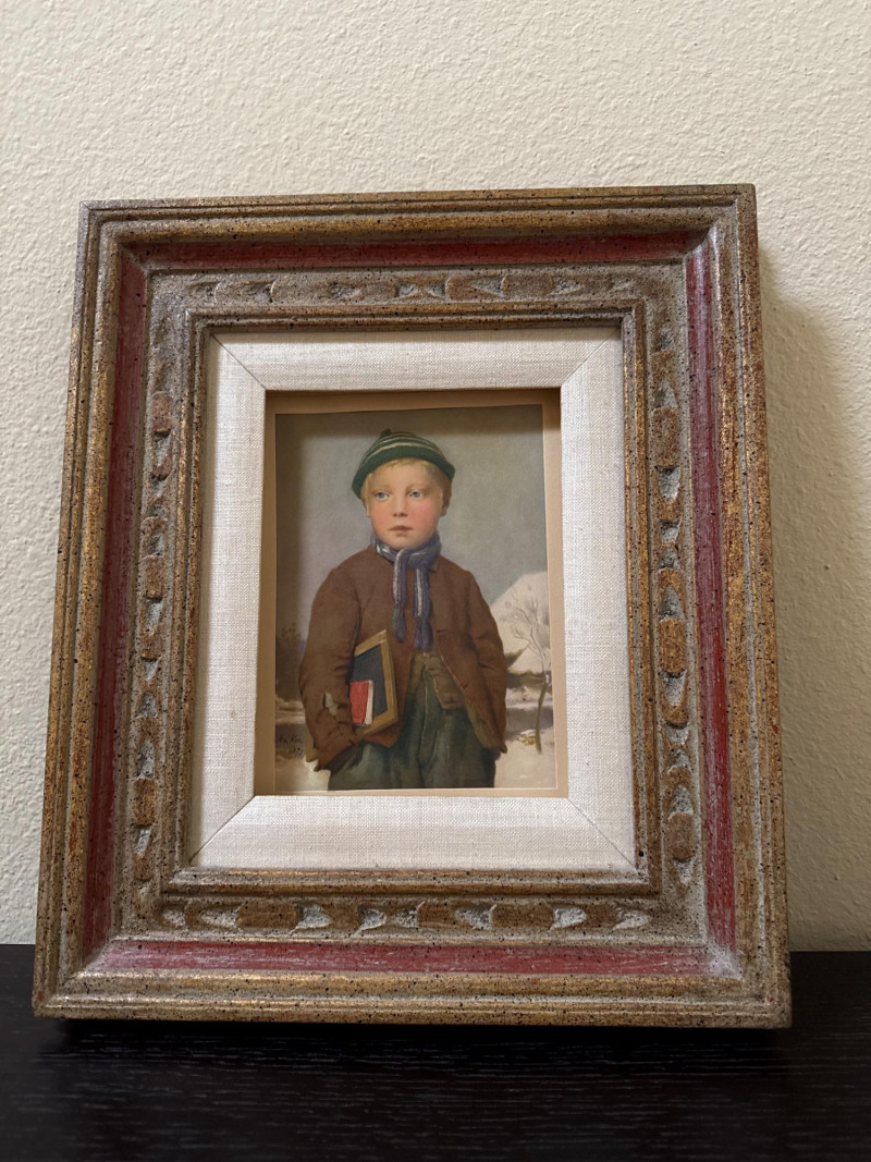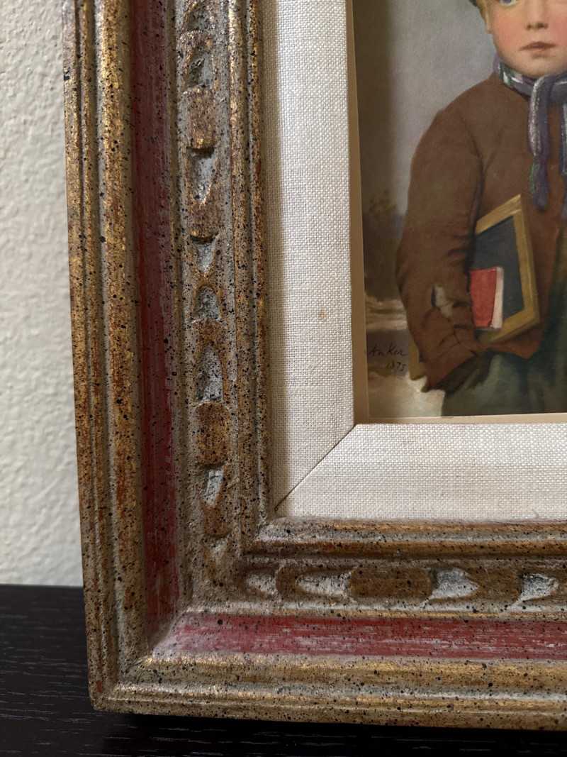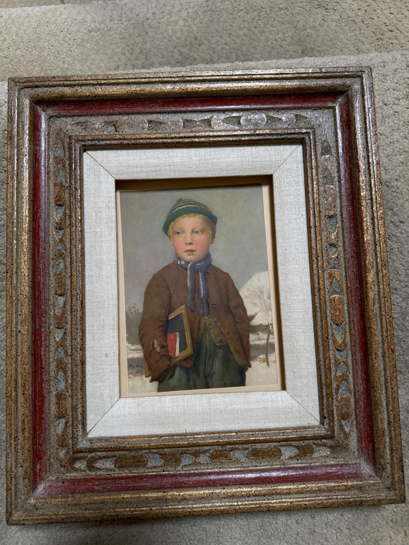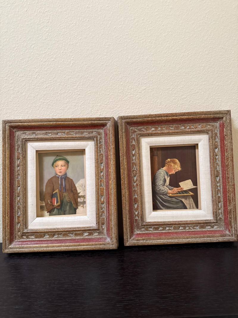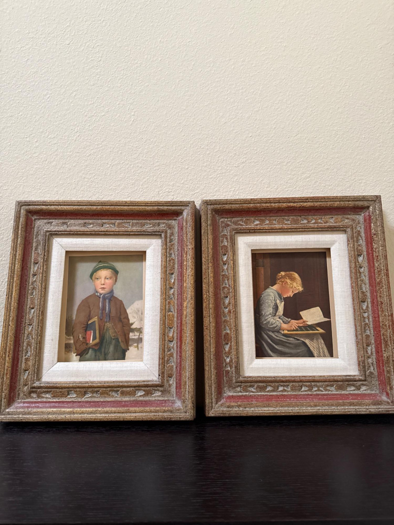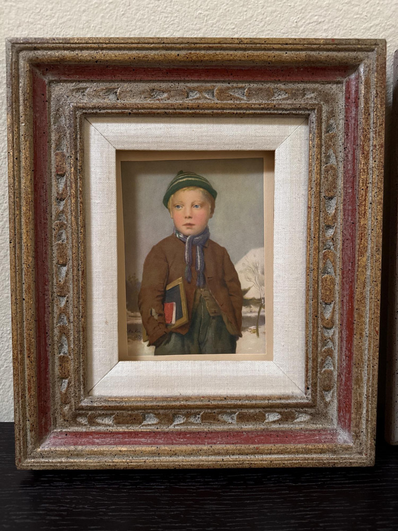 Pair of Framed Vintage-Style Prints – Boy with Books & Girl Studying This pair features two framed vintage-style prints, each housed in a stylized distressed wood frame with red accents and linen-style matting. The first depicts a young boy holding schoolbooks, dressed warmly against a wintry backdrop. The second shows a young girl in a blue dress intently reading and writing.