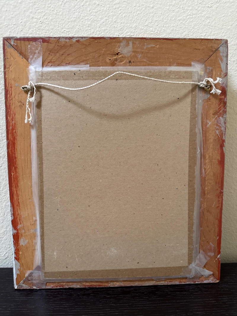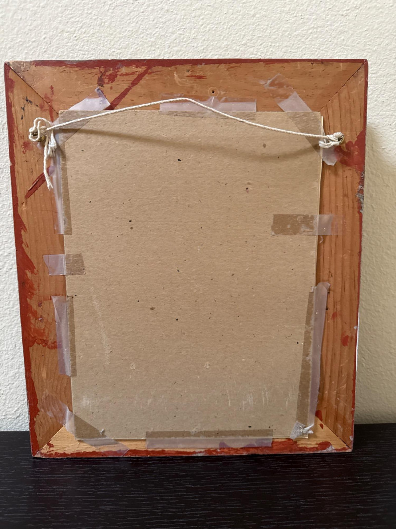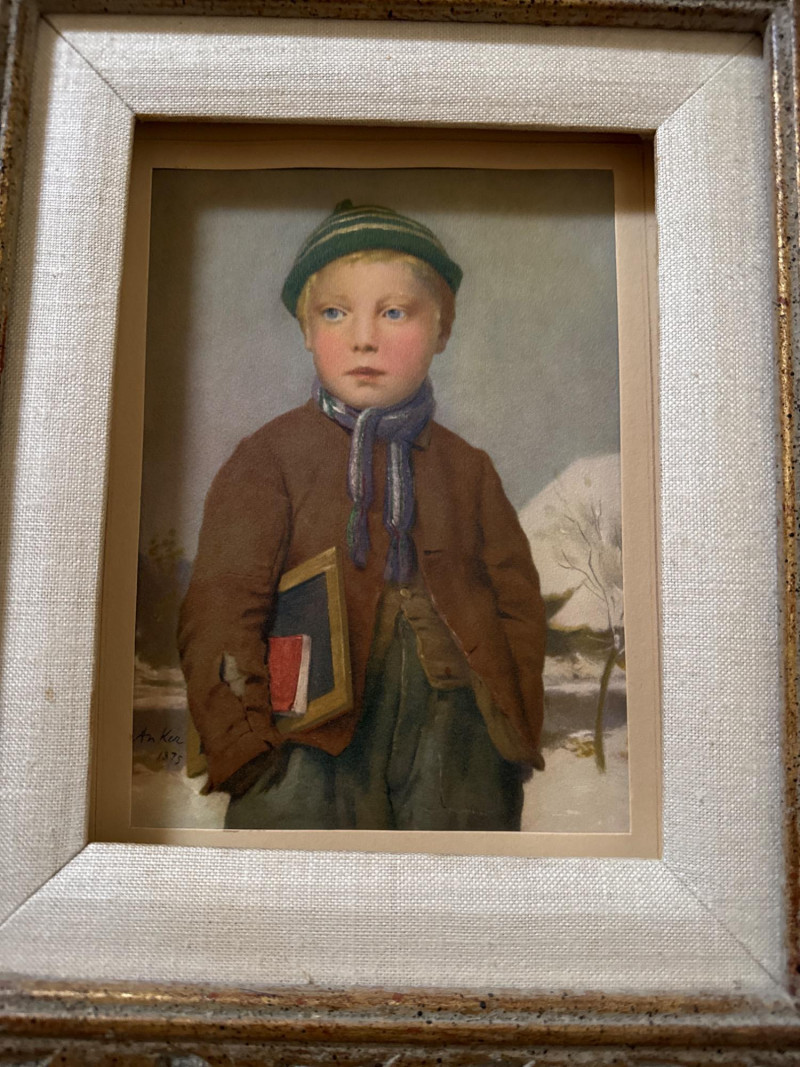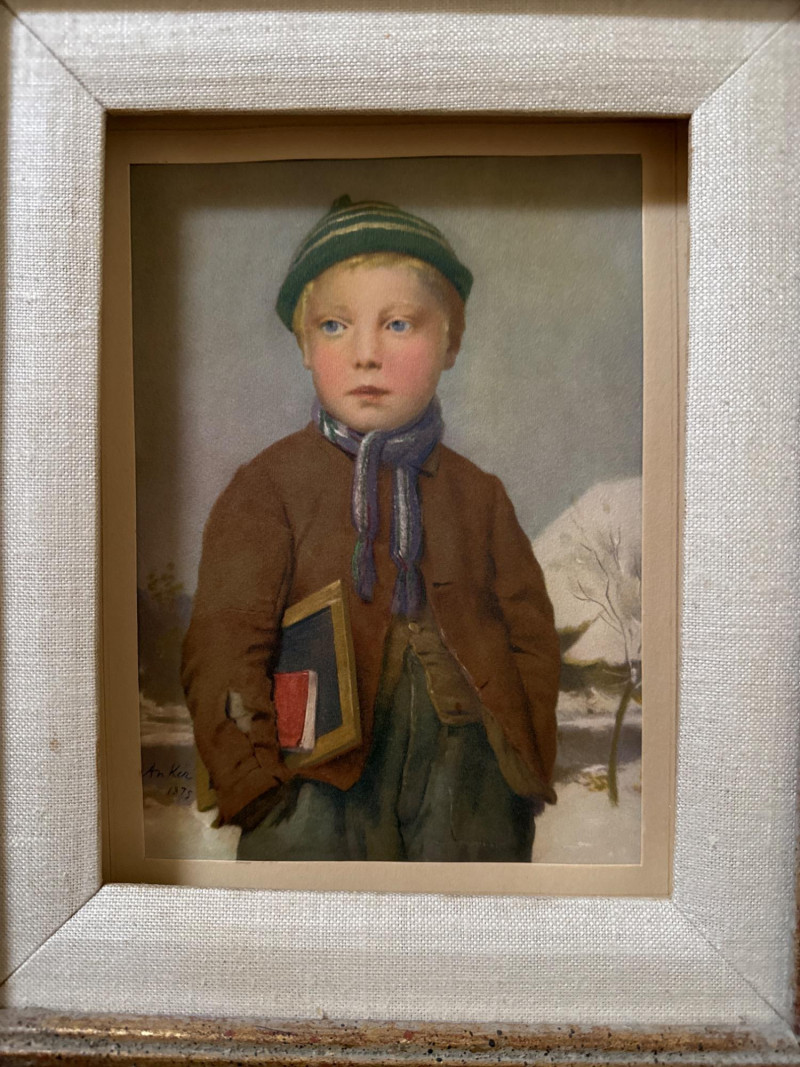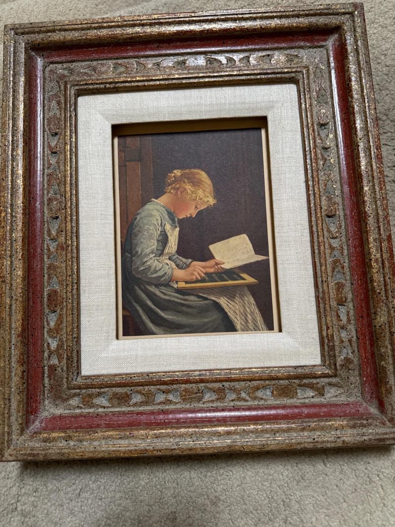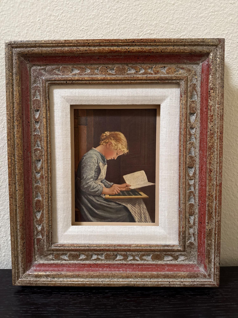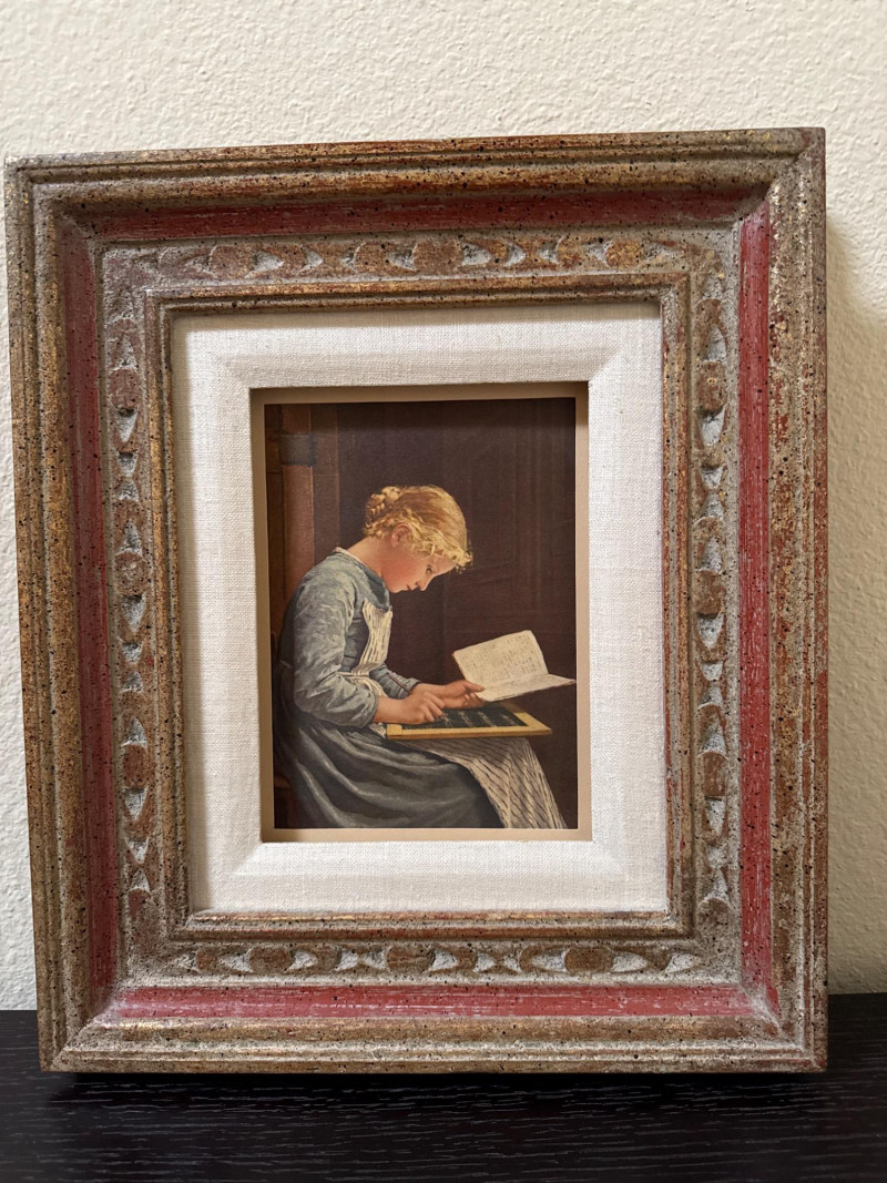 Pair of Framed Vintage-Style Prints – Boy with Books & Girl Studying This pair features two framed vintage-style prints, each housed in a stylized distressed wood frame with red accents and linen-style matting. The first depicts a young boy holding schoolbooks, dressed warmly against a wintry backdrop. The second shows a young girl in a blue dress intently reading and writing.