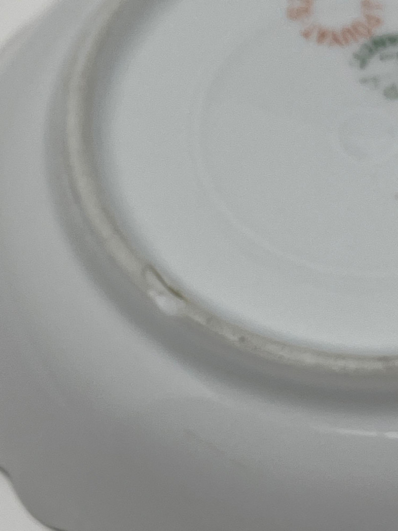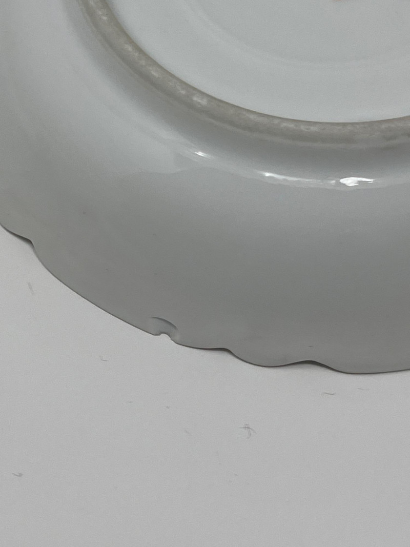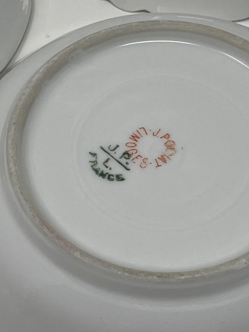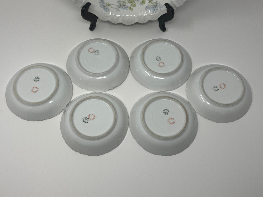 J. Pouyat Limoges Blue Floral Serving and Bowl Set – France This antique porcelain set includes one large serving bowl and six small bowls, crafted by J. Pouyat Limoges in France. Each piece features delicate blue floral sprays with light green accents and a soft scalloped edge, enhanced with subtle gold detail on the handles of the large bowl. Backstamped with the green J.P. L France and red J. Pouyat Limoges mark, this set dates from the late 19th to early 20th century.