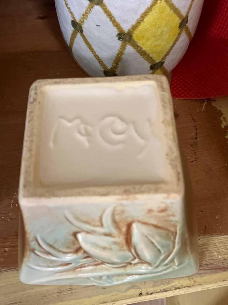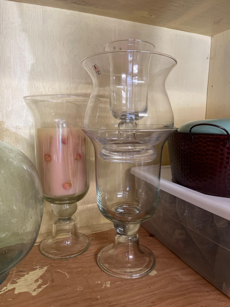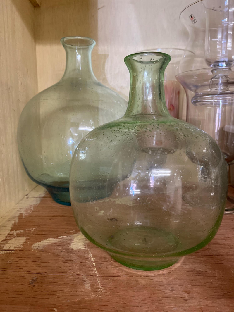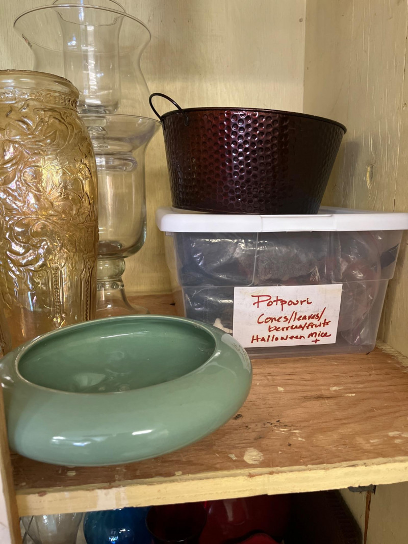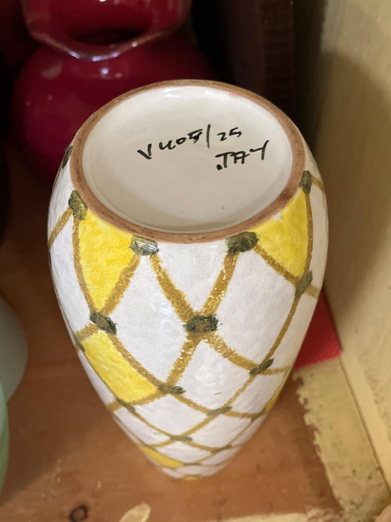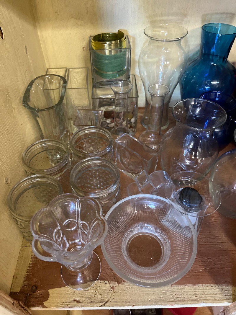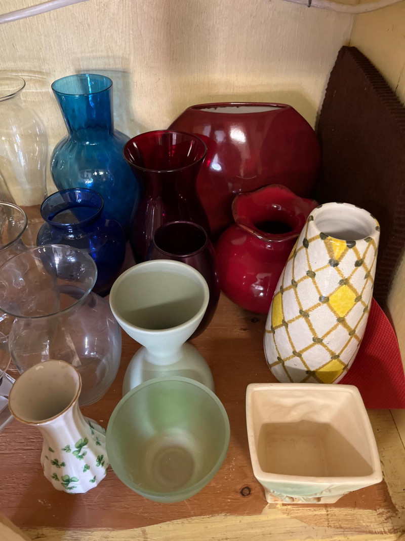 Entire Cupboard of Vases and Pots – Some Real Gems Collection of vases and pots in various shapes, sizes, and materials. Includes hand-painted stoneware, glazed ceramics, and textured glassware. Notable pieces feature sculpted leaf patterns, a yellow vase with a lattice design marked by the artist, and glass forms with varied surfaces. Key Features: