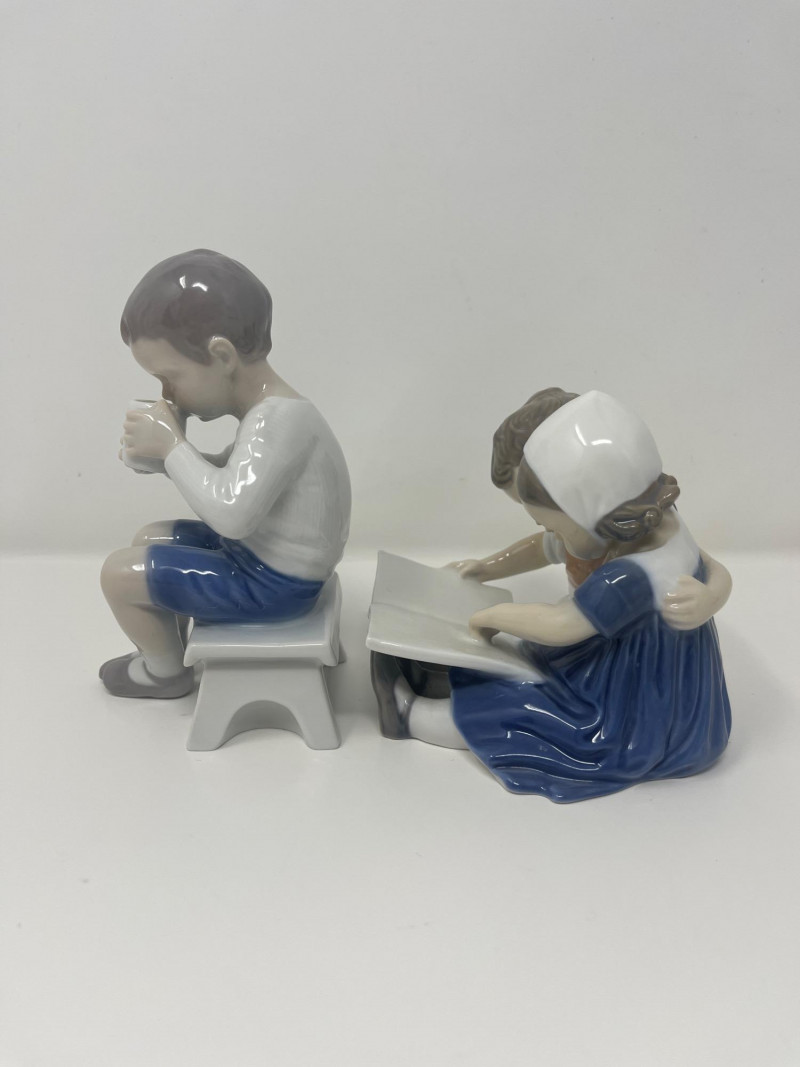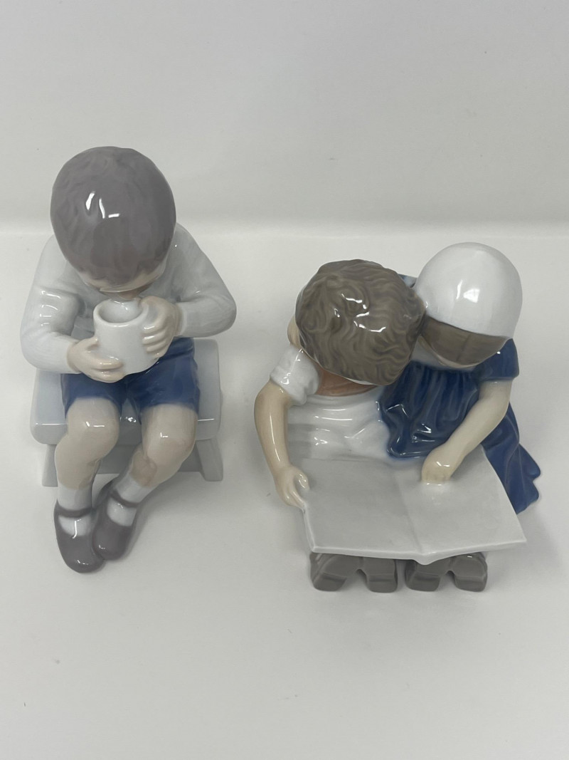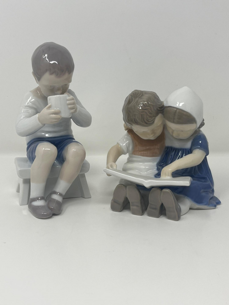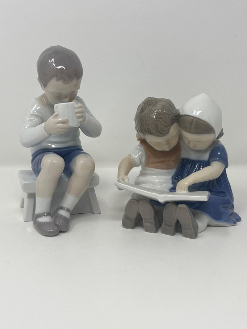 Bing & Grondahl Victor Boy Drinking Milk & Reading Children Figurines Pair of porcelain figurines by Bing & Grondahl, Denmark. One features a boy seated on a stool holding a cup, titled Victor Boy Drinking Milk. The other shows two children reading a book together, titled Reading Children. Both are marked on the base with the Bing & Grondahl hallmark. Key Features: