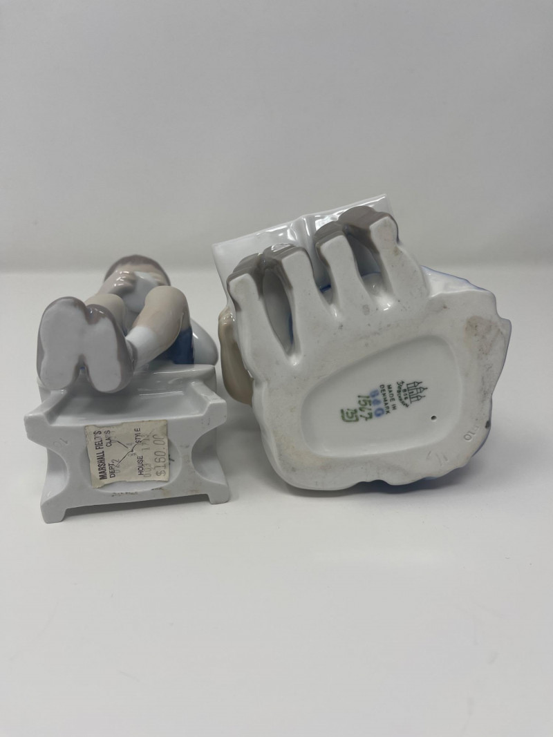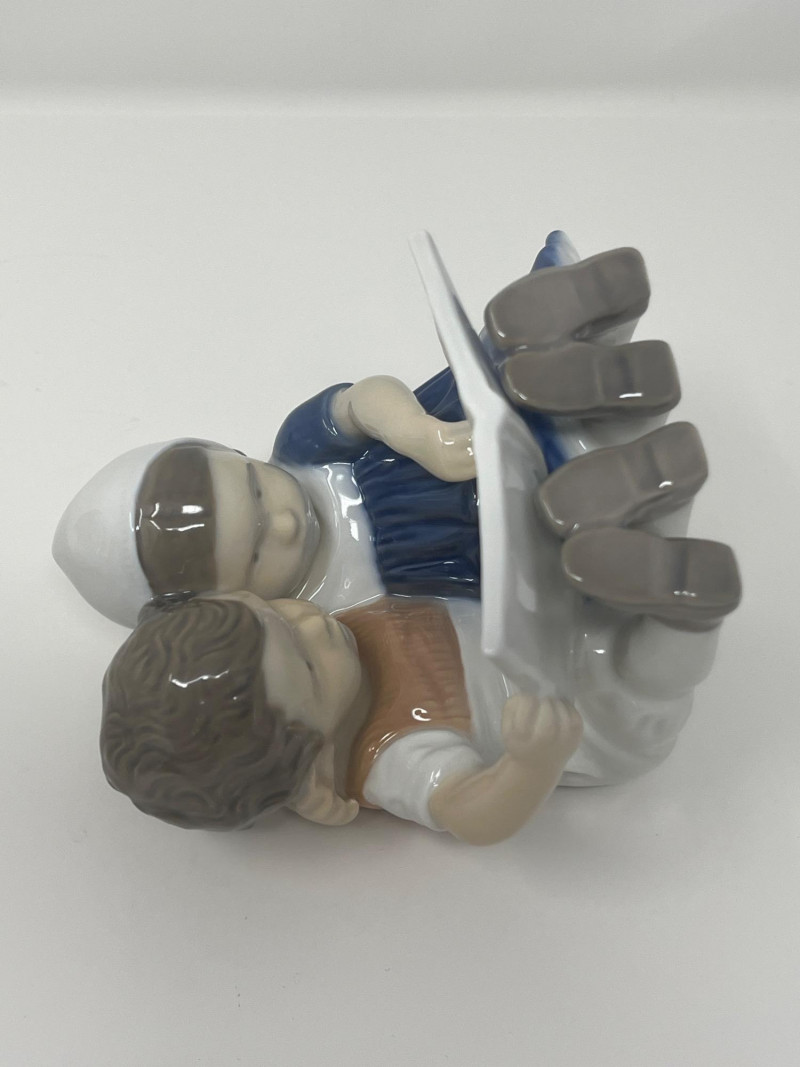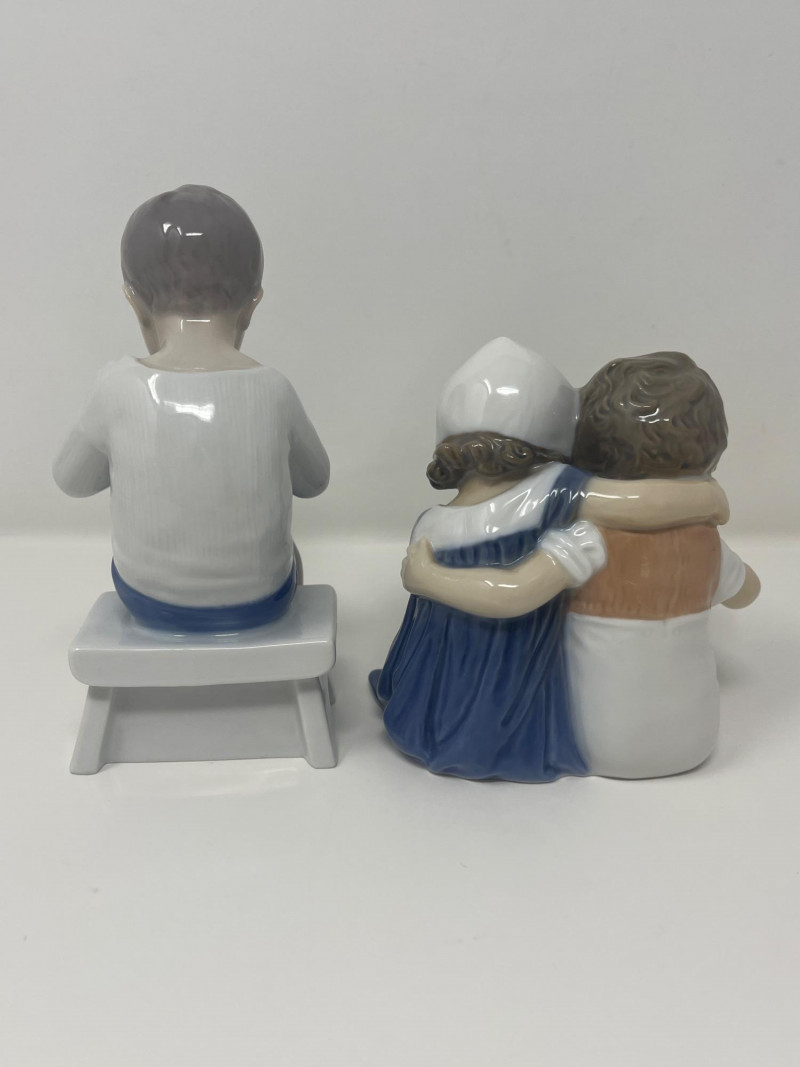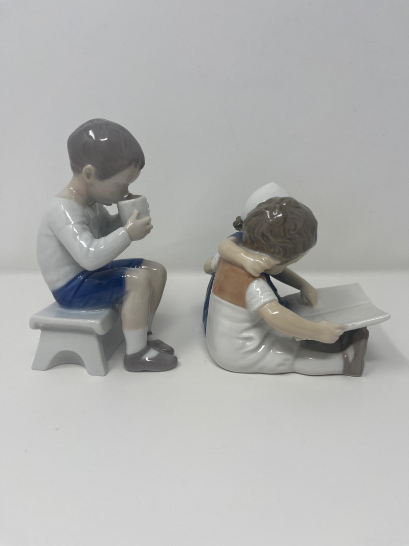 Bing & Grondahl Victor Boy Drinking Milk & Reading Children Figurines Pair of porcelain figurines by Bing & Grondahl, Denmark. One features a boy seated on a stool holding a cup, titled Victor Boy Drinking Milk. The other shows two children reading a book together, titled Reading Children. Both are marked on the base with the Bing & Grondahl hallmark. Key Features: