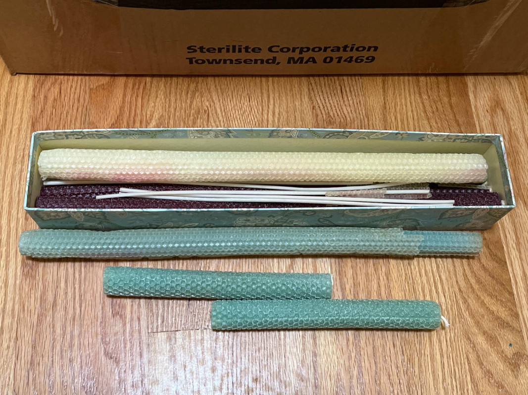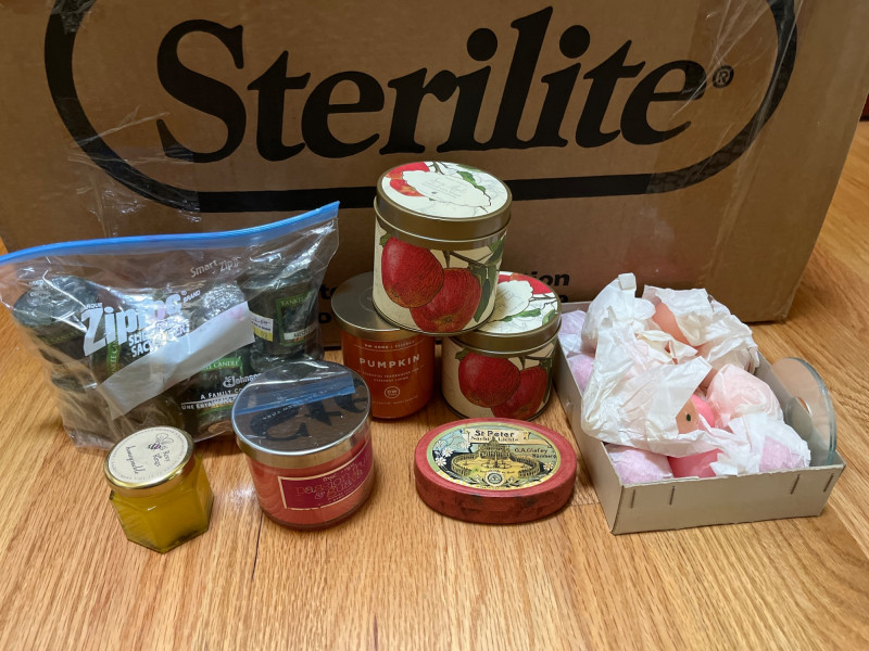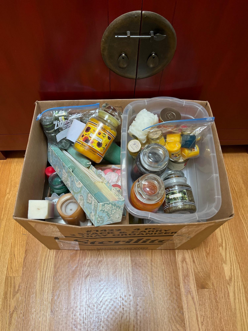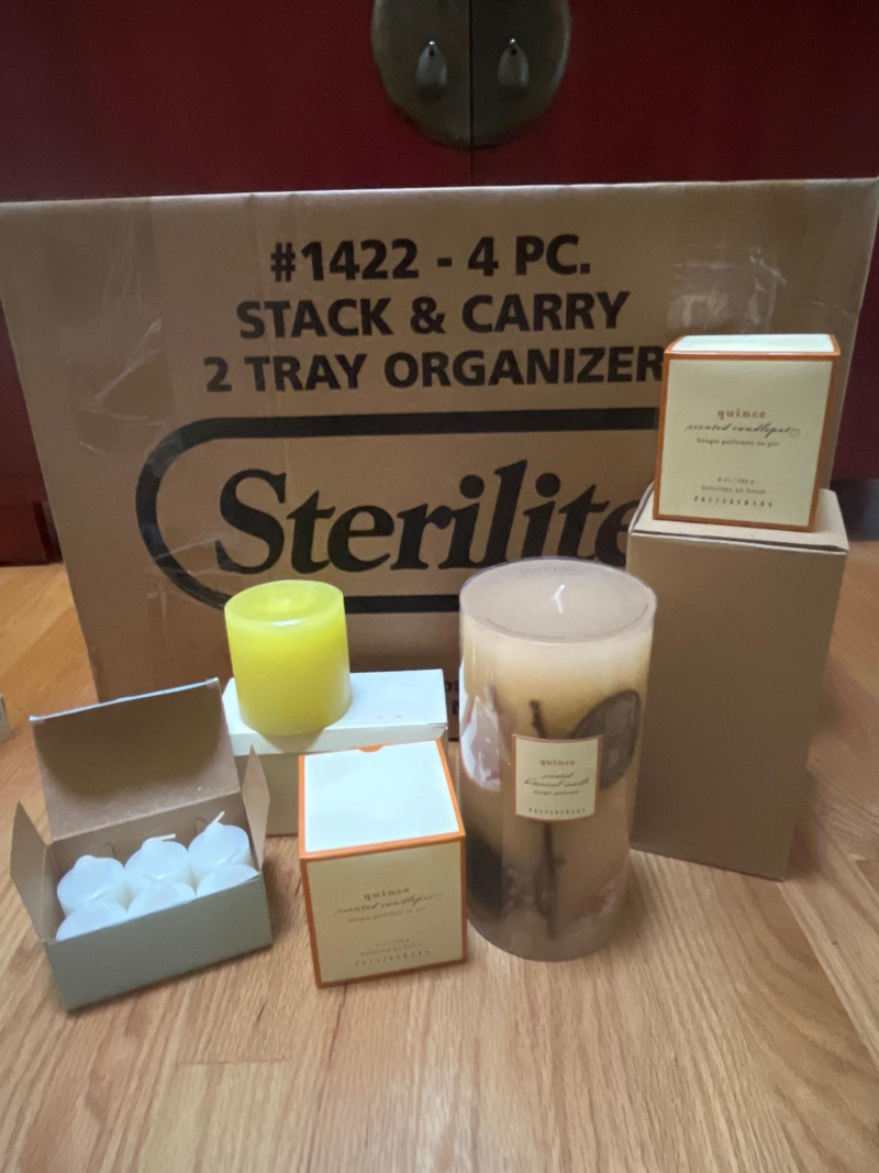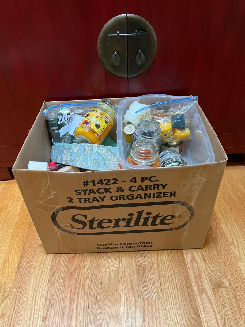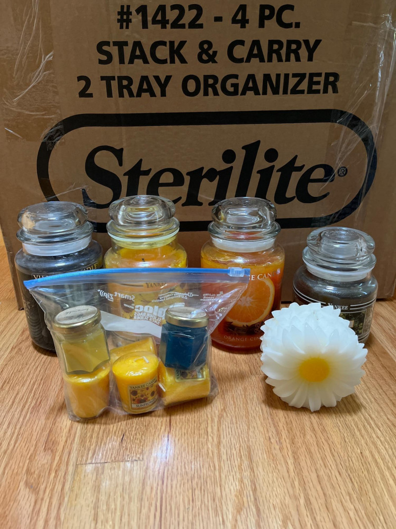 Large Box of Assorted Candles Collection Collection of various candles including large jar candles, shaped designs, and smaller scented pieces. Includes several Yankee Candle jars in different scents, beeswax tapers in original packaging, tin-covered candles, molded floral shapes, votives, and themed tins with pumpkin and apple motifs.