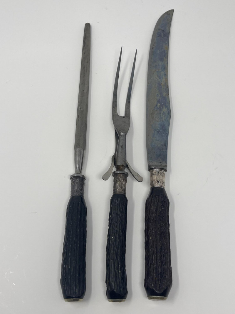 Vintage Carving Set with Antler Handles Three-piece carving set featuring antler handles. Includes a carving knife marked "Marshall Wells," a meat fork made of stainless steel with no visible markings, and a sharpening steel with partially legible "Lee" marking. Each piece varies slightly in weight and form. Key Features: