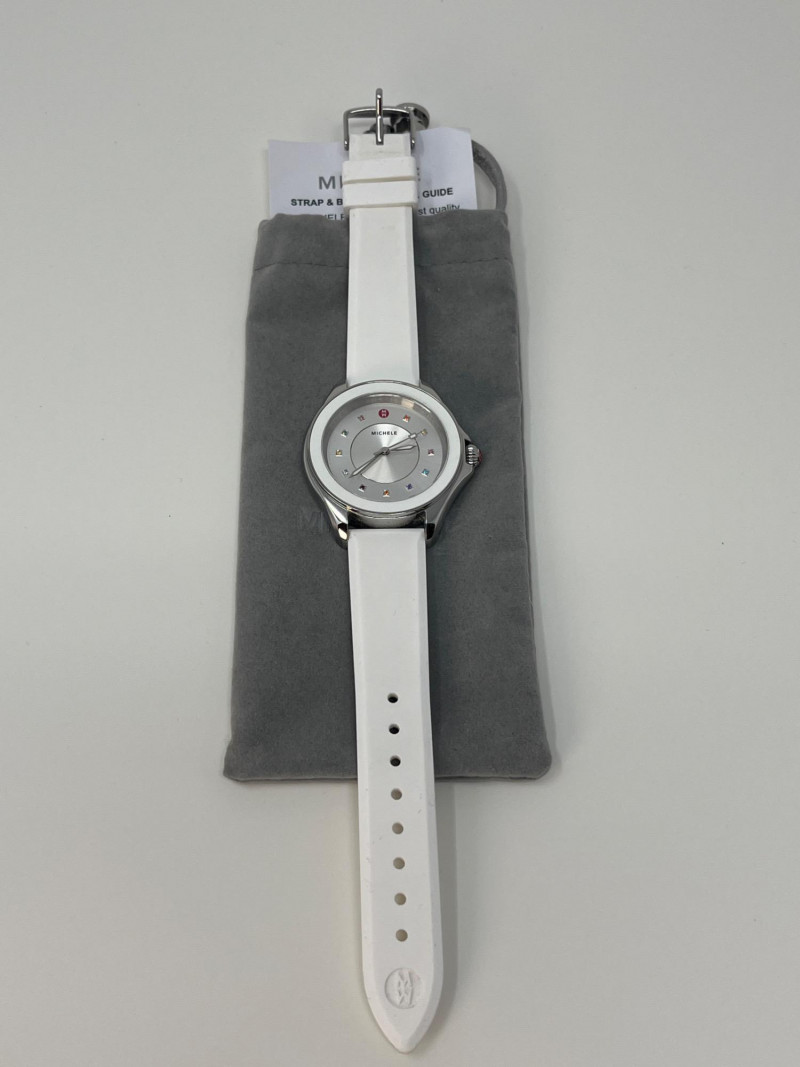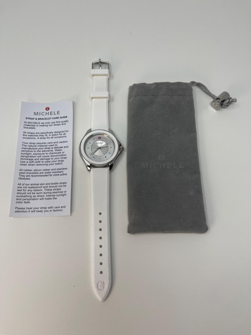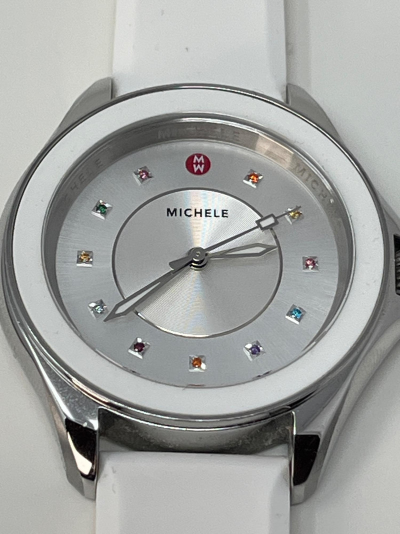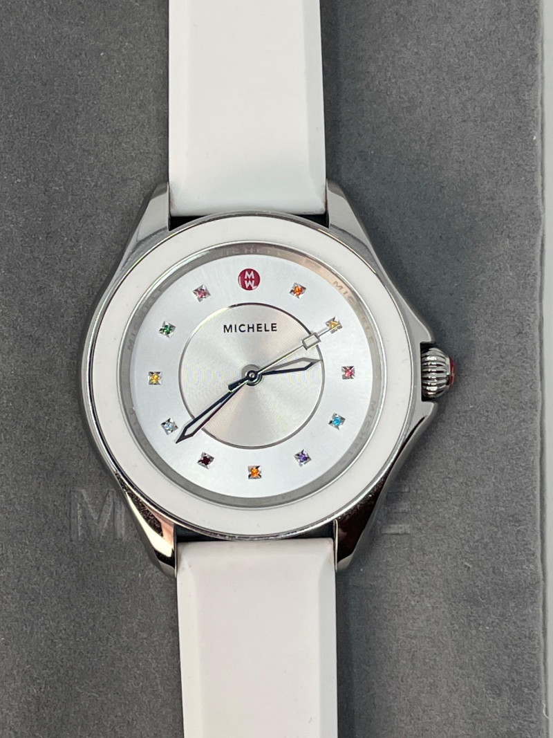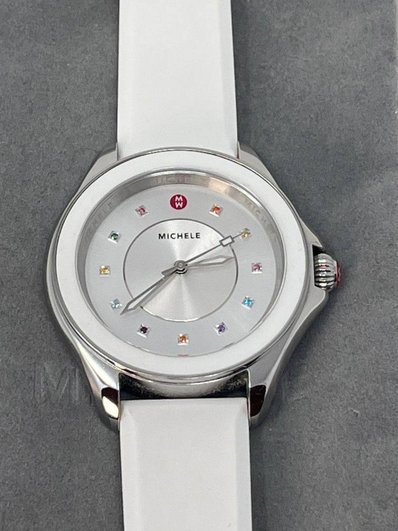 Michele Cape Watch with White Band Michele Cape model watch with a stainless-steel case and white silicone band. The dial features multi-colored crystal hour markers, along with the Michele logo and red MW emblem. Comes with the original care guide and a grey velvet pouch.