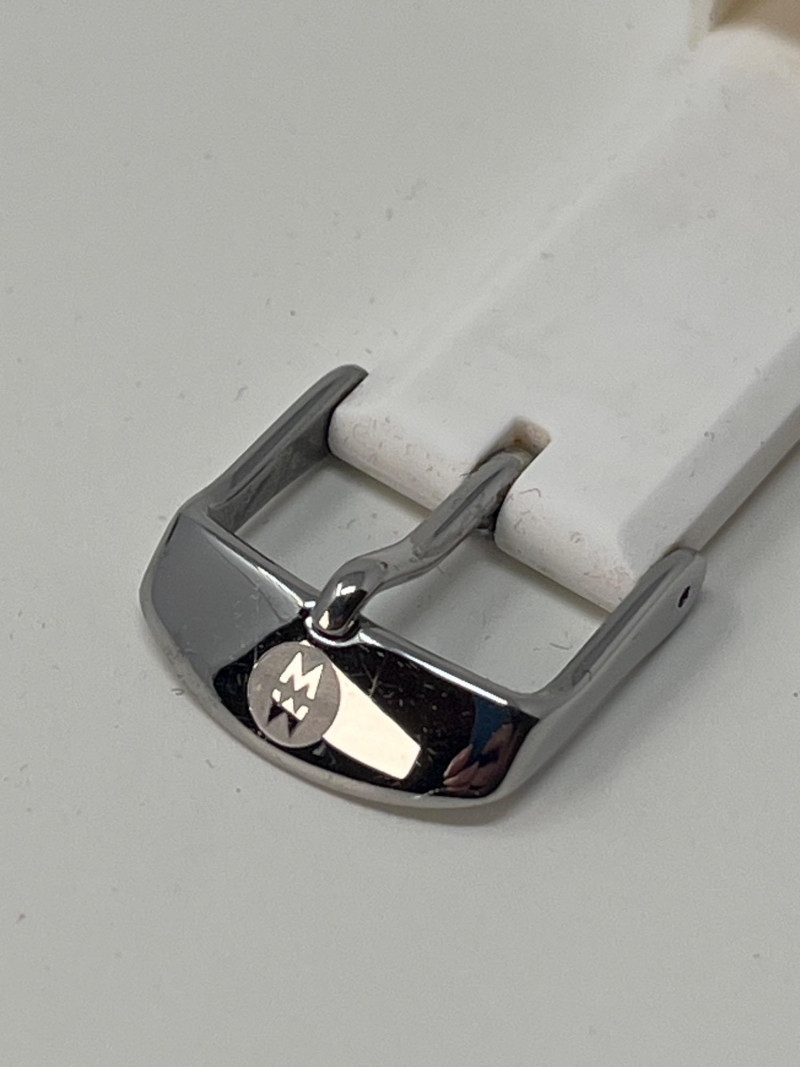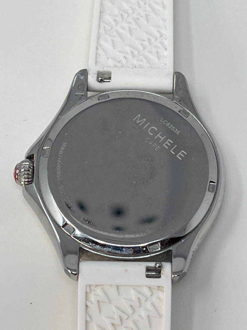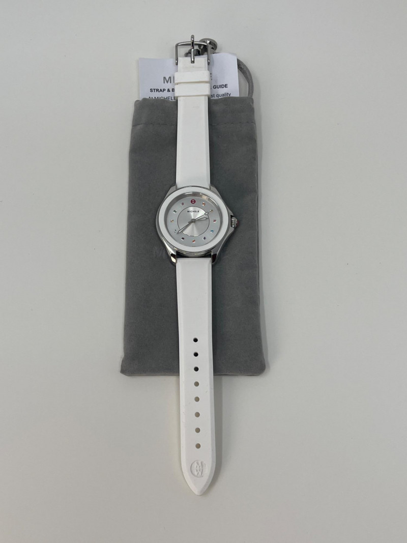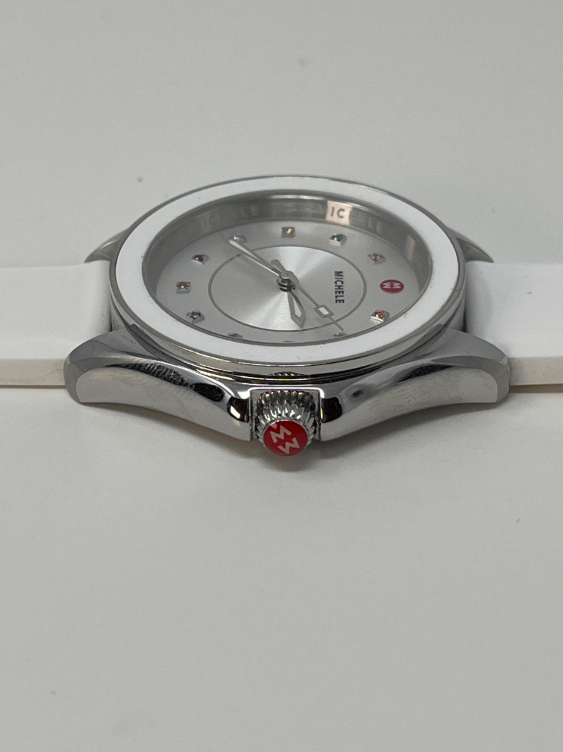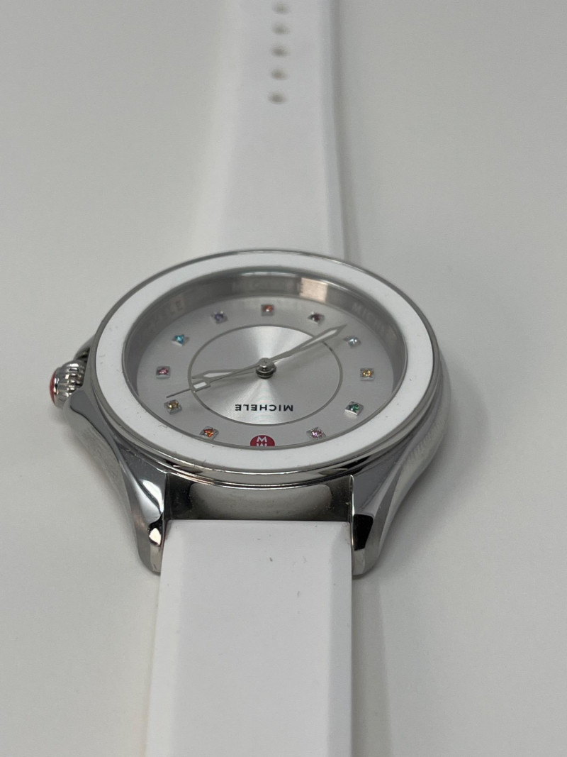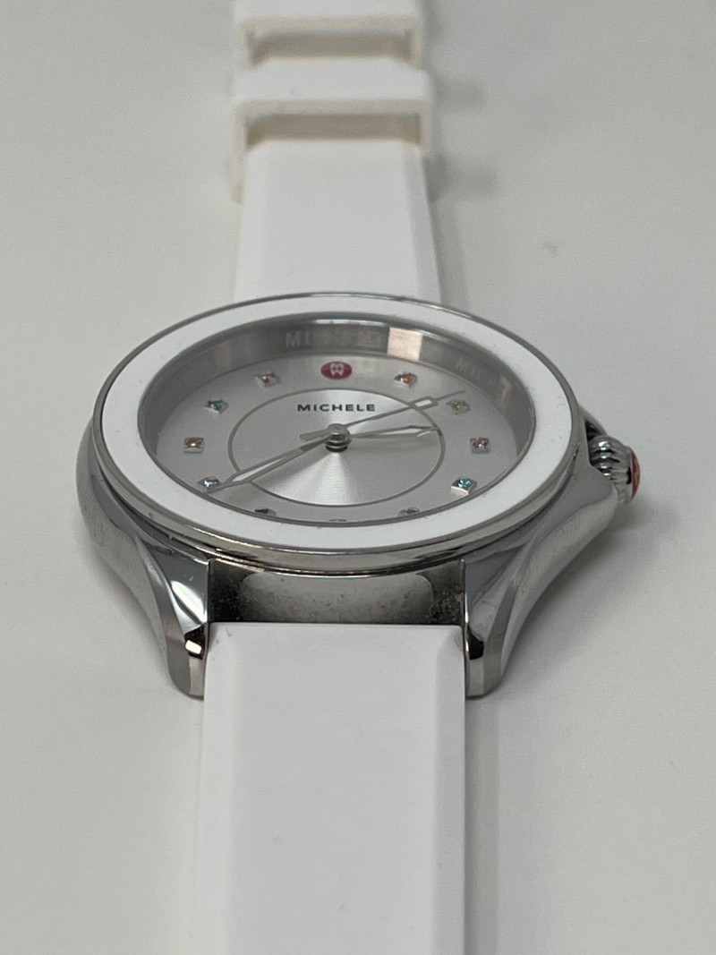 Michele Cape Watch with White Band Michele Cape model watch with a stainless-steel case and white silicone band. The dial features multi-colored crystal hour markers, along with the Michele logo and red MW emblem. Comes with the original care guide and a grey velvet pouch.