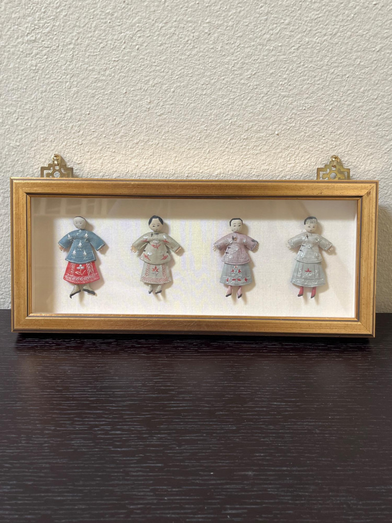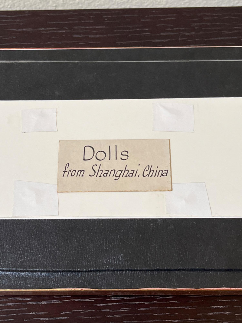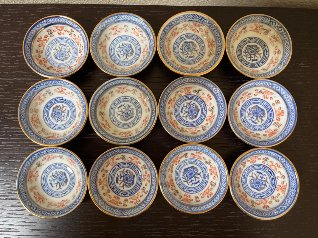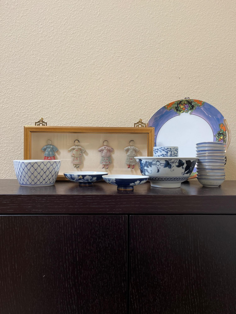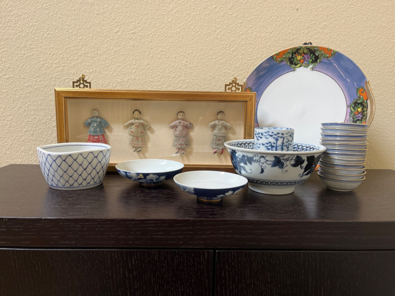 Japanese Art with Blue and White Asian Pottery Lot Collection of Asian decorative items combining Japanese and Chinese elements. Includes a framed set of four traditional dolls from Shanghai, a hand-painted Noritake Morimura lusterware plate, and various pieces of blue and white porcelain. Additional items include rice eye grain sauce bowls and a group of twelve miniature bowls with red and blue motifs. Dimensions: