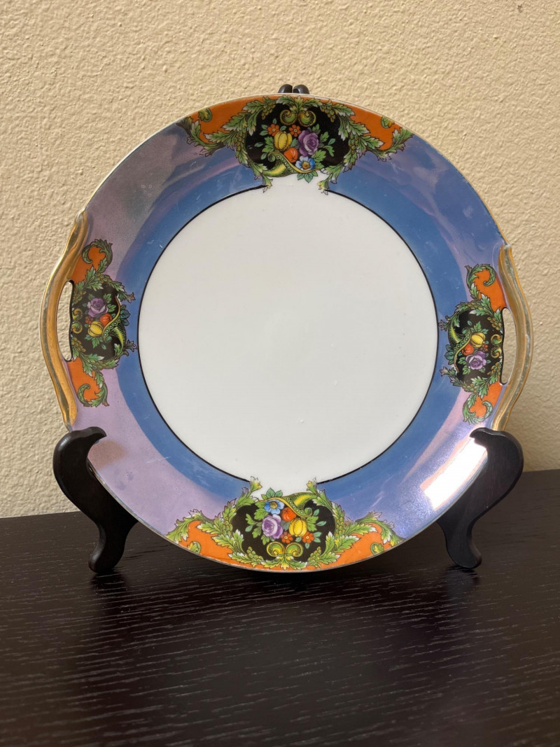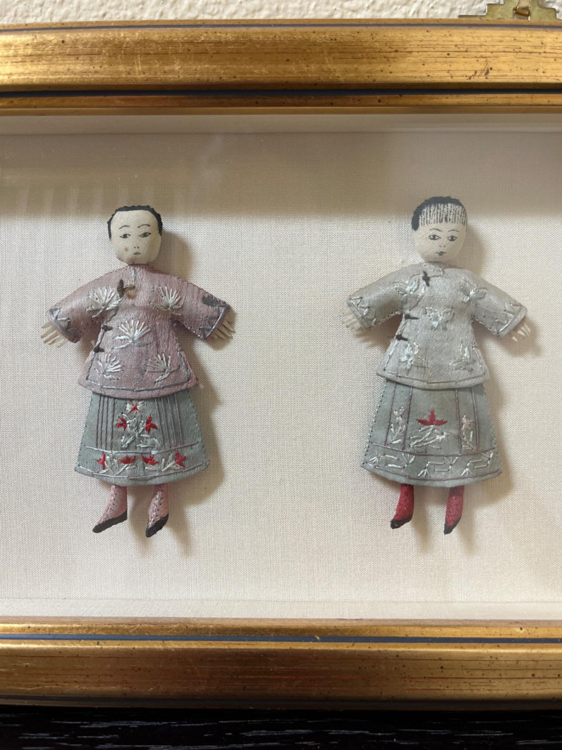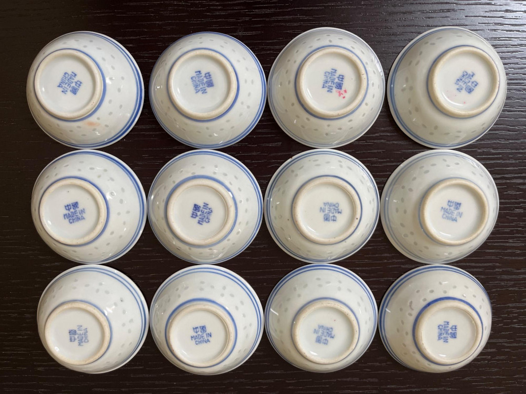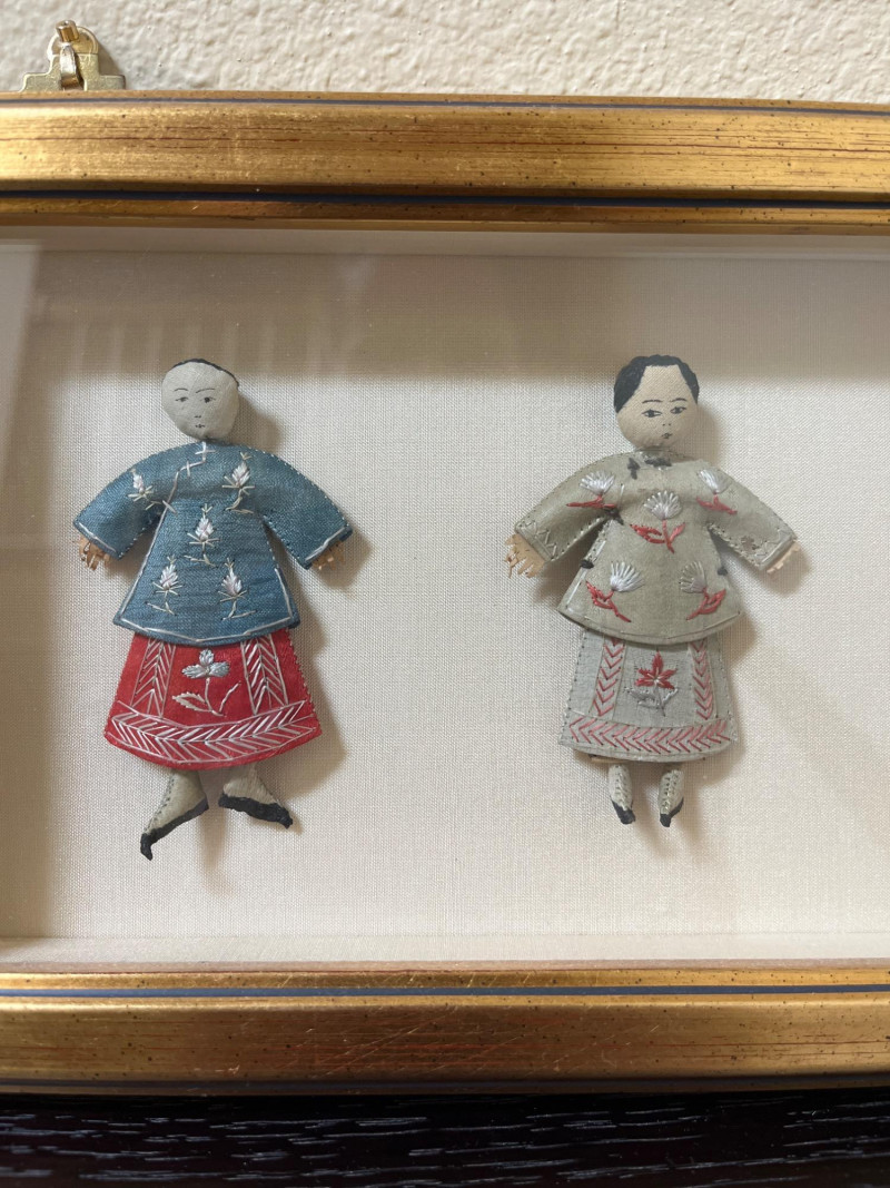 Japanese Art with Blue and White Asian Pottery Lot Collection of Asian decorative items combining Japanese and Chinese elements. Includes a framed set of four traditional dolls from Shanghai, a hand-painted Noritake Morimura lusterware plate, and various pieces of blue and white porcelain. Additional items include rice eye grain sauce bowls and a group of twelve miniature bowls with red and blue motifs. Dimensions: