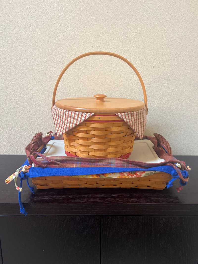 Longaberger Basket Set with Lid and Serving Basket – 2 Pieces This set includes a 1999 Longaberger round basket with a wooden lid, swing handle, and removable cloth liner in a red gingham pattern and a clear plastic insert. The basket measures approximately 6" tall without the handle, 11" with the handle, and 10" in diameter. Also included is a rectangular Longaberger serving basket (marked 2008) measuring 15" x 10.5" x 3". It features braided leather handles, a plastic insert with lid, a floral cloth liner, and two additional drawstring liners in coordinating colors.