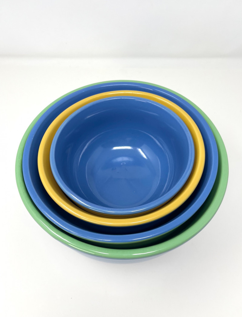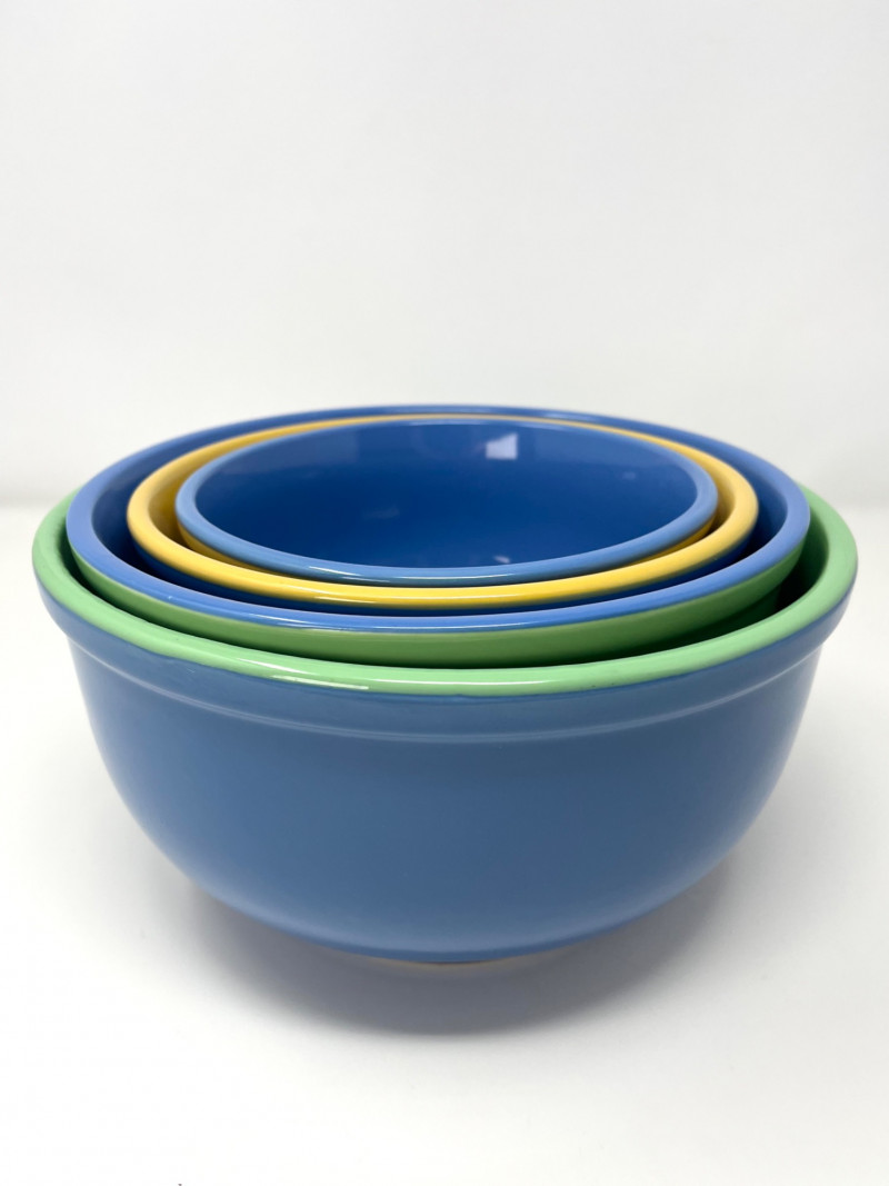 Green, Yellow, and Blue Nesting Mixing Bowls – Set of 4 Set of four ceramic mixing bowls in green, yellow, and blue glazes. Each bowl has a rounded form and nests for compact storage. The largest bowl measures approximately 5" tall and 9" in diameter; the smallest is about 3" tall and 6.5" wide.