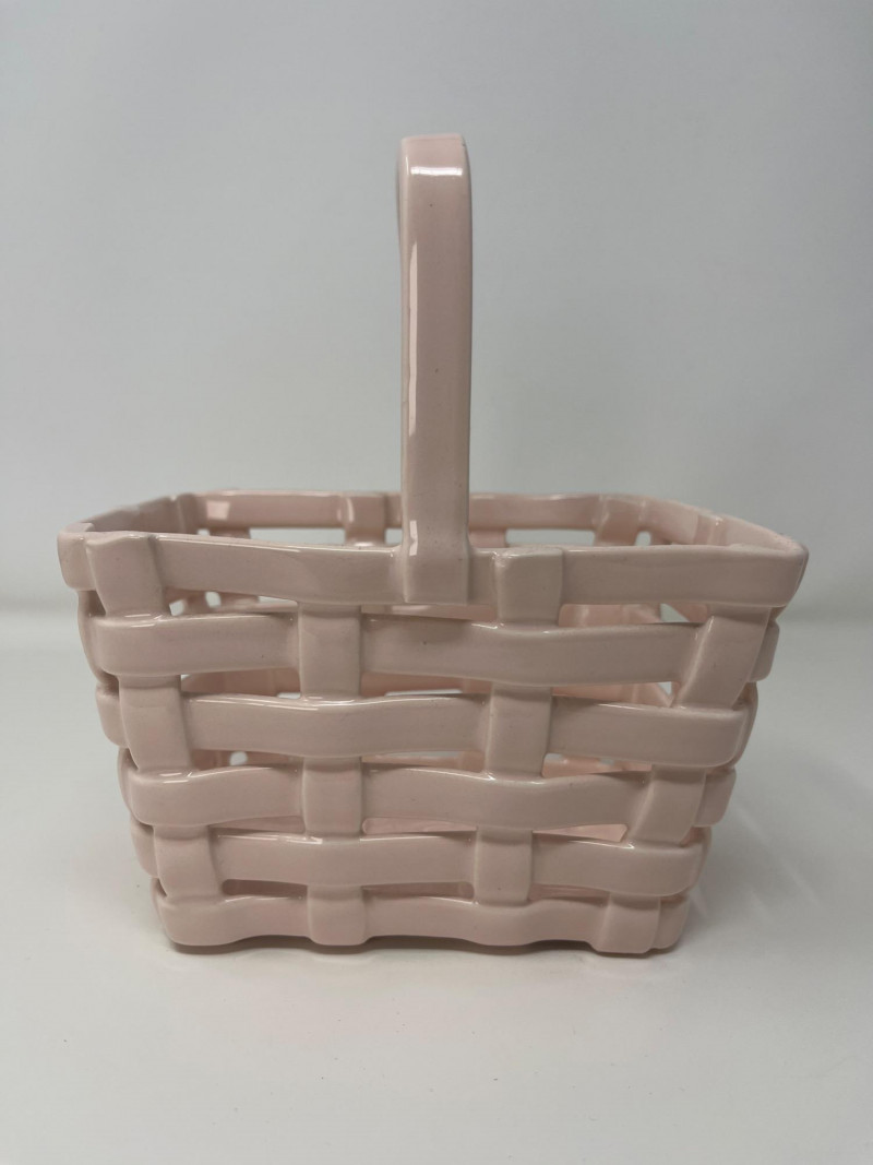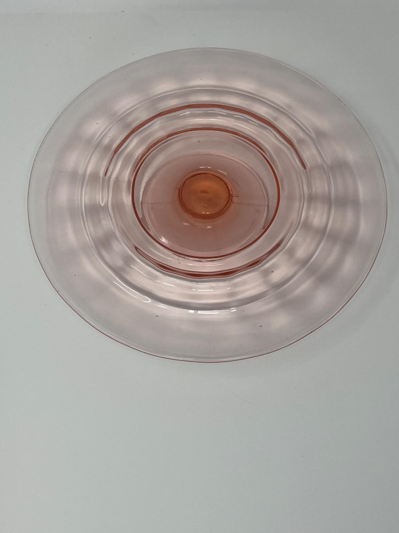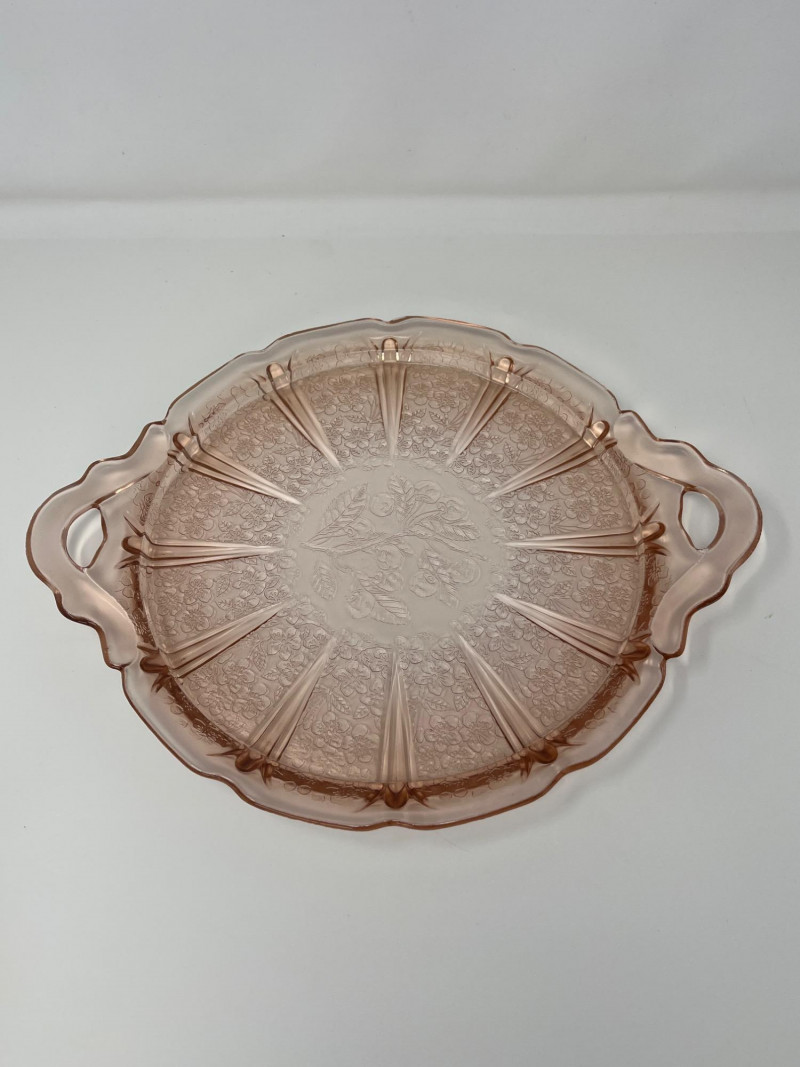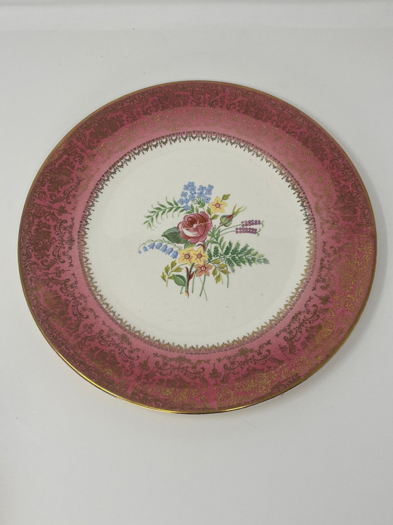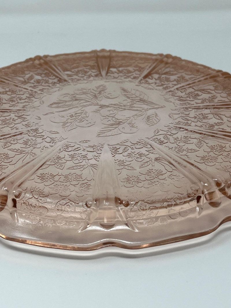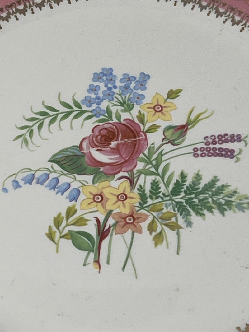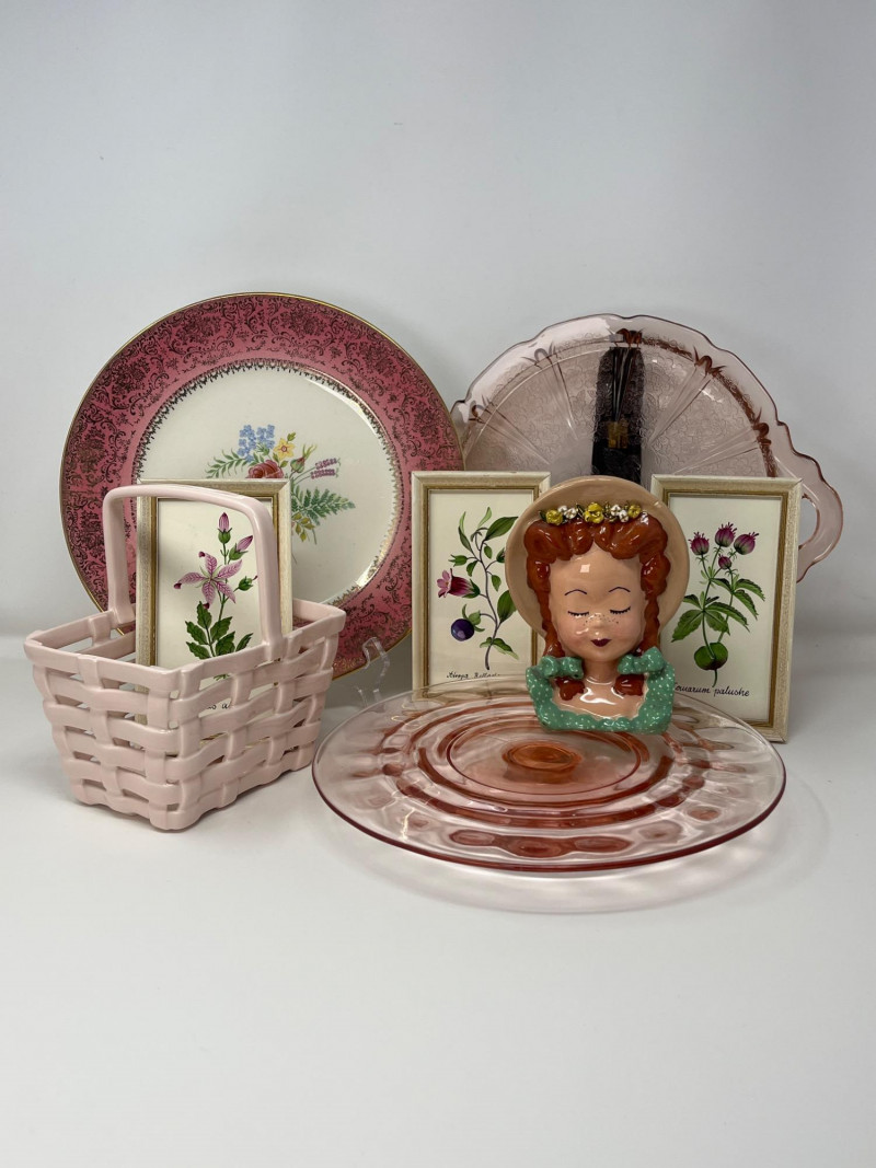 Pretty in Pink Collection Vintage grouping featuring floral patterns, pink depression glass, and pastel ceramics. Includes a ceramic plate with pink and gold rim marked "Imperial Salem 22K Gold" (10" wide), a pink depression glass handled plate by Jeanette Glass Co in the Cherry Blossom pattern (12 1/2" wide with handles), and a low pink glass cake stand (10 1/4" wide, 1" high). Also included are a ceramic head vase with visible repair (6" high), a pink ceramic woven basket, and a set of three framed botanical prints.