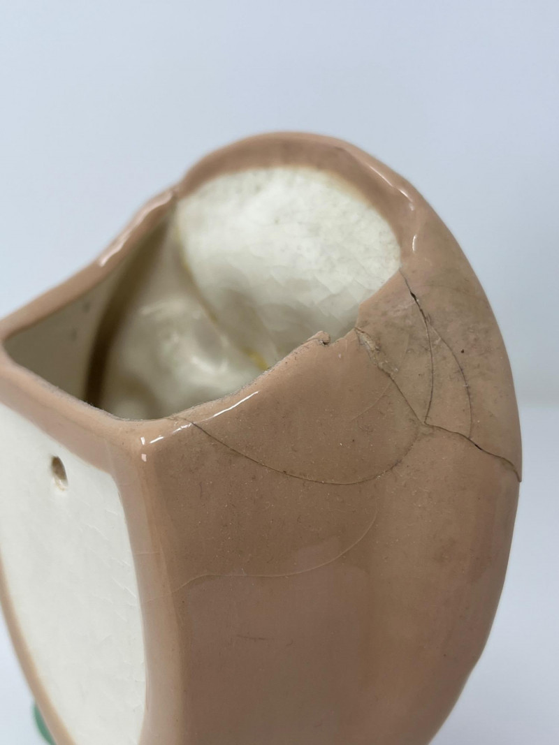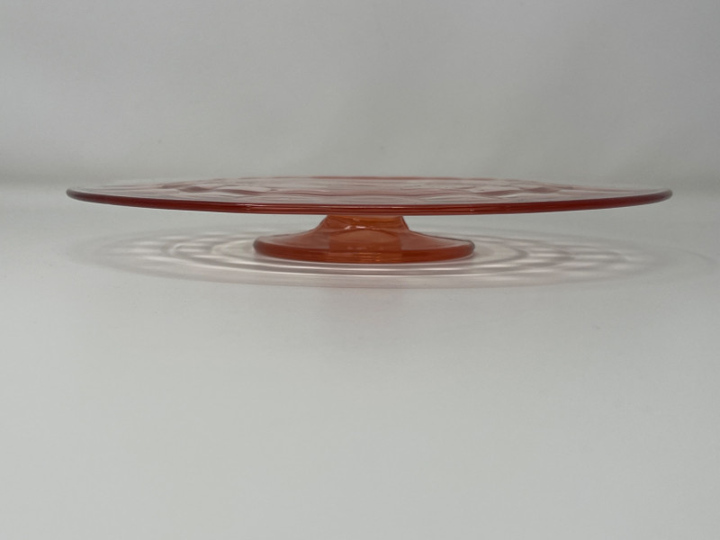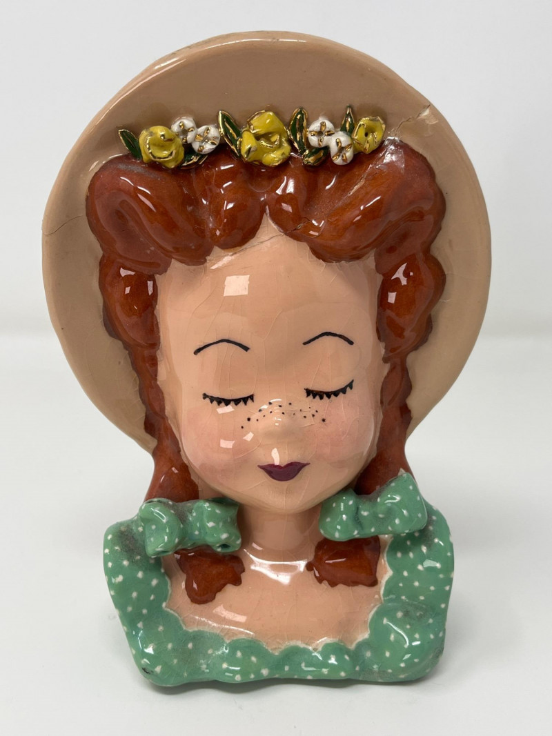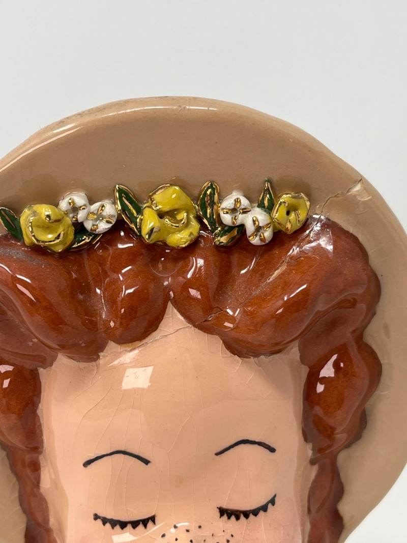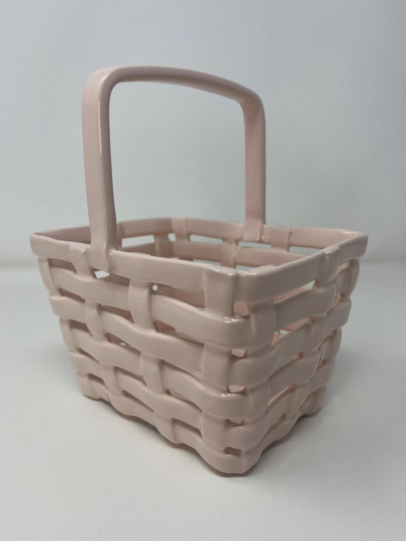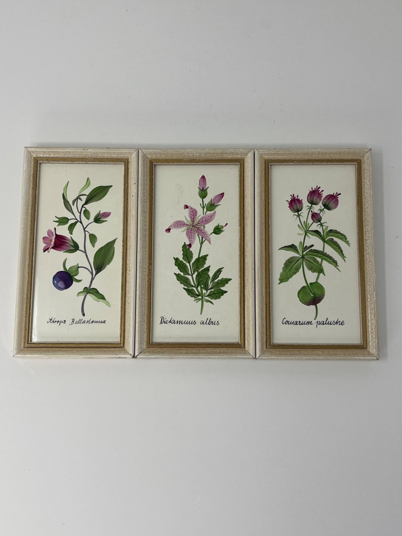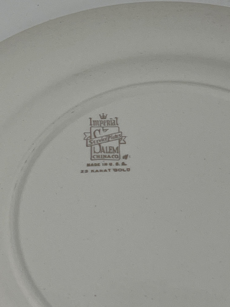 Pretty in Pink Collection Vintage grouping featuring floral patterns, pink depression glass, and pastel ceramics. Includes a ceramic plate with pink and gold rim marked "Imperial Salem 22K Gold" (10" wide), a pink depression glass handled plate by Jeanette Glass Co in the Cherry Blossom pattern (12 1/2" wide with handles), and a low pink glass cake stand (10 1/4" wide, 1" high). Also included are a ceramic head vase with visible repair (6" high), a pink ceramic woven basket, and a set of three framed botanical prints.