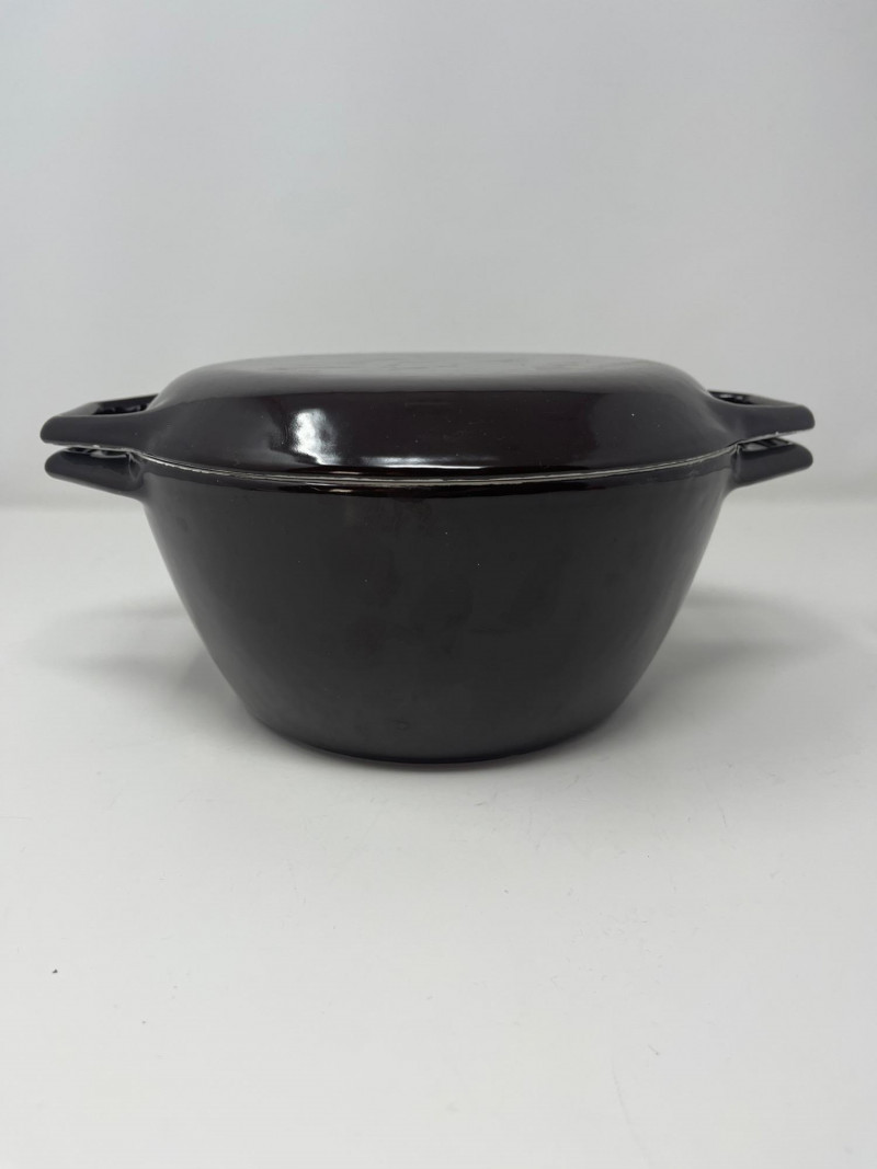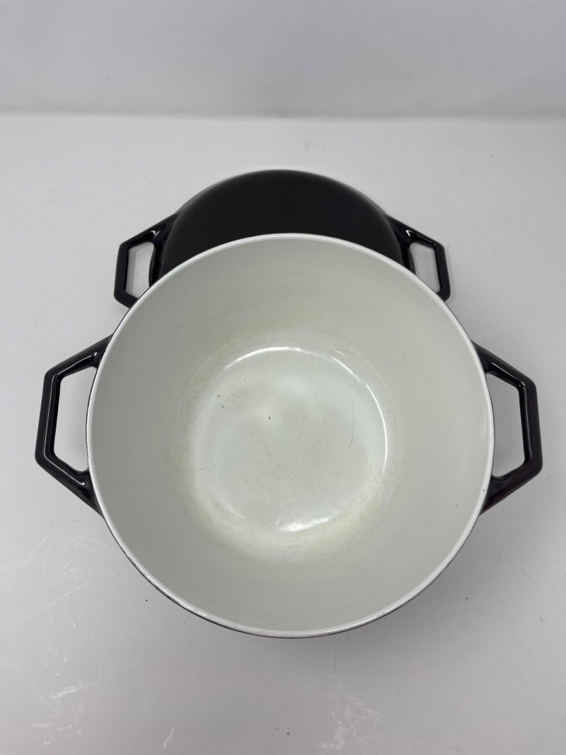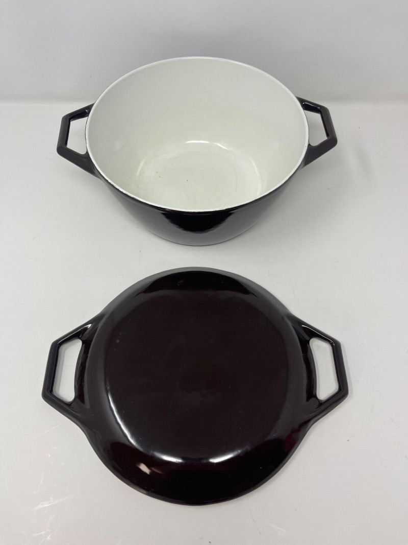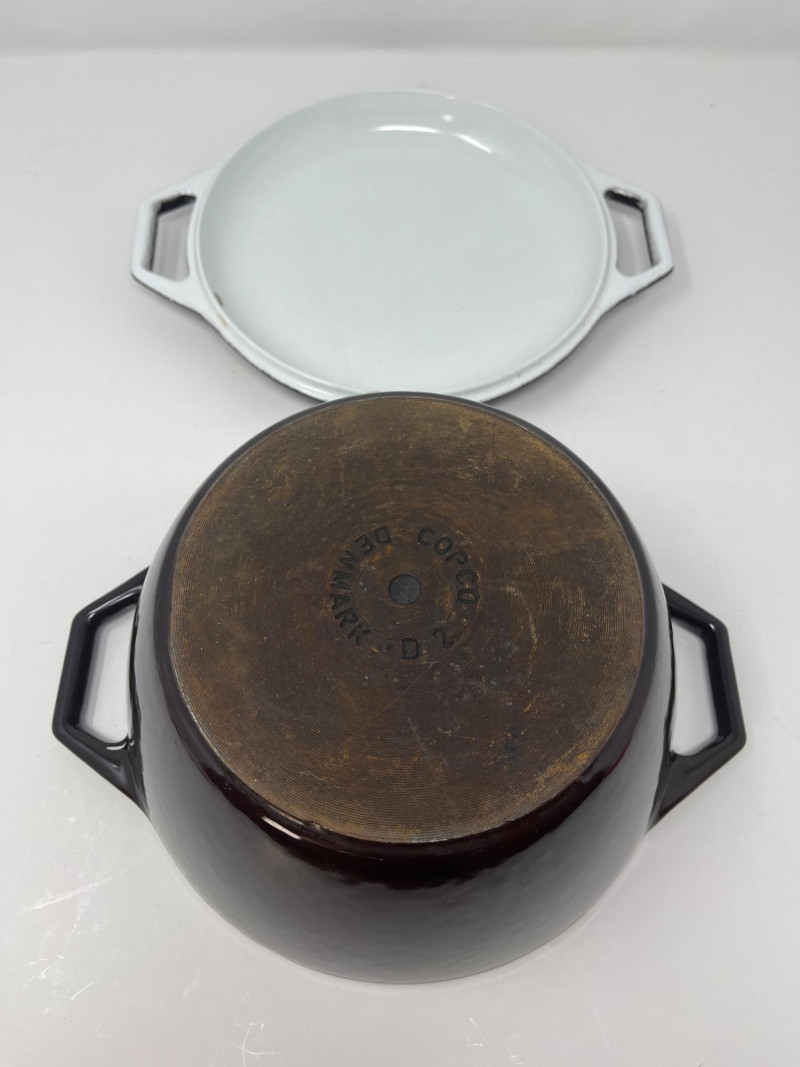 Vintage Copco Cast Iron Dutch Oven Cast iron Dutch oven with enamel coating, designed by Copco of Denmark. Features a white enameled interior and side handles for lifting. Marked "Copco Denmark D2" on the base. Dimensions: 10 1/4" across (handle to handle), 5" tall (including lid)