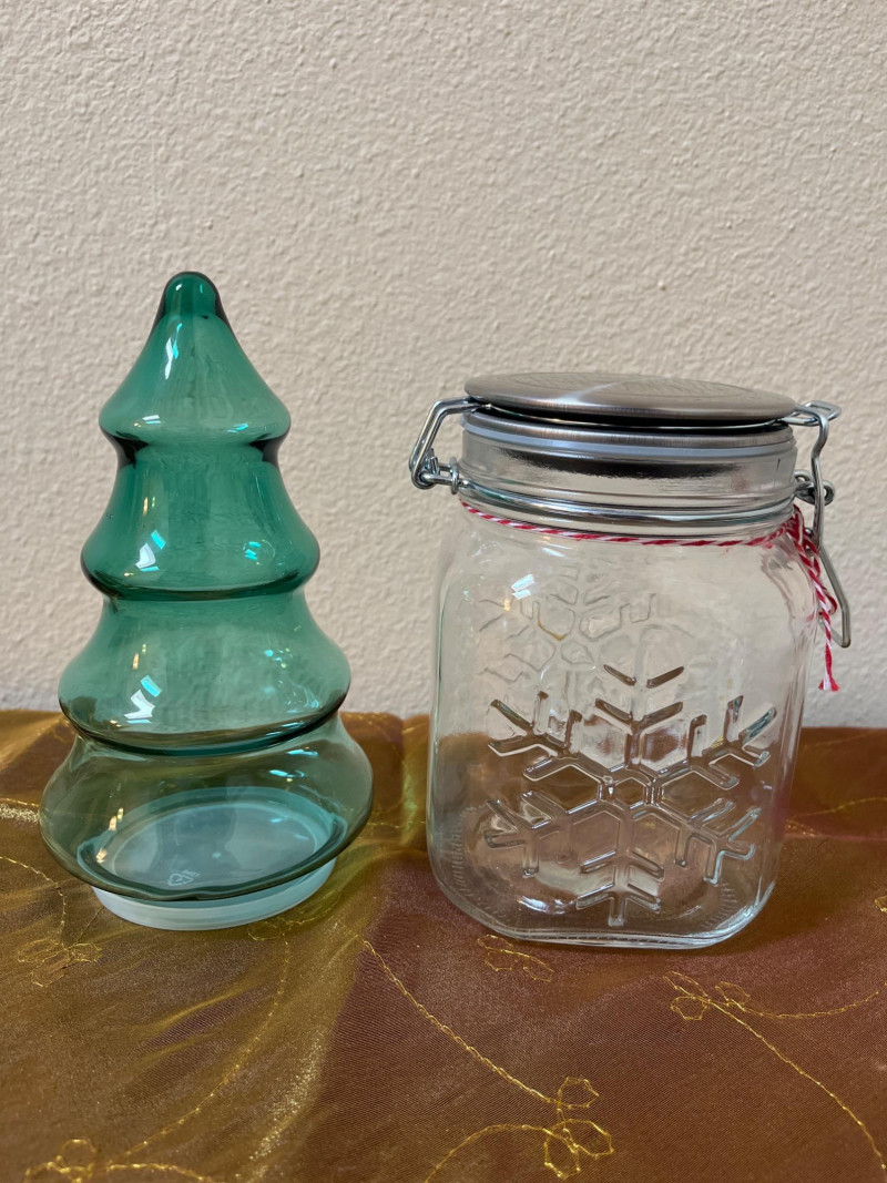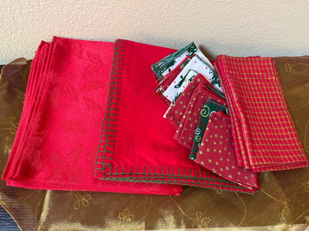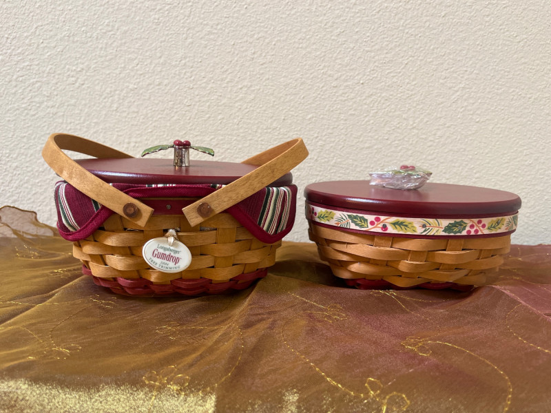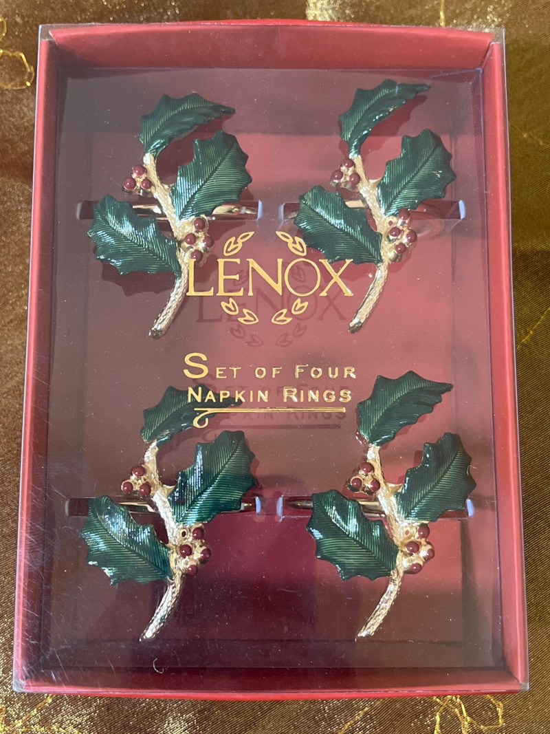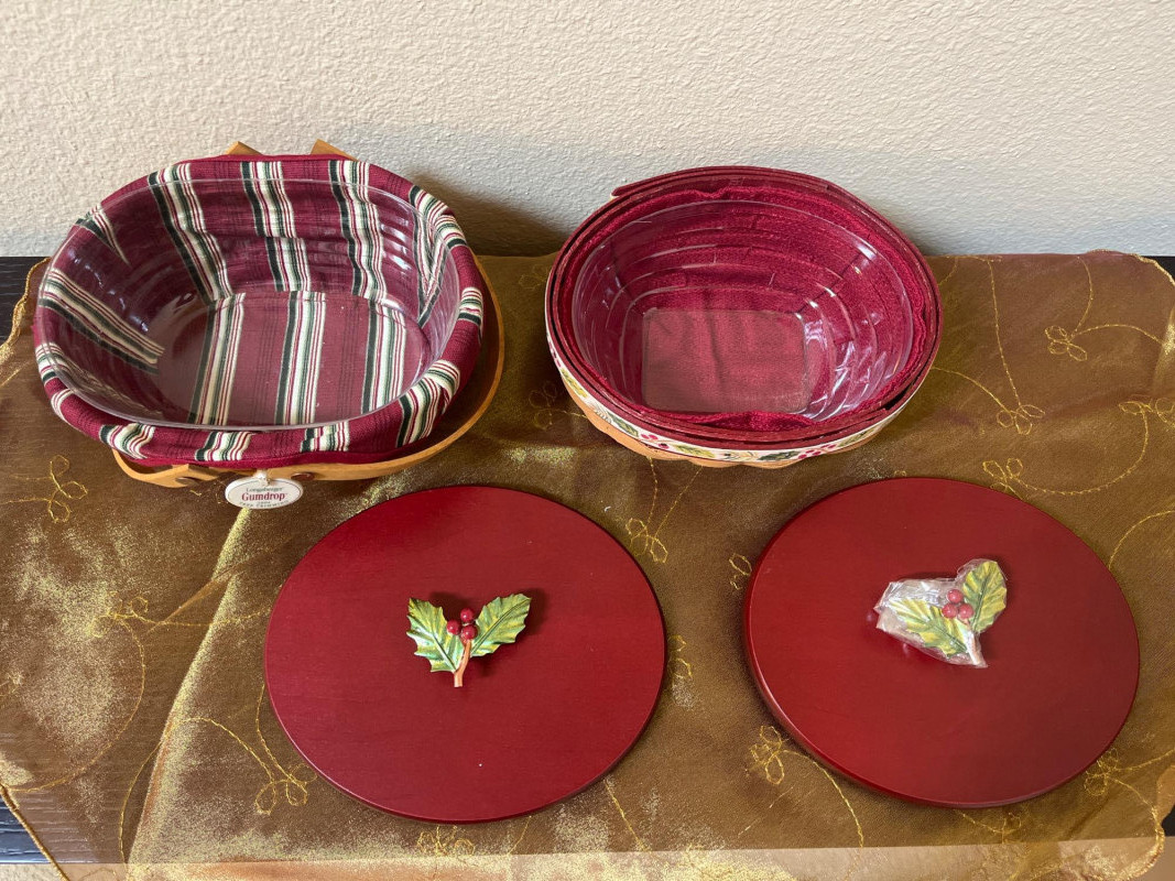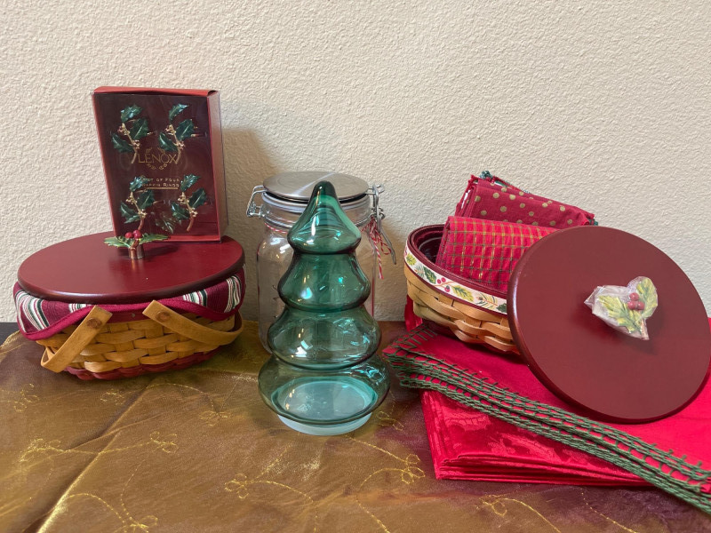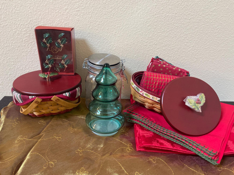 Longaberger Baskets, Lenox Napkin Rings & Christmas Décor Set Holiday-themed group including two Longaberger baskets with red lids (dated 2004 and 2011), both with holly accents. Set of four Lenox holly-patterned napkin rings in original box. Also includes red and holiday-print cloth napkins, a green glass tree-shaped container, a clear glass jar with snowflake embossing, and assorted Christmas table linens.