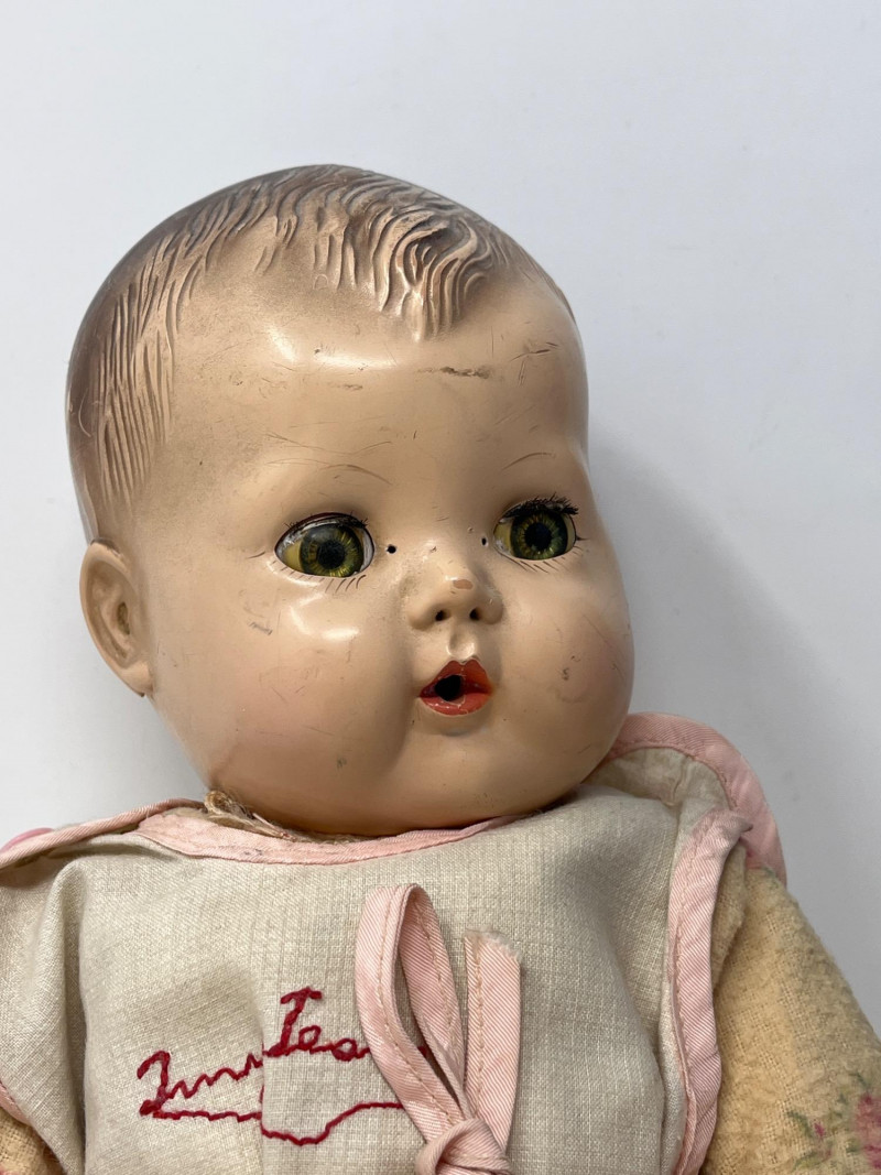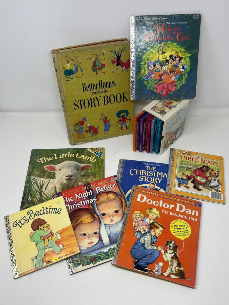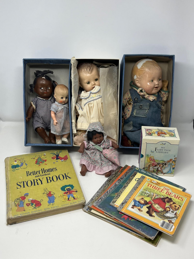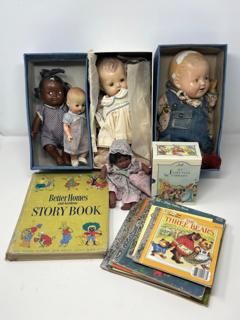 Antique Dolls and Vintage Children's Book Collection Collection includes five antique composition dolls in varied sizes and condition, some with original clothing and boxed packaging. Accompanied by a group of vintage children's books including Better Homes and Gardens Story Book (1950), Doctor Dan, The Three Bears, several Little Golden Books, and a complete Fairy Tale Library set.
