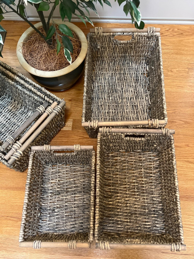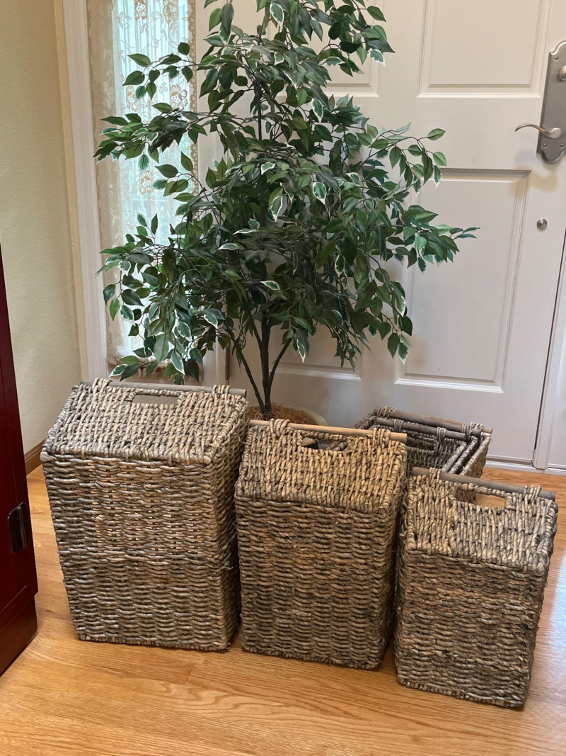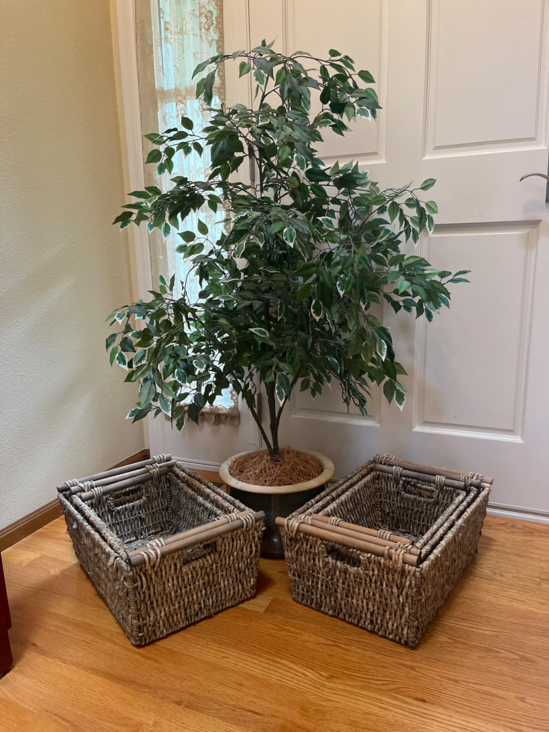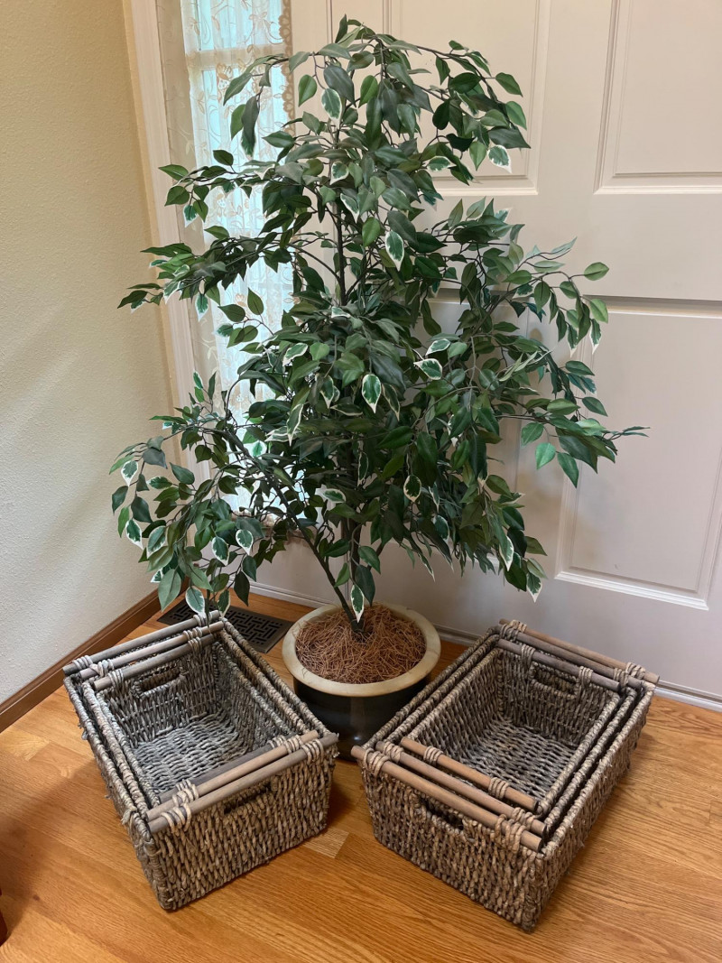 4' Faux Ficus Tree with 2 Sets of Nesting Woven Baskets This decorative set includes a 4-foot tall faux ficus tree in a ceramic-style pot and two identical sets of handwoven nesting baskets. Each set contains three rectangular baskets made of natural materials with sturdy wood-accented handles. The largest basket measures approximately 18" x 13" x 8".