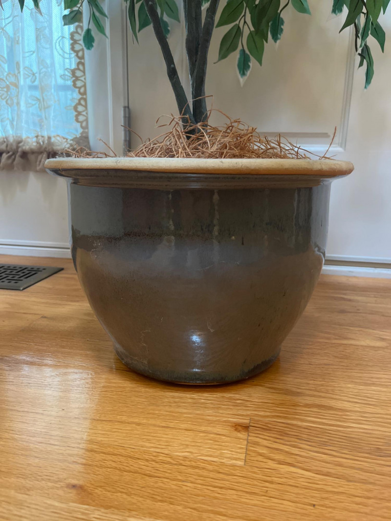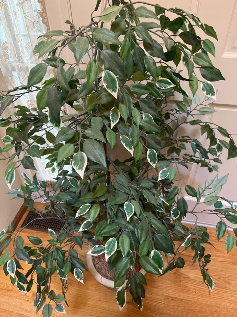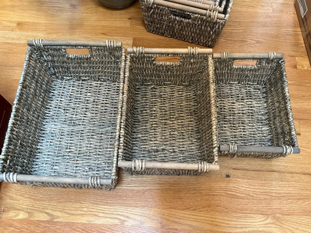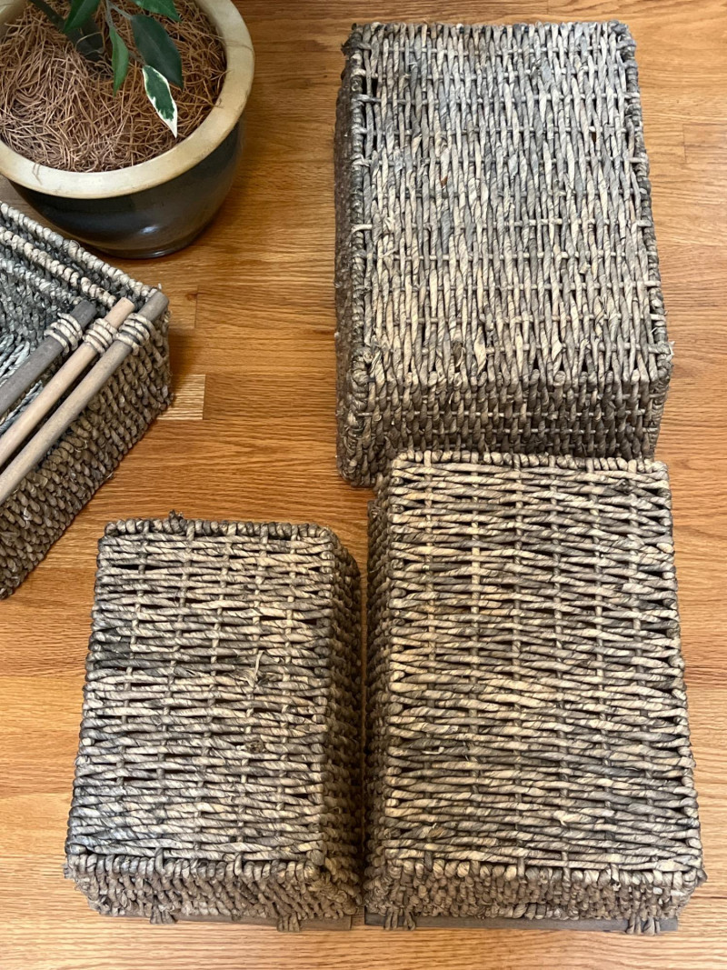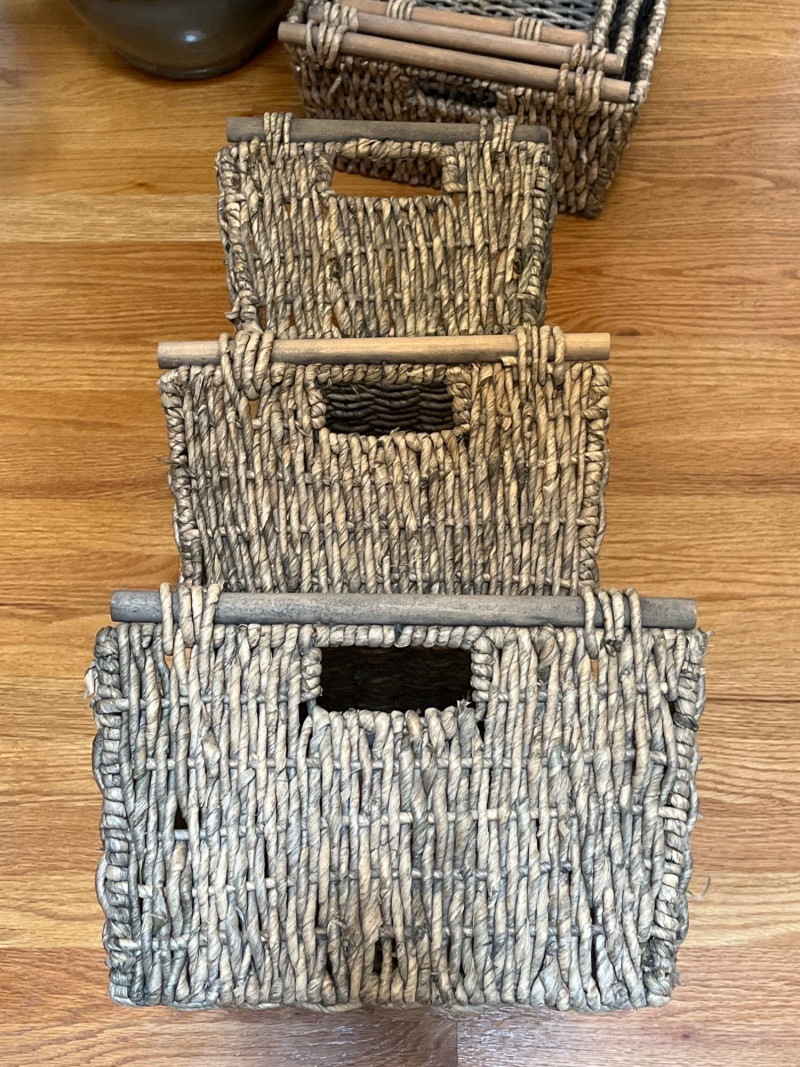 4' Faux Ficus Tree with 2 Sets of Nesting Woven Baskets This decorative set includes a 4-foot tall faux ficus tree in a ceramic-style pot and two identical sets of handwoven nesting baskets. Each set contains three rectangular baskets made of natural materials with sturdy wood-accented handles. The largest basket measures approximately 18" x 13" x 8".
