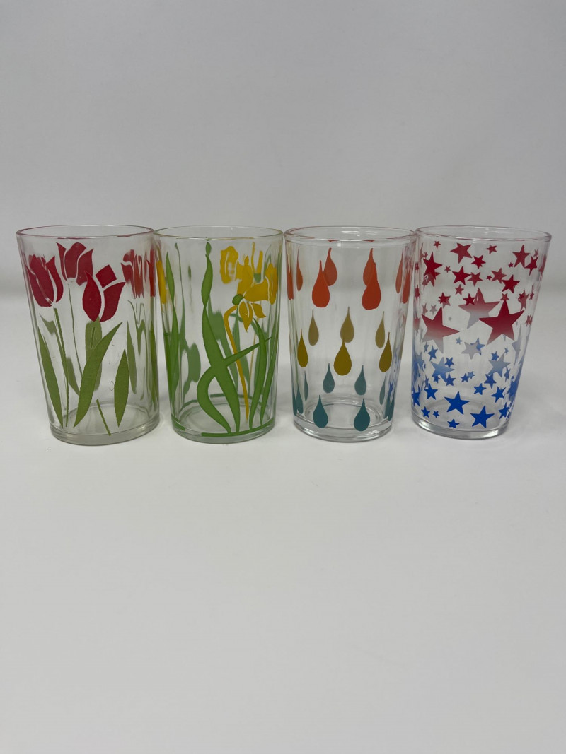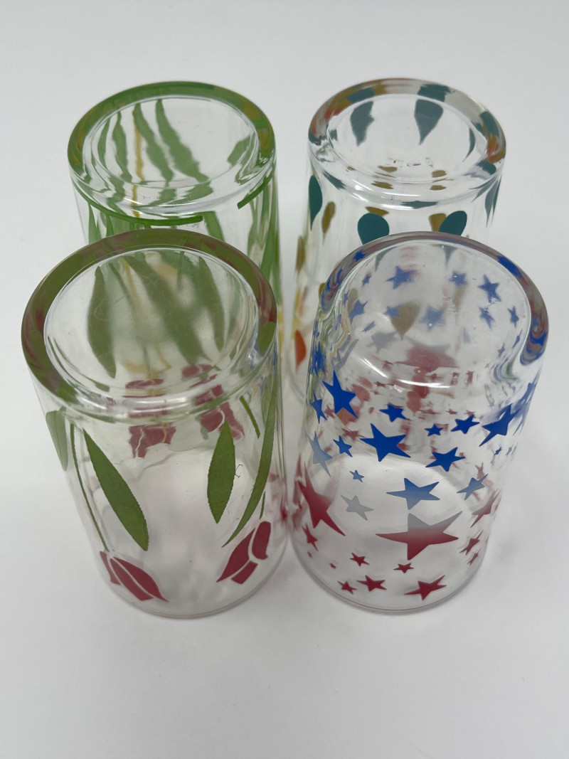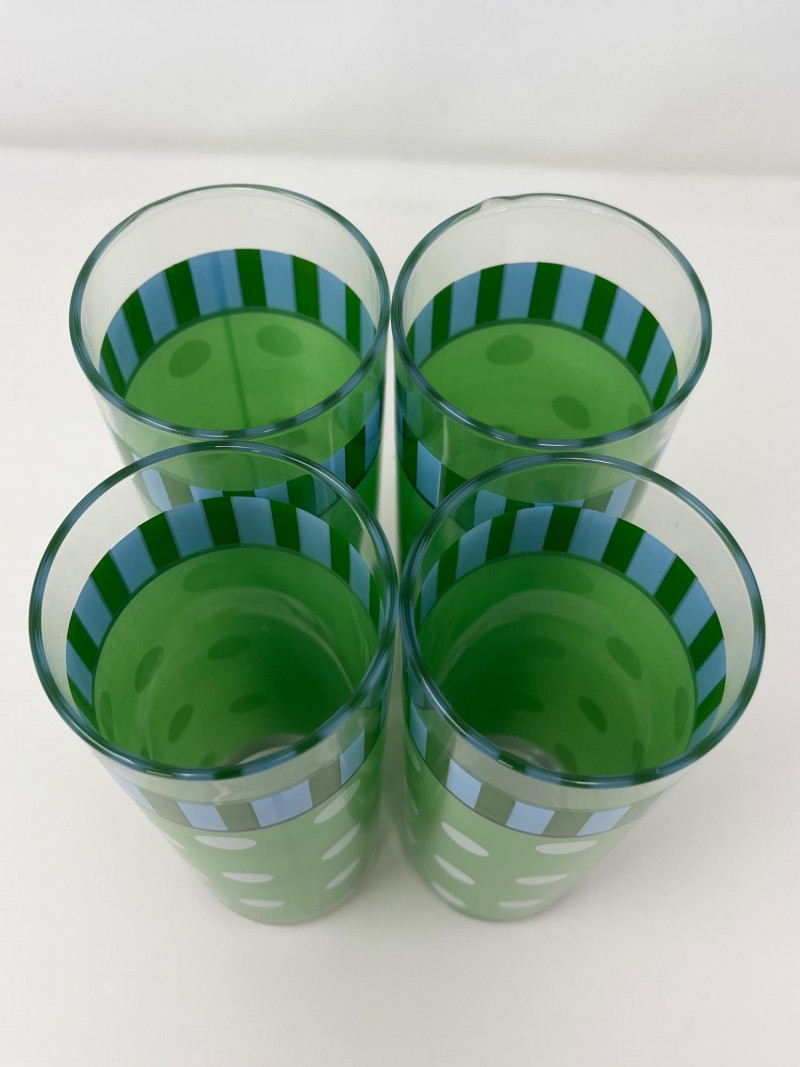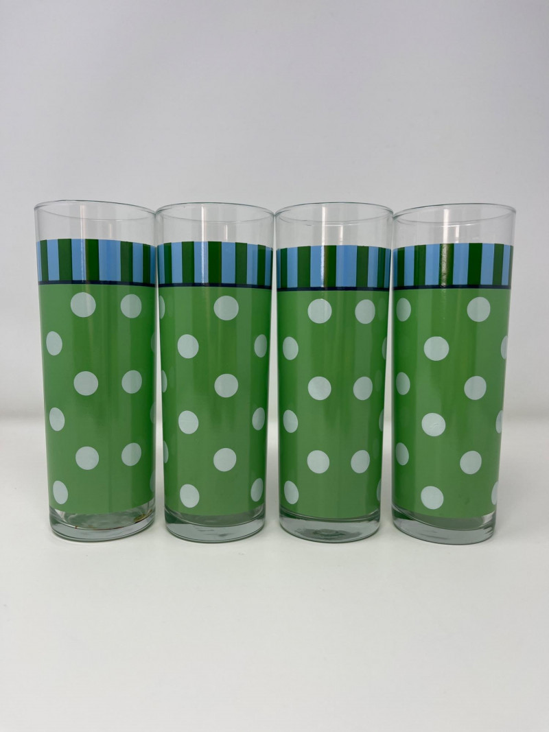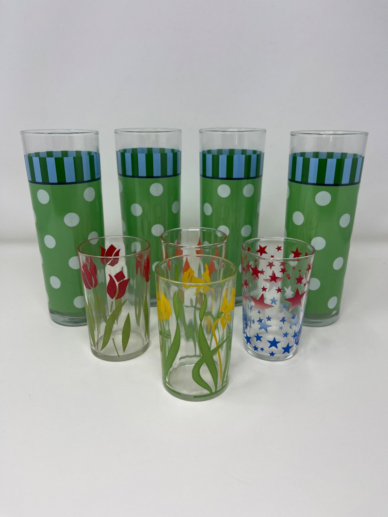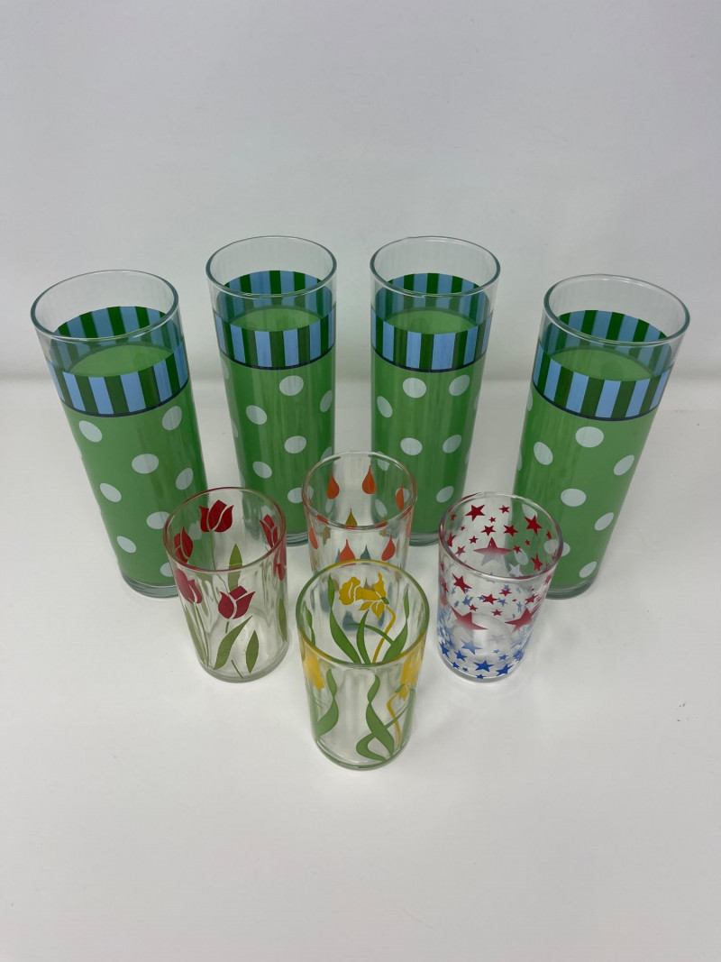 Vintage Drinking Glass Set – Southern Living & Hazel Atlas Mixed lot of vintage drinking glasses from Southern Living and Hazel Atlas. Includes five 7" tall Tom Collins glasses with green and white polka dot bodies and blue-green striped rims (Southern Living), and four 3.5" juice glasses with tulip, star, and teardrop patterns in red, yellow, orange, and blue.