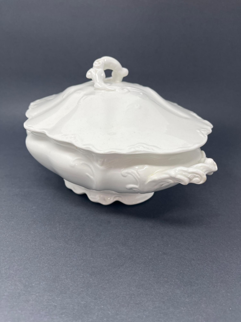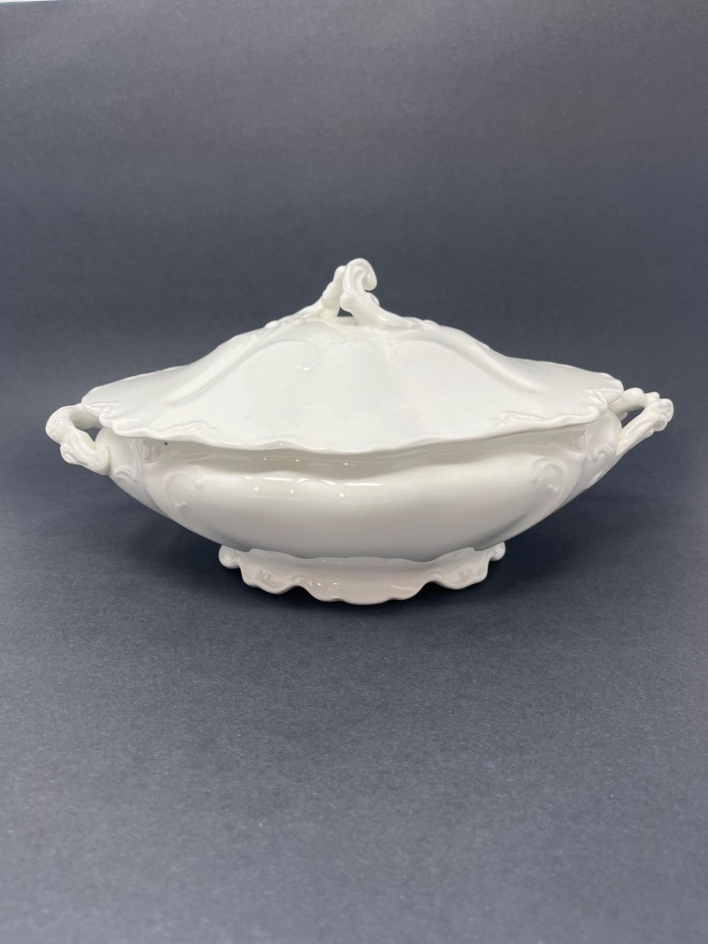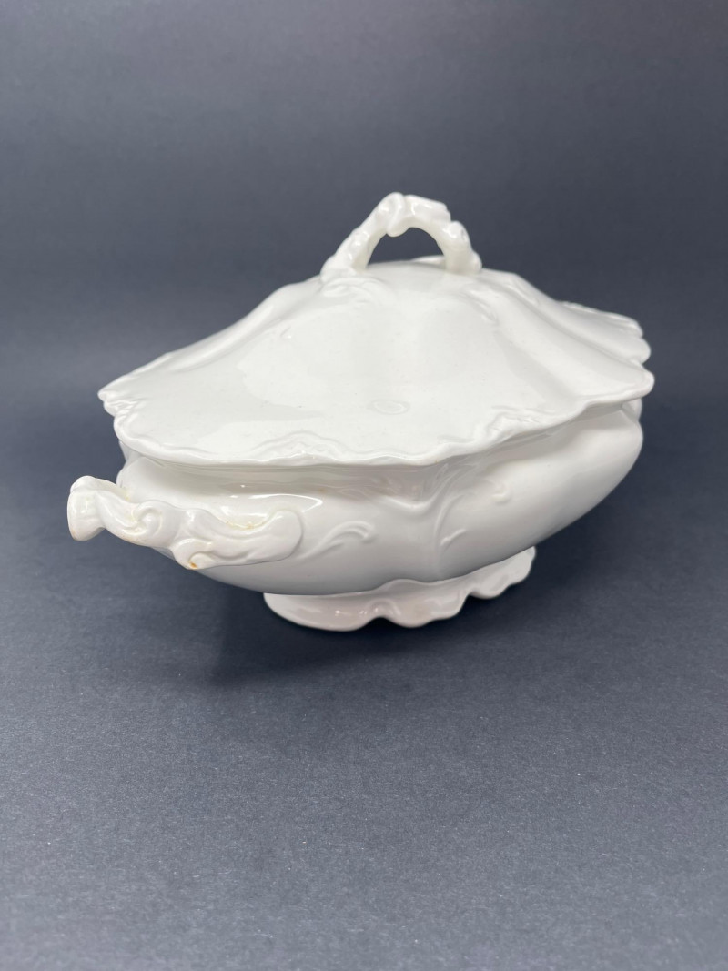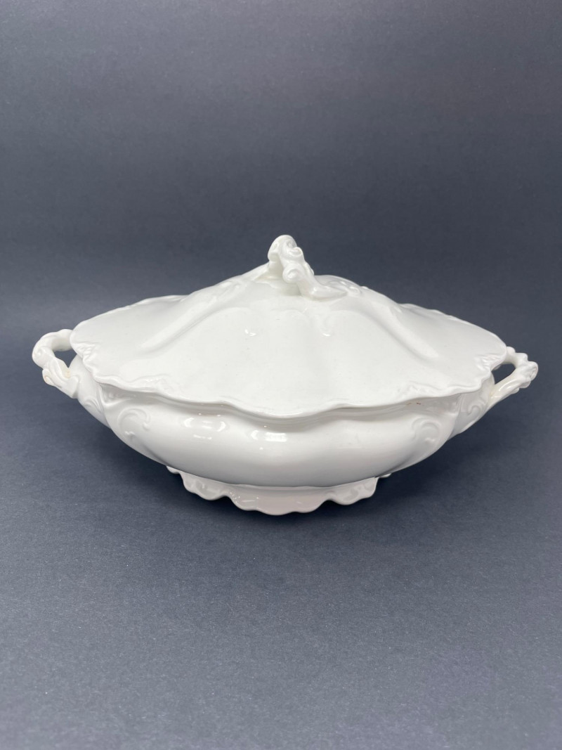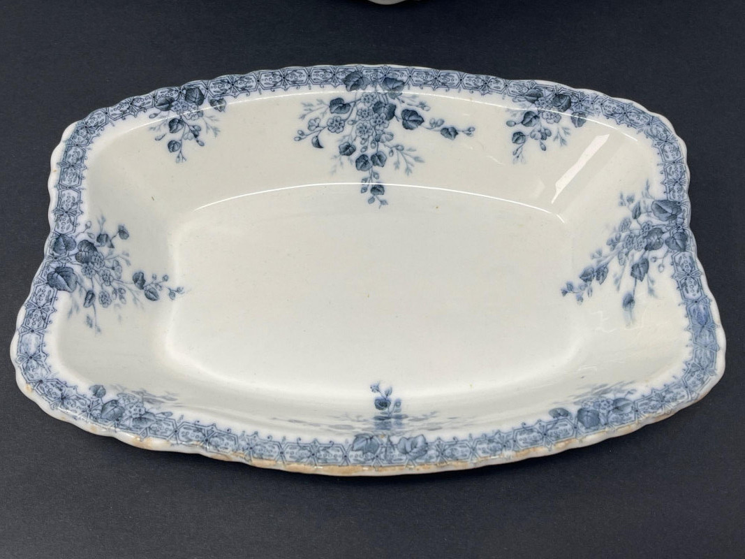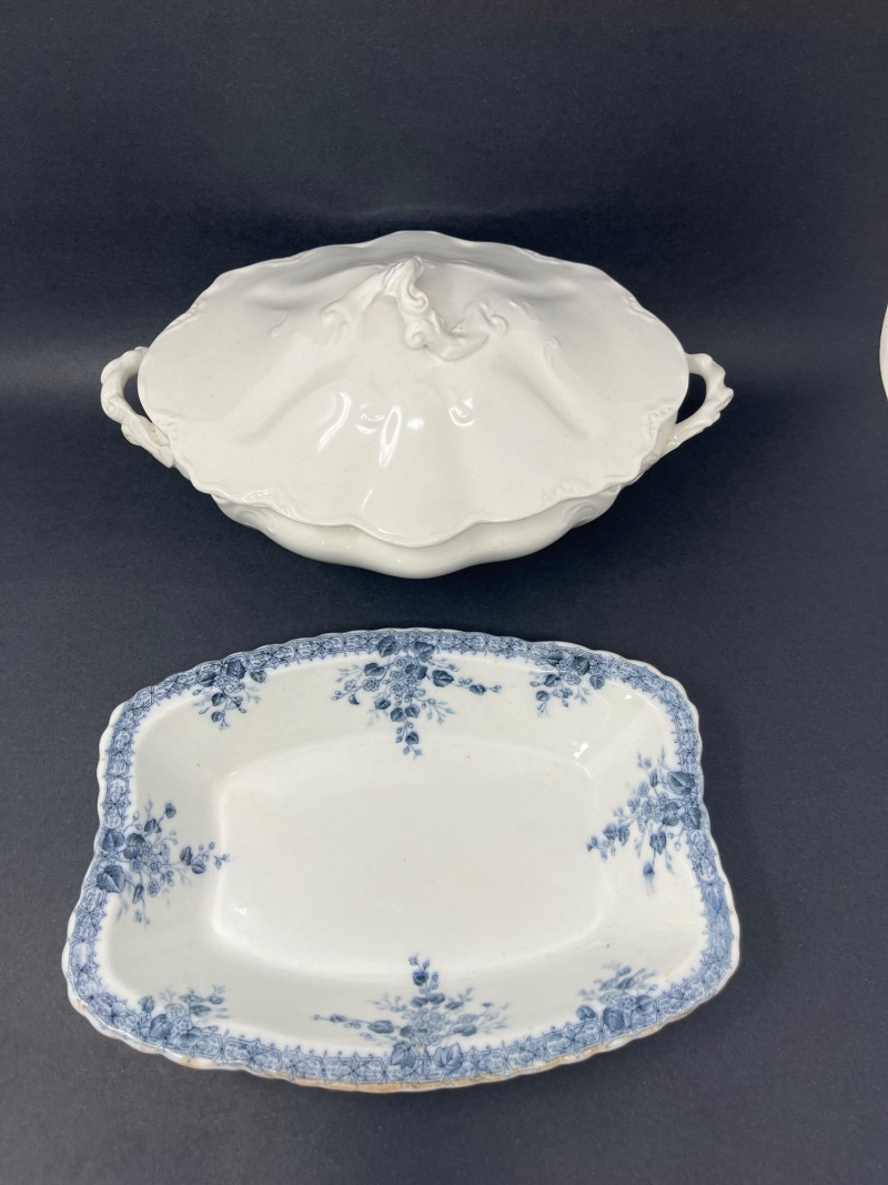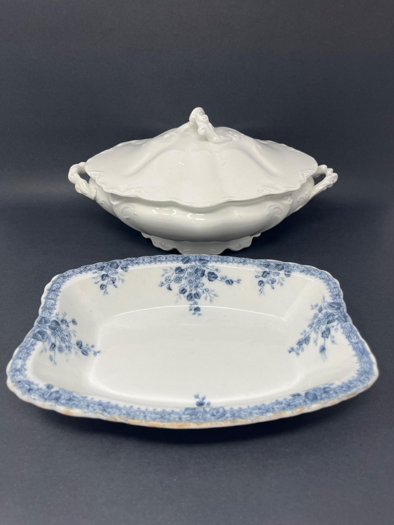 Set of Two Antique Serving Pieces – Blue Transferware Dish & White Covered Tureen This antique set includes a blue and white transferware serving bowl and a white semi-porcelain covered tureen.