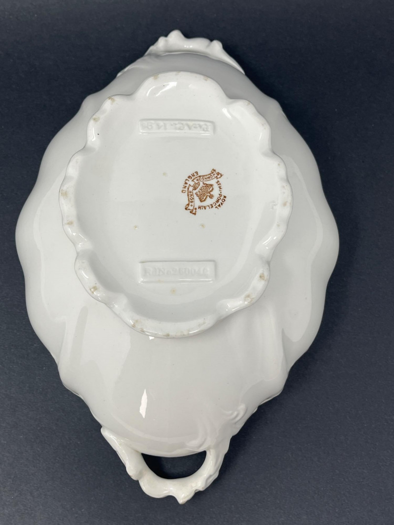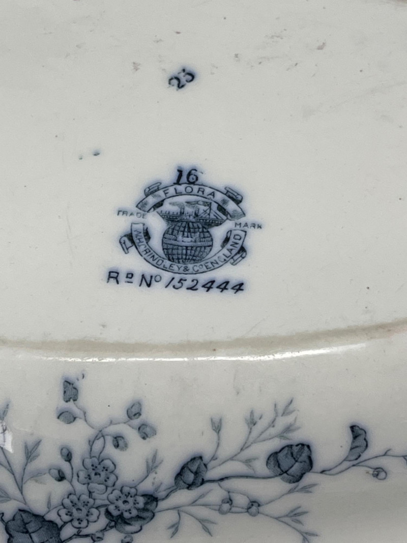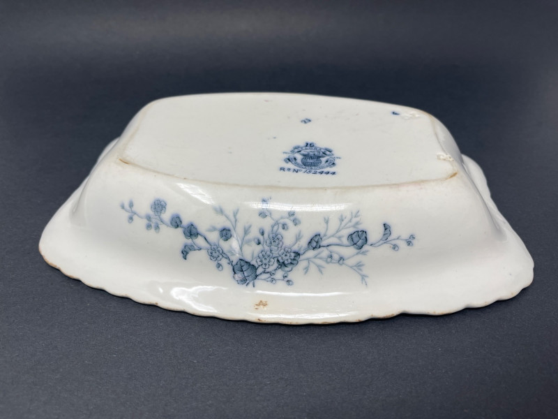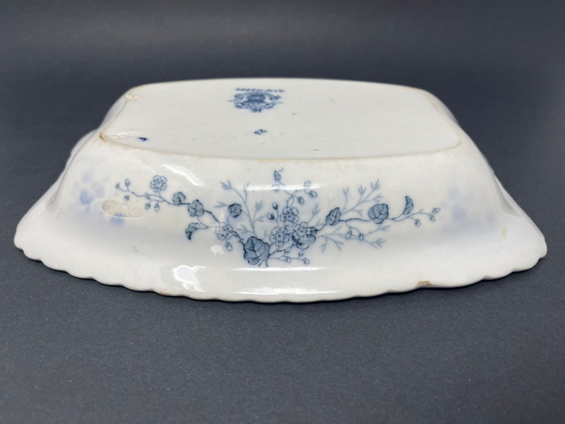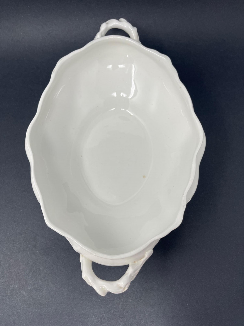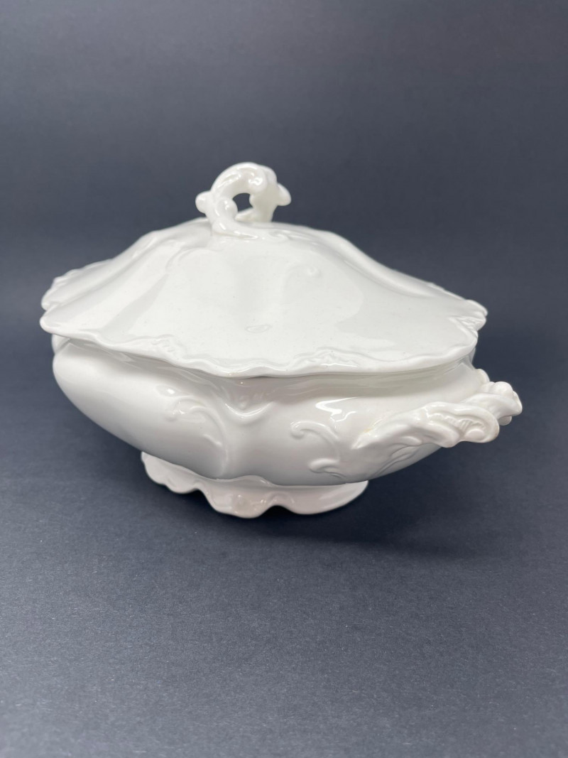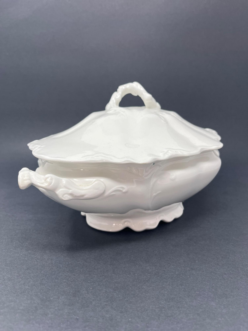 Set of Two Antique Serving Pieces – Blue Transferware Dish & White Covered Tureen This antique set includes a blue and white transferware serving bowl and a white semi-porcelain covered tureen.