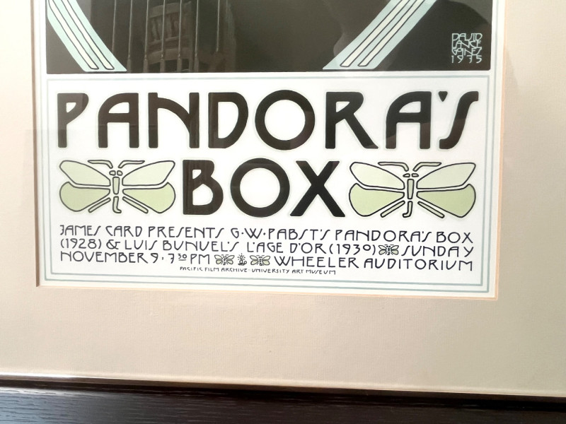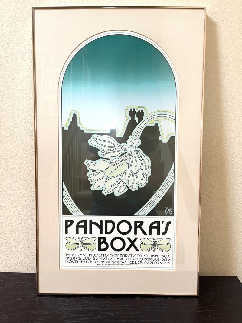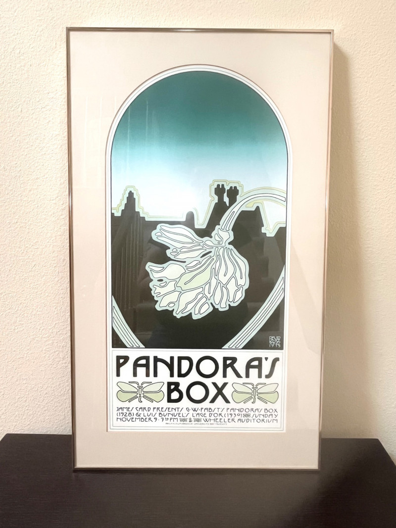 Pandora’s Box Framed Art Print Framed print in Art Nouveau style promoting a double feature of Pandora’s Box (1928) by G.W. Pabst and L’Age d’Or(1930) by Luis Buñuel. The design features stylized typography, a pale green and black color scheme, and a flower motif over an architectural background. Event details reference a 1975 screening at Wheeler Auditorium, presented by James Card and the Pacific Film Archive, University Art Museum. Framed with a metal edge and hanging wire on the back.