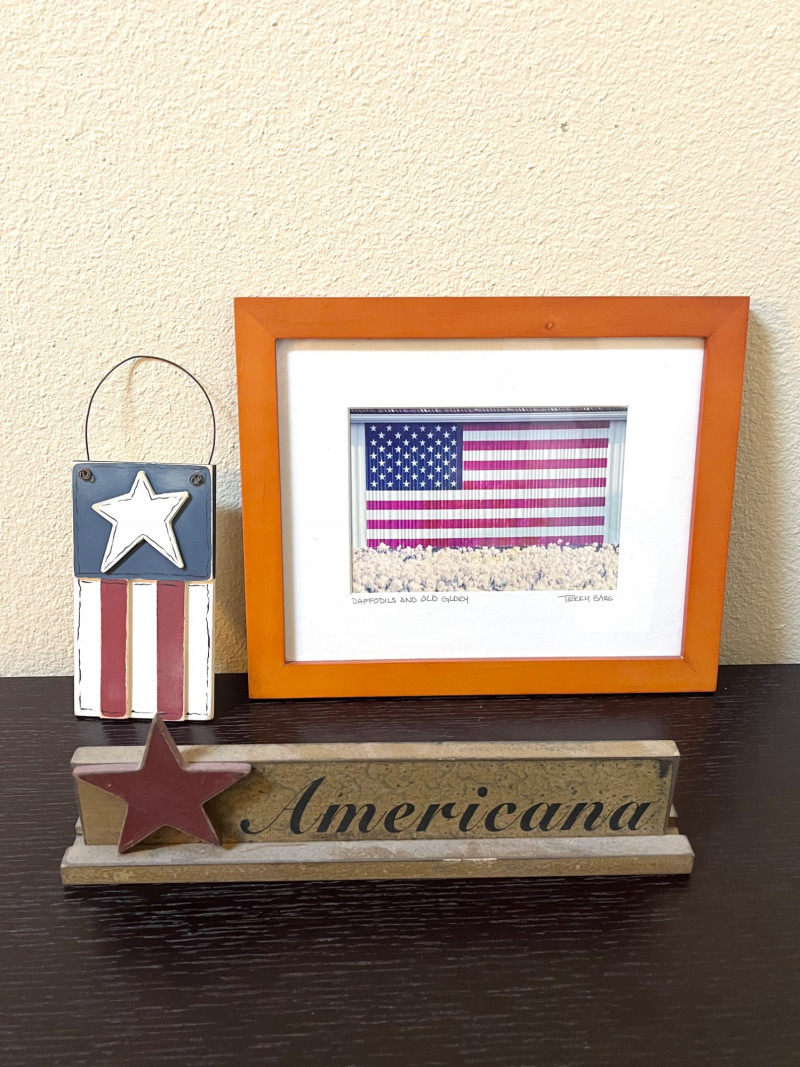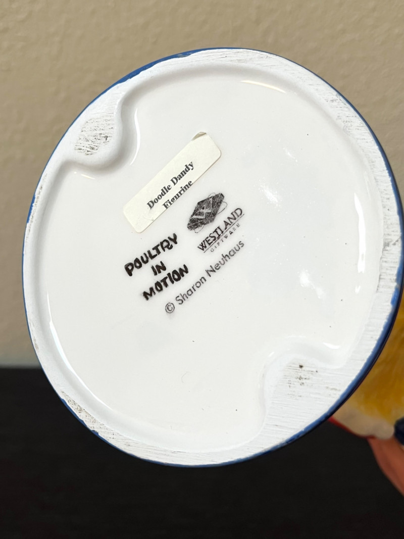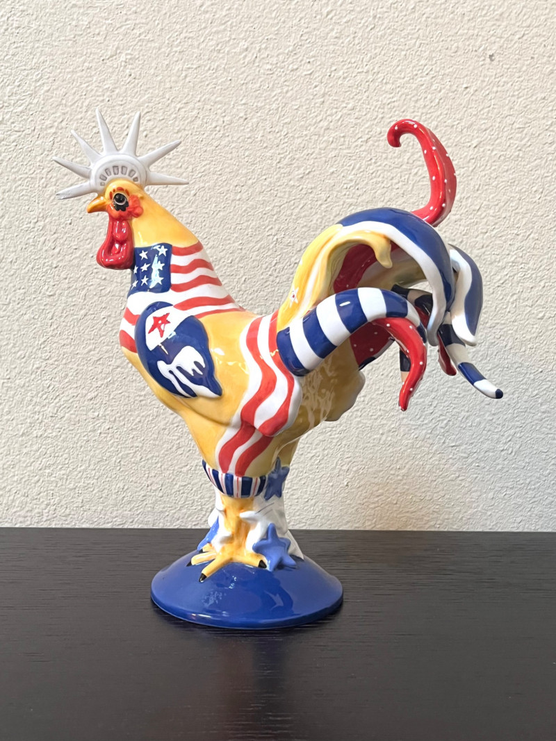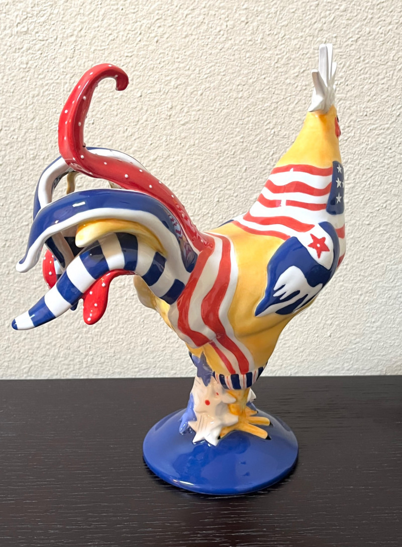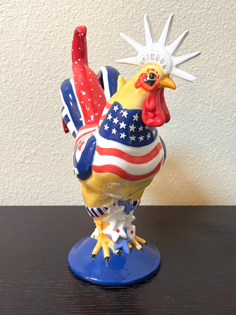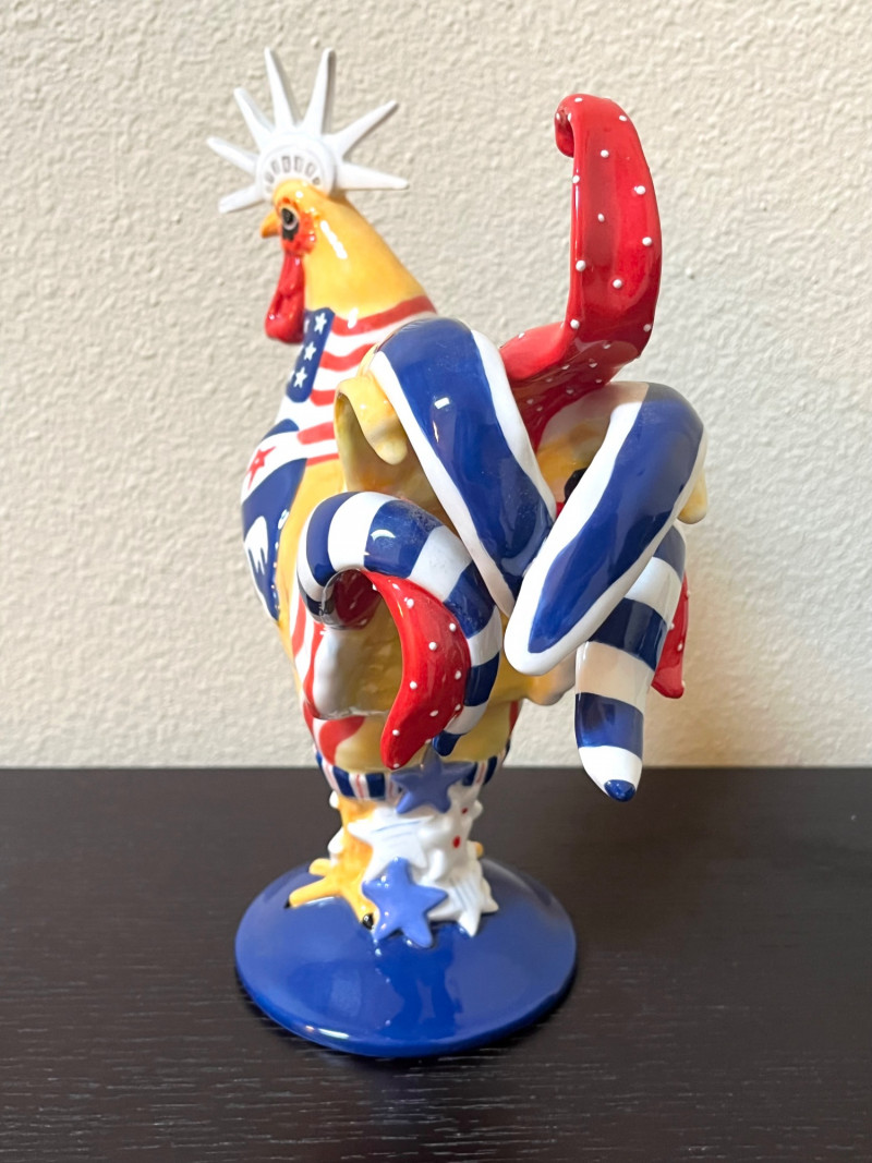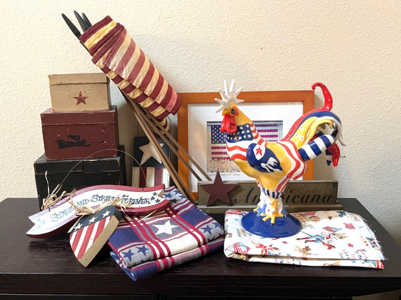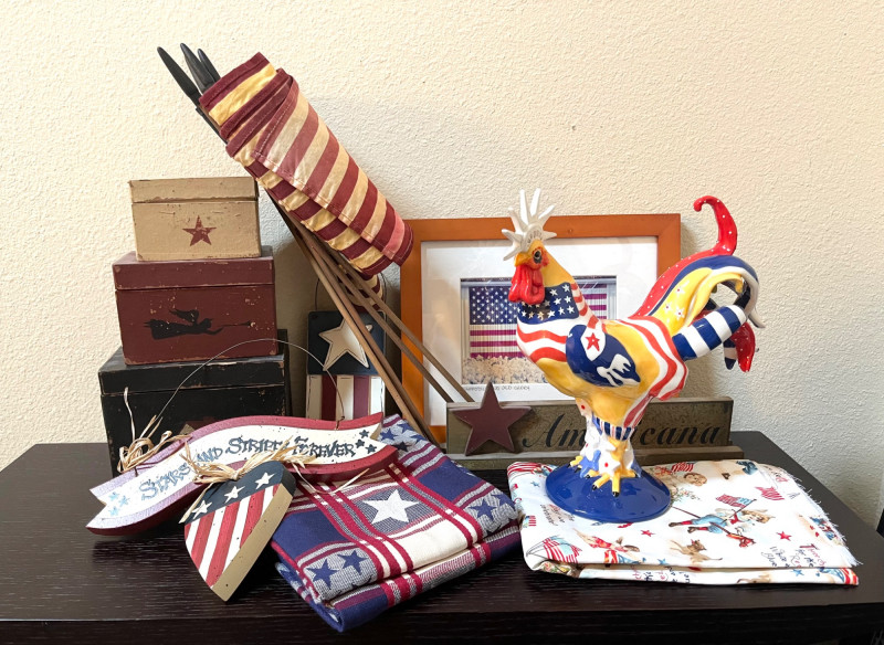 Americana Decor Lot with “Doodle Dandy” Rooster by Sharon Neuhaus This is a collection of Americana-themed decor items. Includes the “Doodle Dandy” rooster figurine from the Poultry in Motion series by Sharon Neuhaus for Westland Giftware, styled in red, white, and blue. Also included are vintage-style nesting boxes, patriotic fabric napkins, folk-style wall decor, a framed flag print, a fabric banner, and a small rustic flag display.