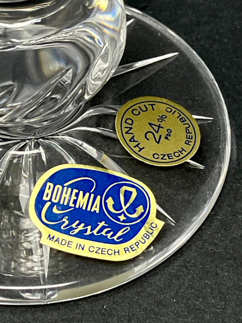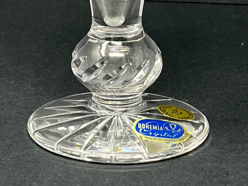 Elegant collection of hand-cut crystal featuring a mix of bowls, vases, and a Waterford compote. The compote, marked Waterford, stands 6" tall with a faceted stem and intricate cuts. The tallest piece is a 10" vase showcasing deep, swirling cutwork and labeled "Bohemia Crystal – Made in Czech Republic." Other pieces include a large floral-cut bowl, a petite footed bowl, and smaller bowls with starburst and geometric patterns.