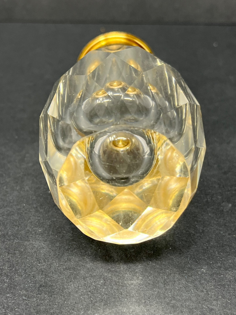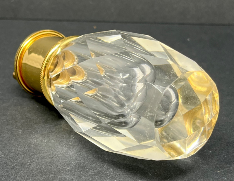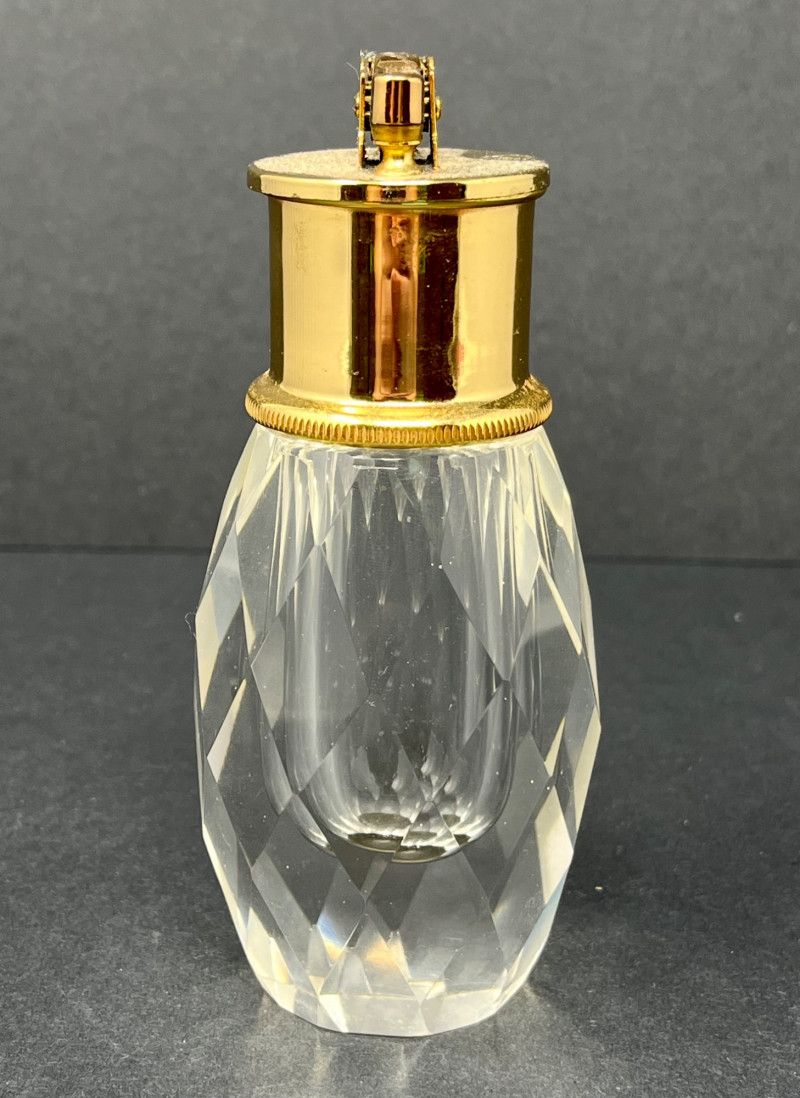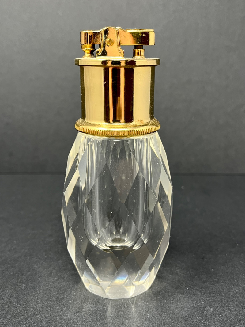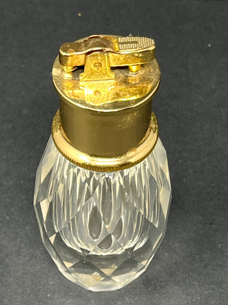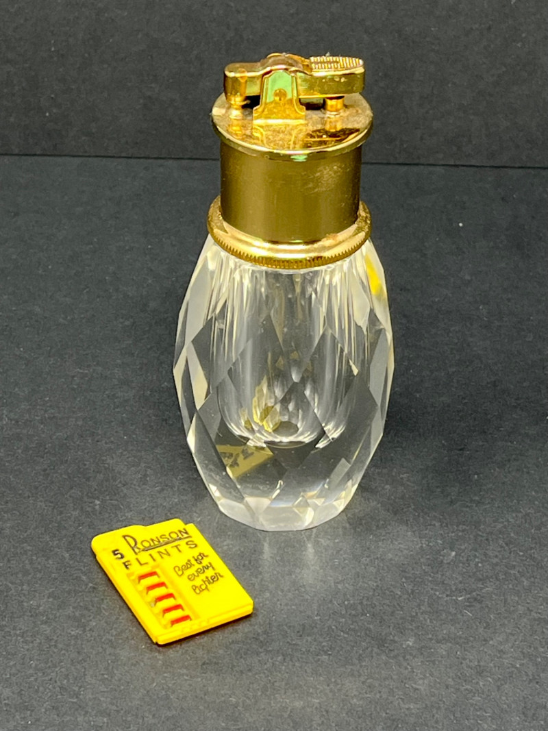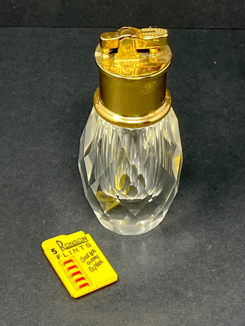 Cut Glass Table Lighter with Ronson Flints Table lighter with a faceted lead crystal base and a gold-tone Ronson lighter top. Stands approximately 5" tall and has substantial weight. Includes a pack of five extra Ronson flints.