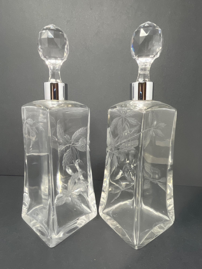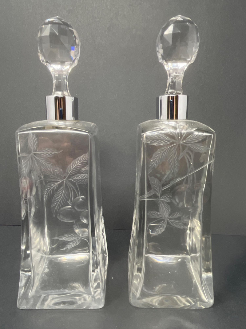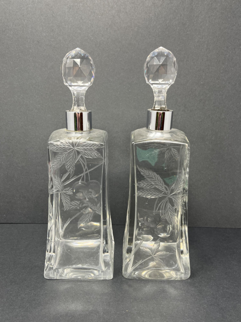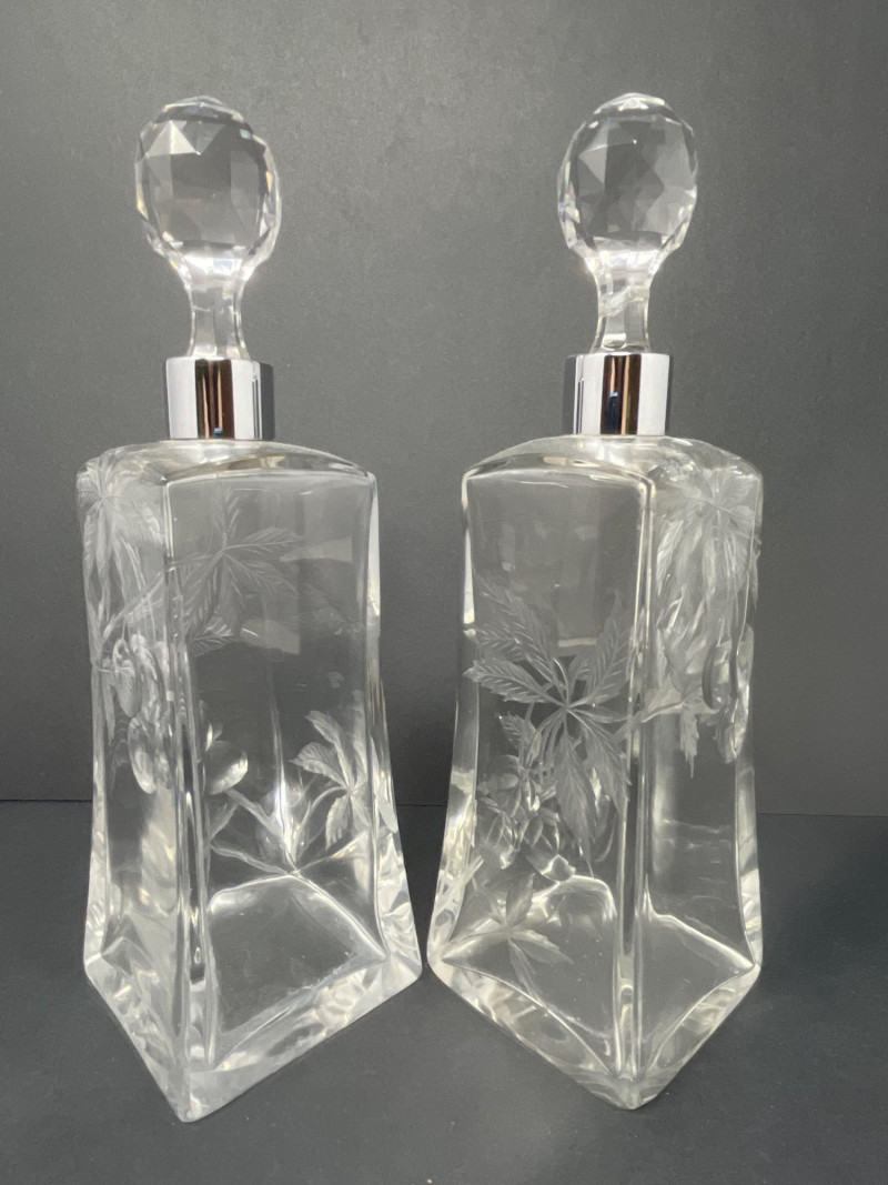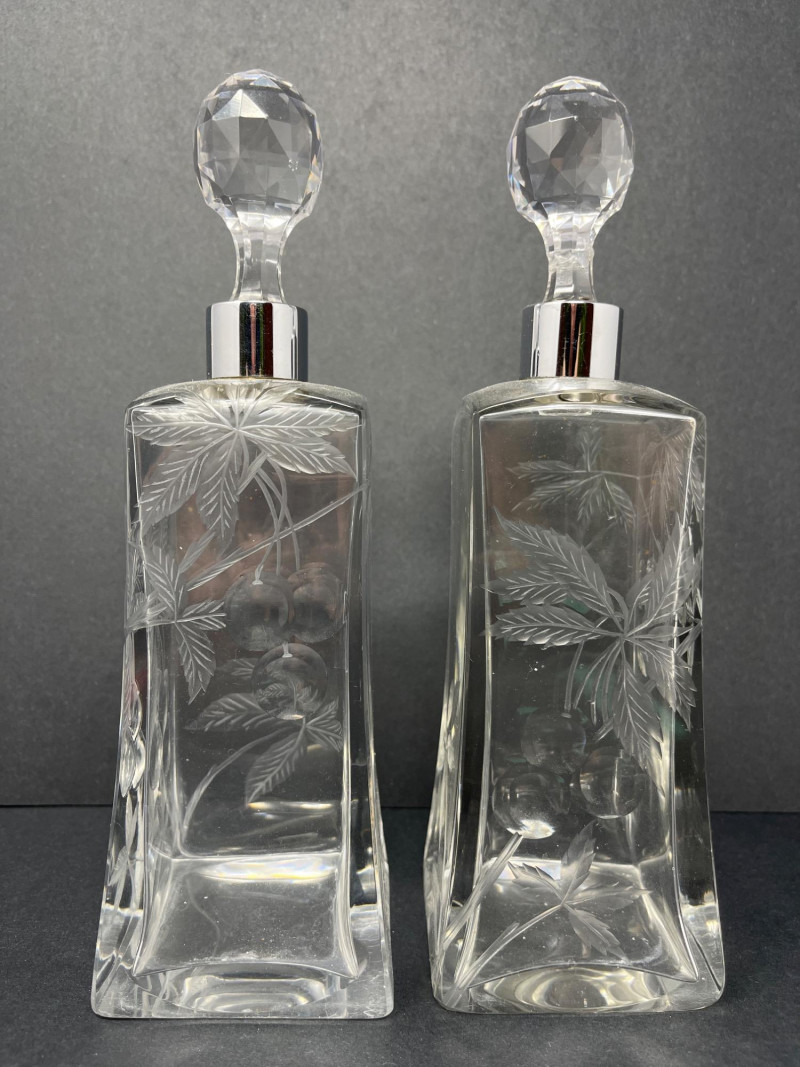 Pair of Baccarat Lead Crystal Decanters with Stoppers Pair of etched lead crystal decanters by Baccarat, each with a tapered square body and faceted stopper marked “B.” Decorated with engraved leaf and fruit motifs. Height with stoppers is approximately 10.5 inches. Note: both bottle openings show significant damage to the rims beneath the silver collars (see photos).