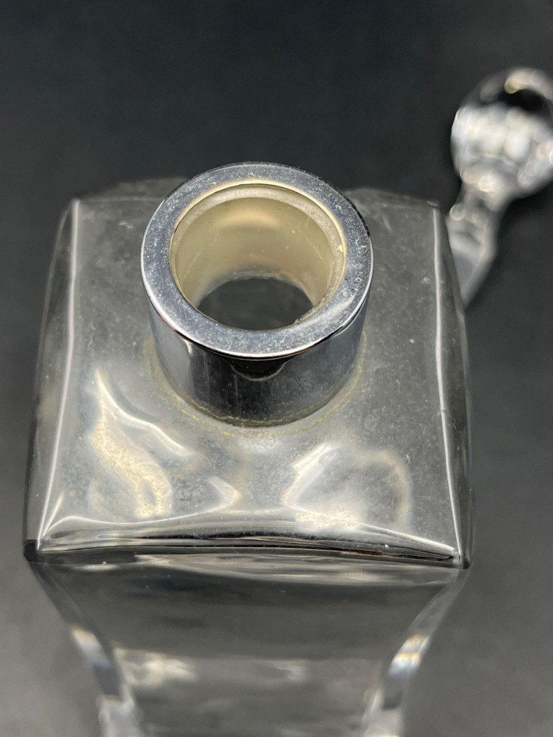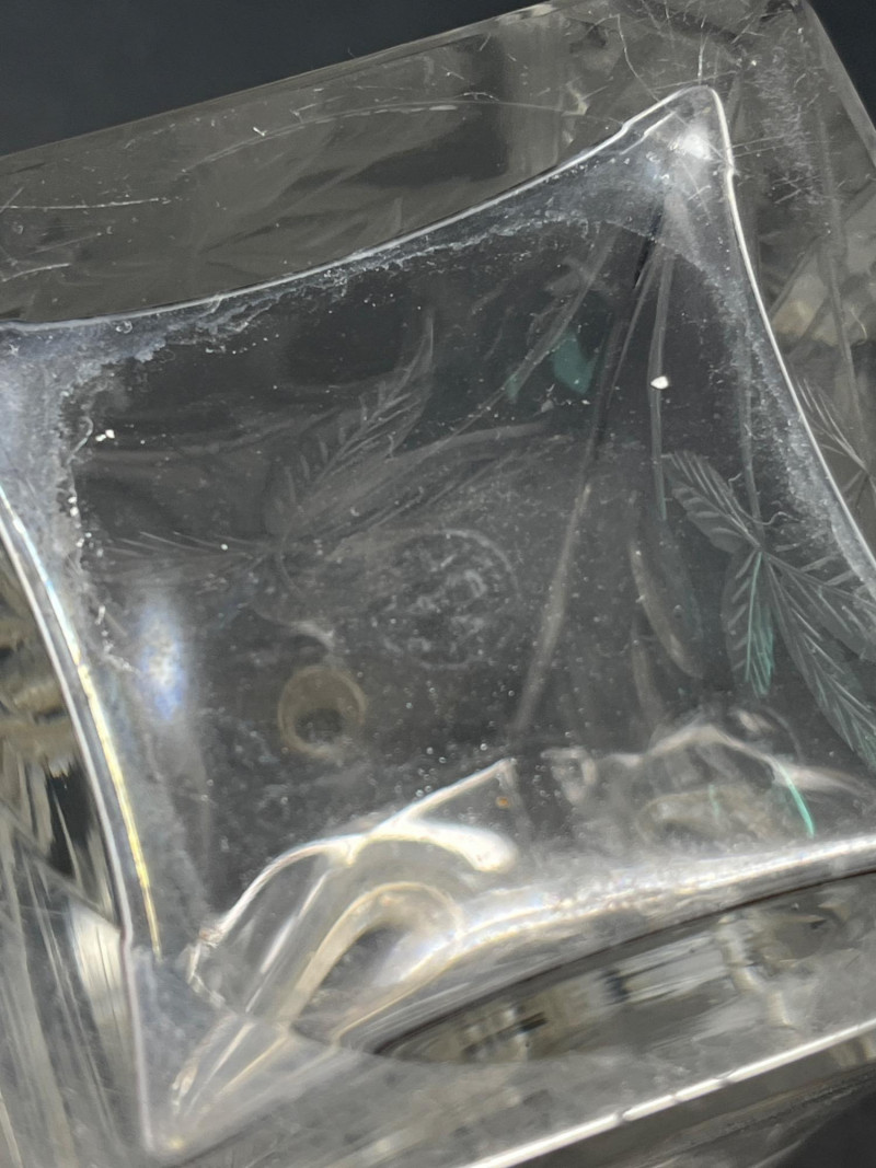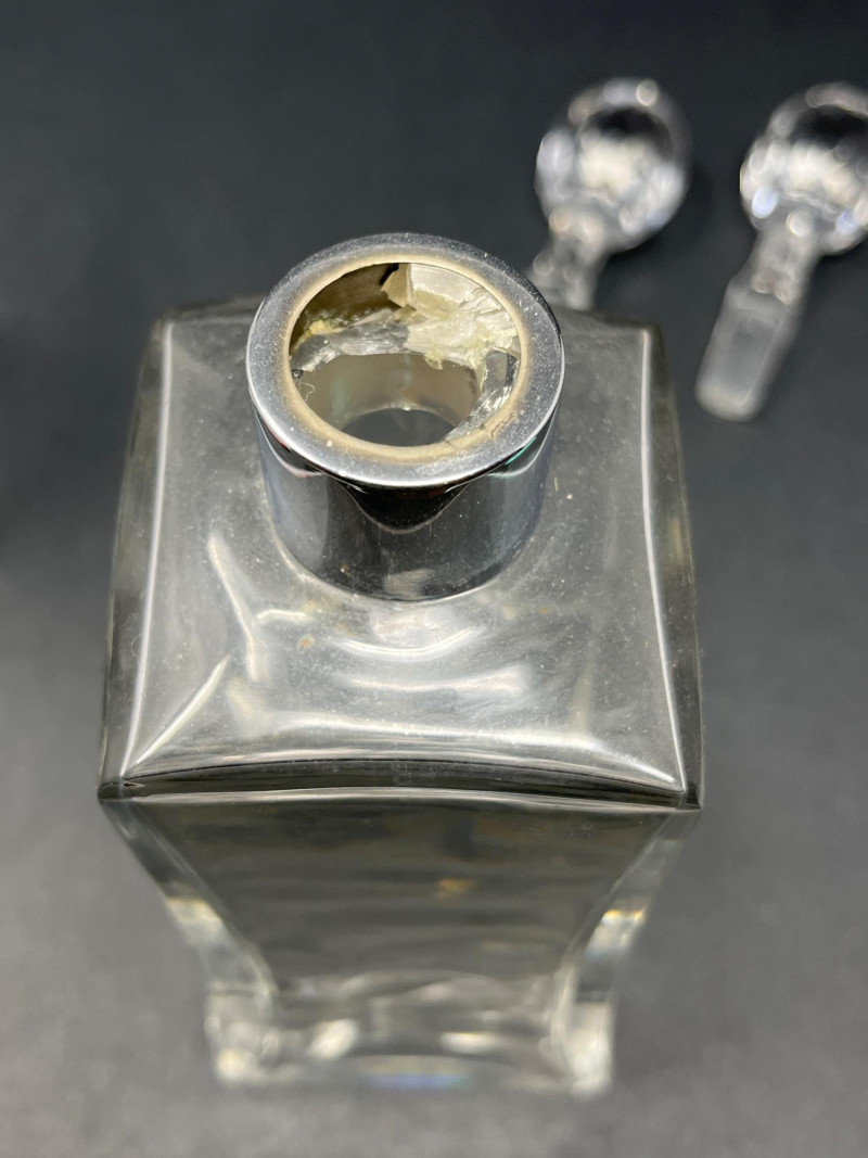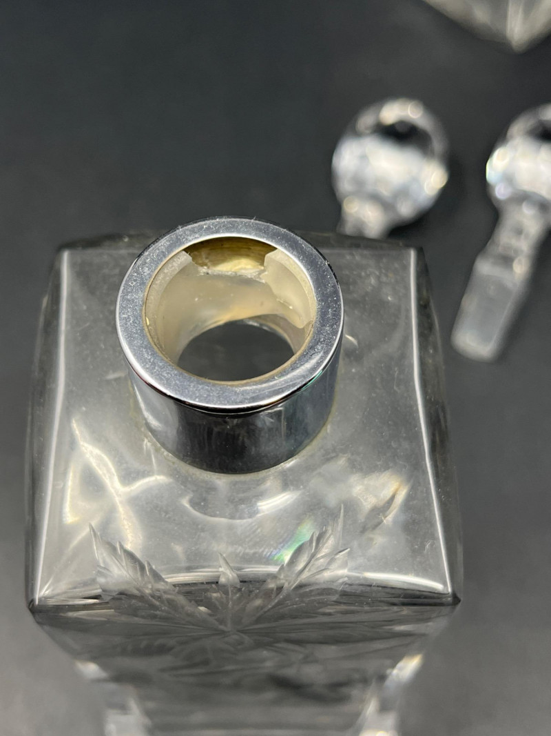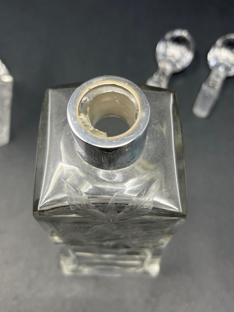 Pair of Baccarat Lead Crystal Decanters with Stoppers Pair of etched lead crystal decanters by Baccarat, each with a tapered square body and faceted stopper marked “B.” Decorated with engraved leaf and fruit motifs. Height with stoppers is approximately 10.5 inches. Note: both bottle openings show significant damage to the rims beneath the silver collars (see photos).