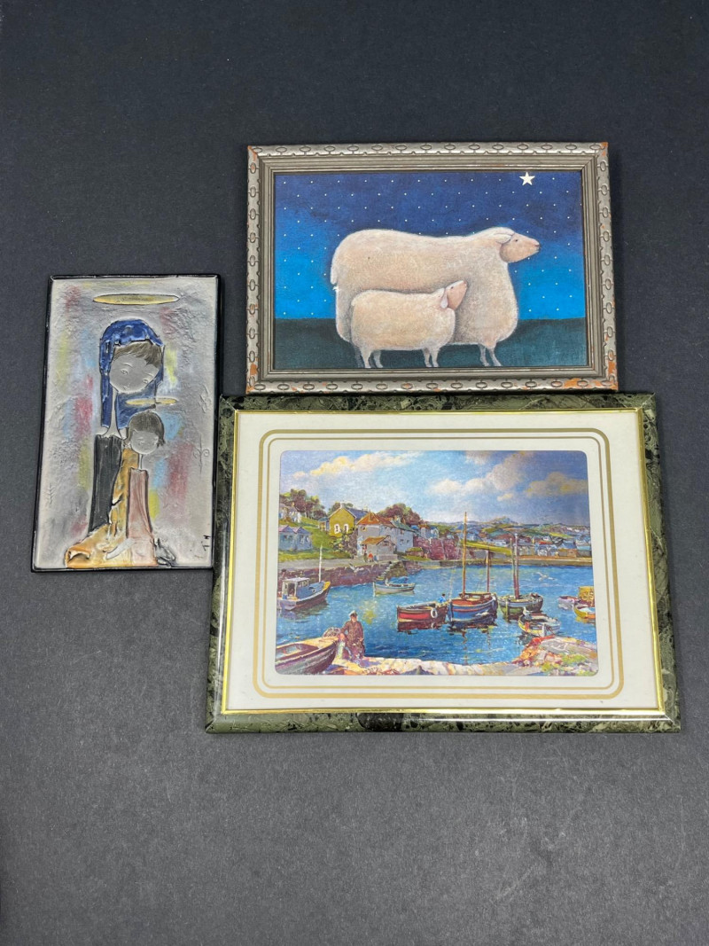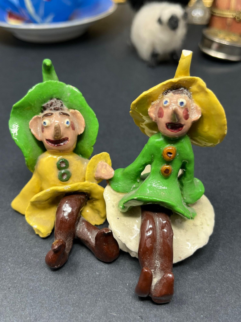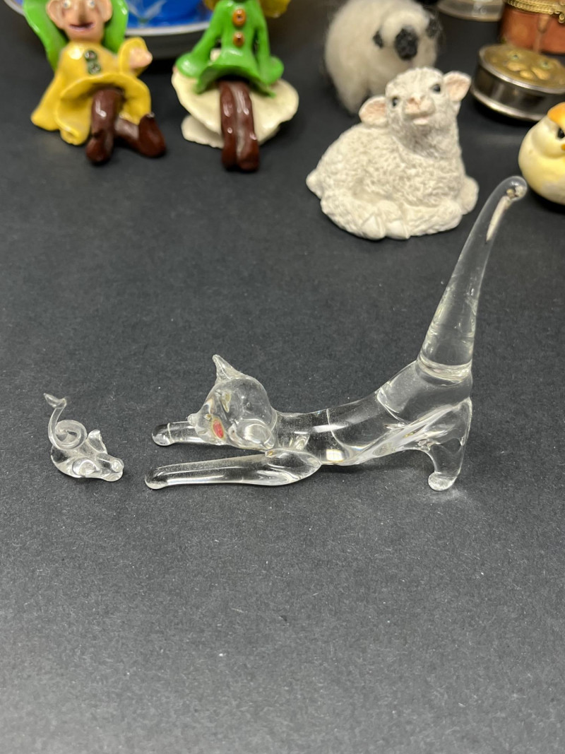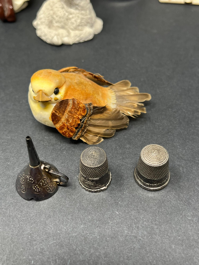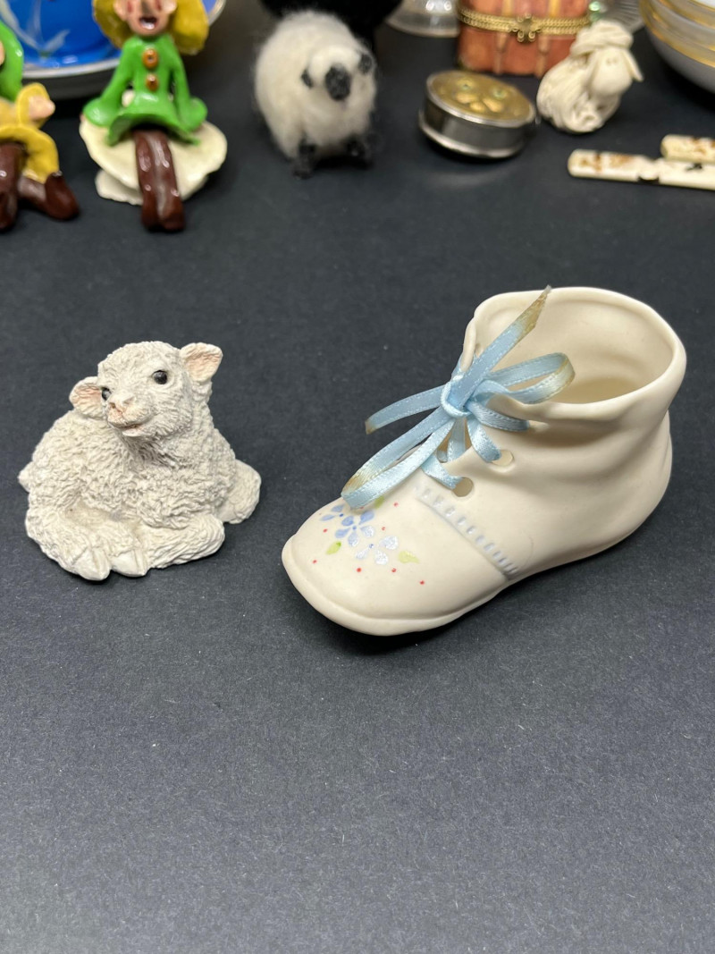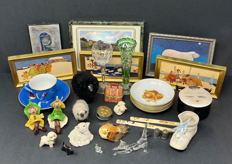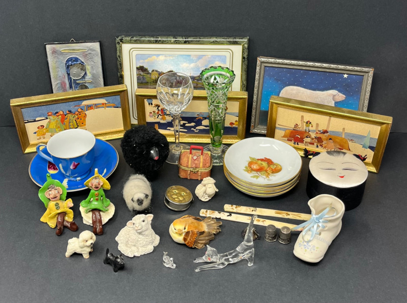 For the Love of All Things Miniature Lot This is a collection of miniature-themed decor and collectibles. Includes hand-painted framed prints (largest approx. 6.5" x 7.5"), figural ceramics, crystal and porcelain miniatures, and small dishware. Highlights include a 5.5" emerald green cut-to-clear vase, a blue tulip demitasse cup and saucer, ceramic figurines, vintage thimbles, chopsticks, and a porcelain baby bootie.