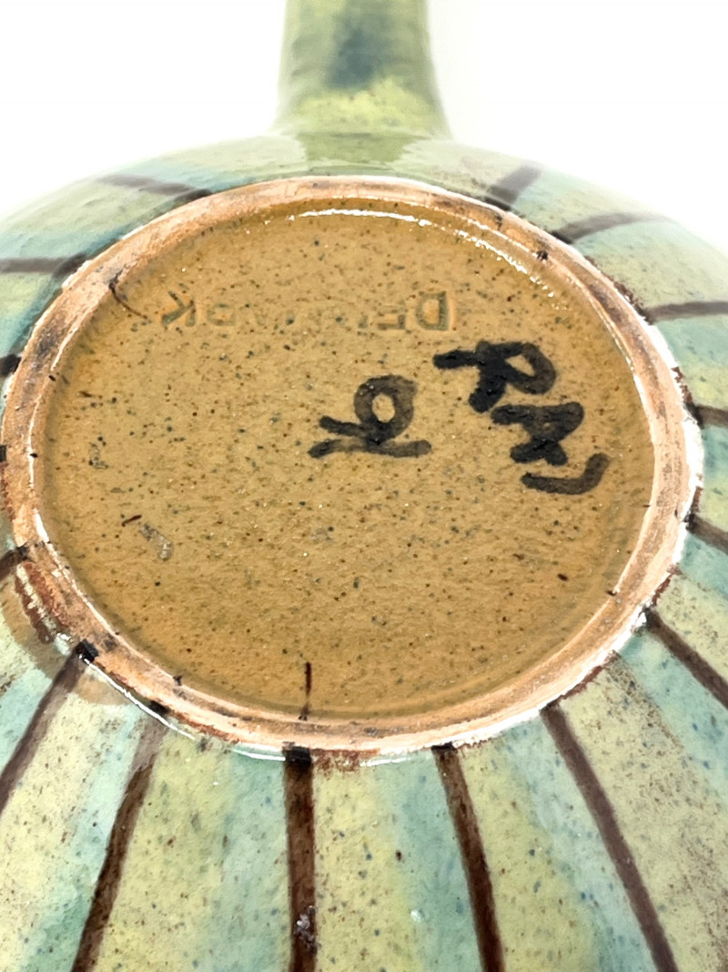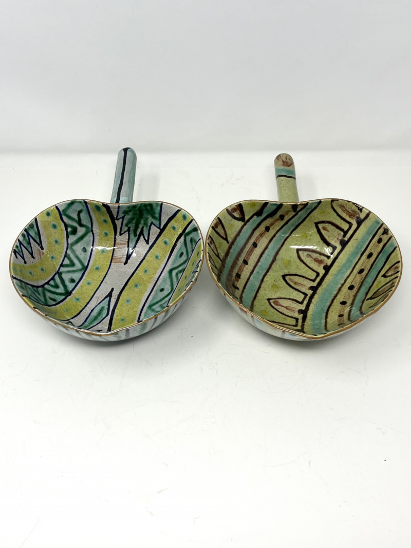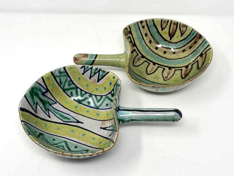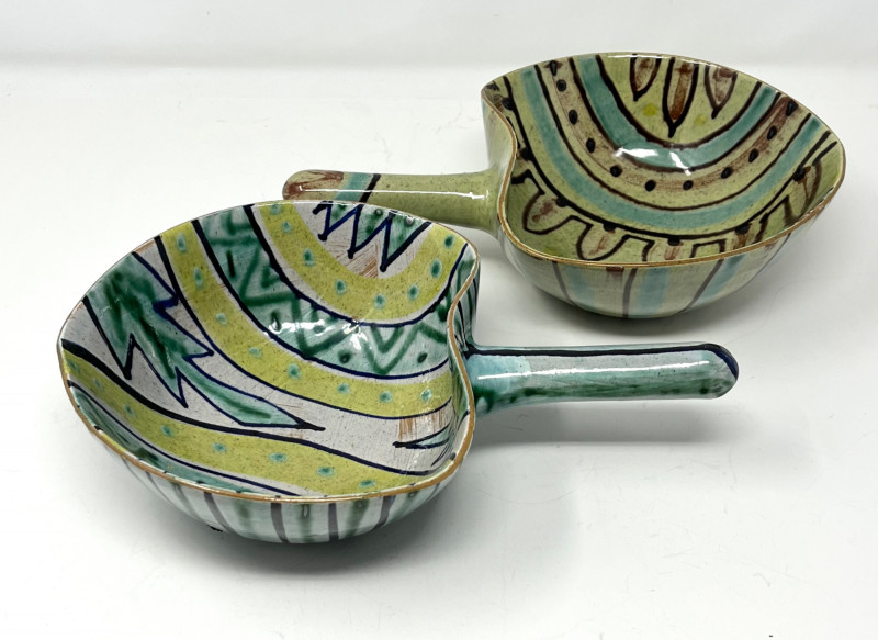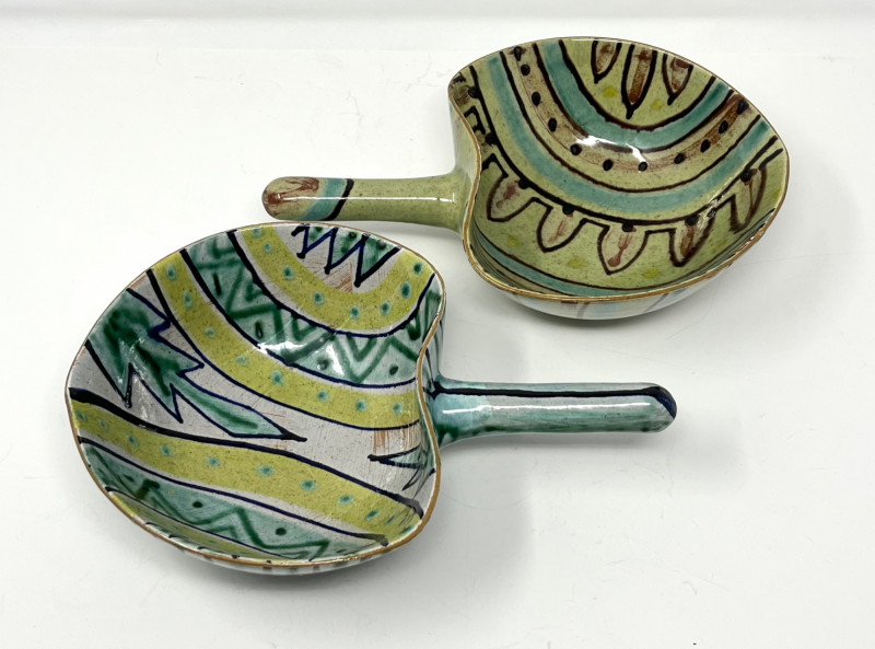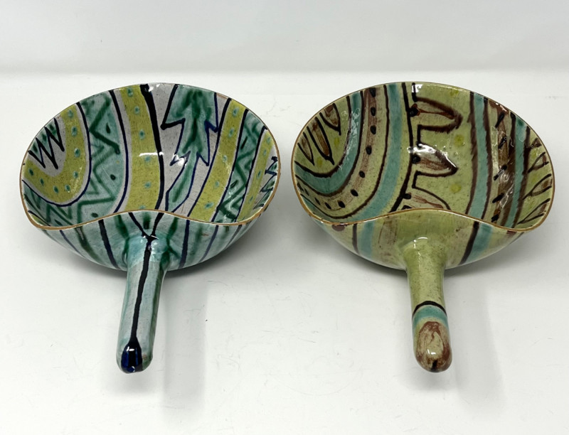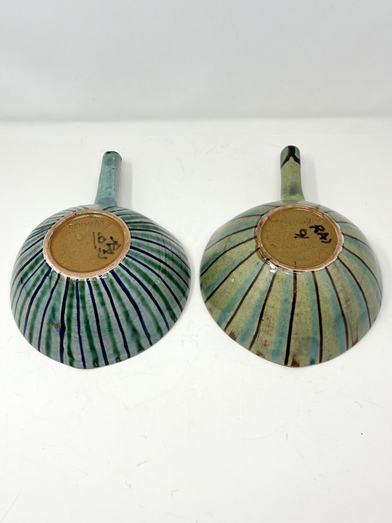 Pair of Danish Hand-Painted Stoneware Bowls with Handles Pair of handmade and hand-painted stoneware bowls from Denmark. Each bowl features abstract motifs in green, yellow, blue, and brown, with pierced detailing near the rim and an extended glazed handle. Marked "DENMARK" on the underside with additional artist markings. Each bowl measures approximately 6.75" wide, 3" high, and 9.5" long including the handle (6" without the handle).
