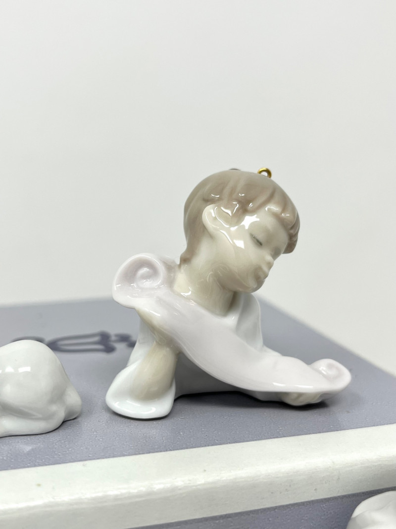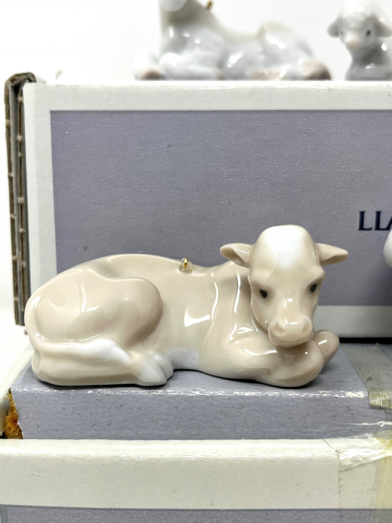 Lladro Nativity Ornament Figurines with Boxes Set of six porcelain nativity ornaments by Lladro, including children, a lamb, a calf, and a donkey. Each piece has a hanging loop and is glazed in pastel tones. Sizes range from approximately 0.5" to 2.75" tall. All are marked on the base and come with the original Lladro boxes.