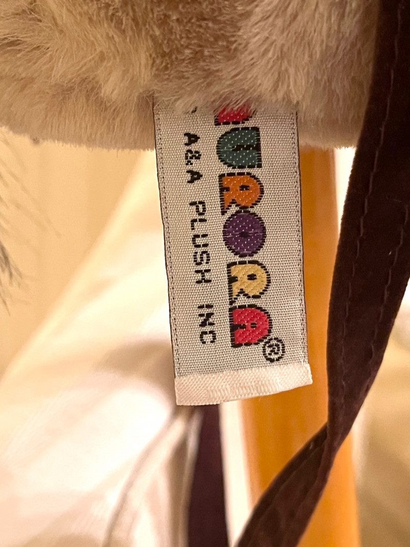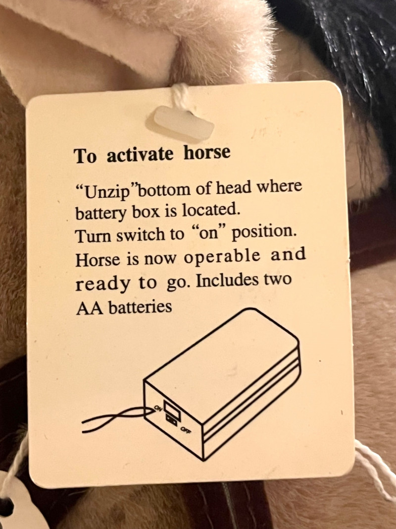 Aurora Plush Musical Hobby Horse Plush hobby horse by Aurora, approximately 37" tall. Features a brown and cream head with black mane and stitched reins. Includes a sound feature intended to play music when activated, powered by two AA batteries. Switch is located inside a zippered section at the bottom of the head. Functionality untested.
